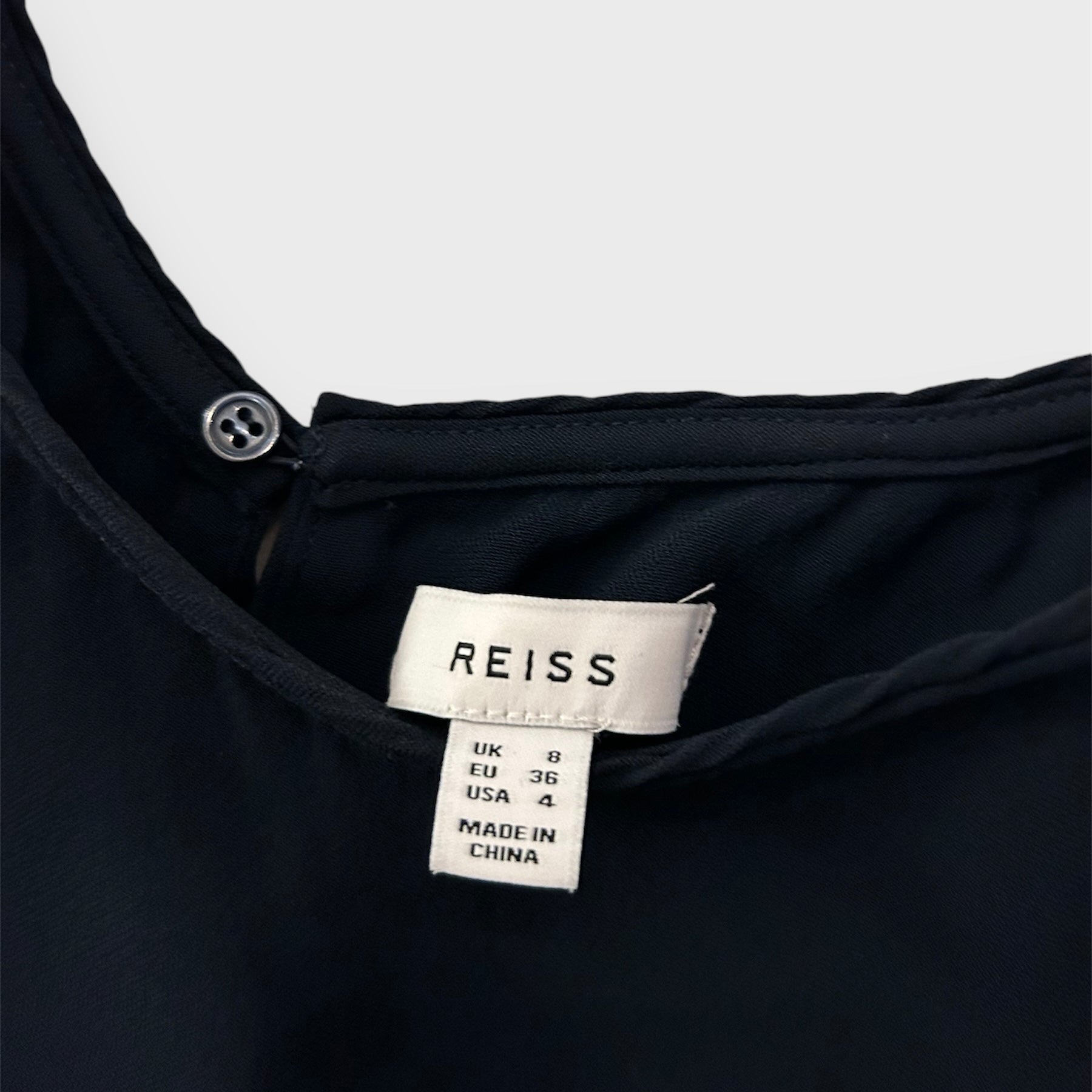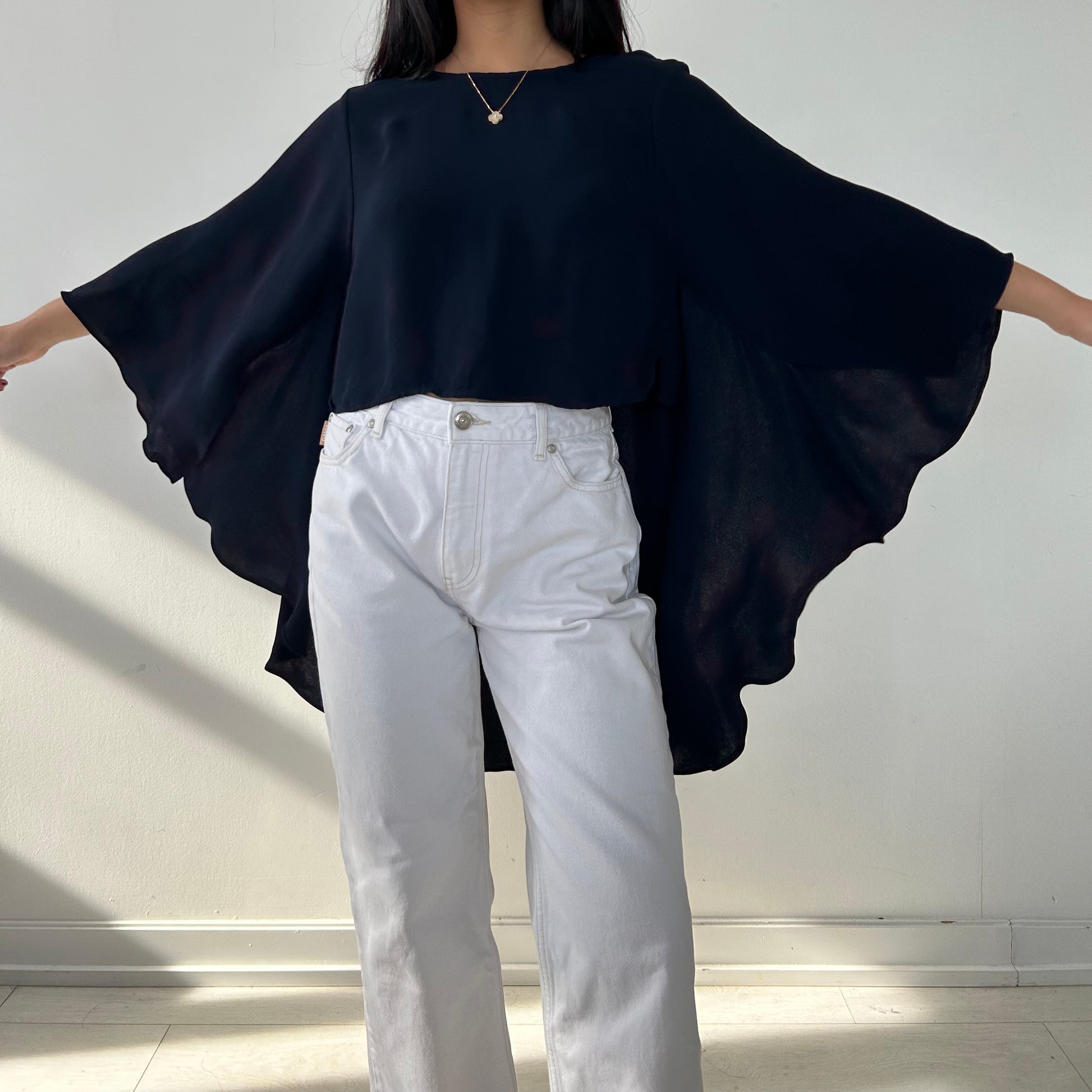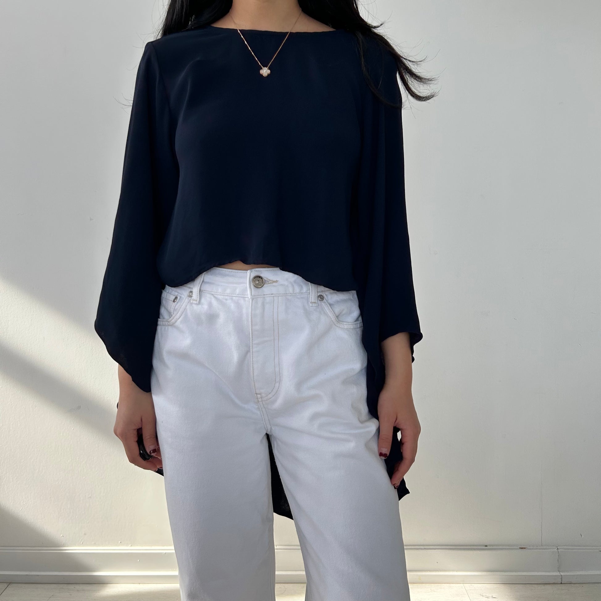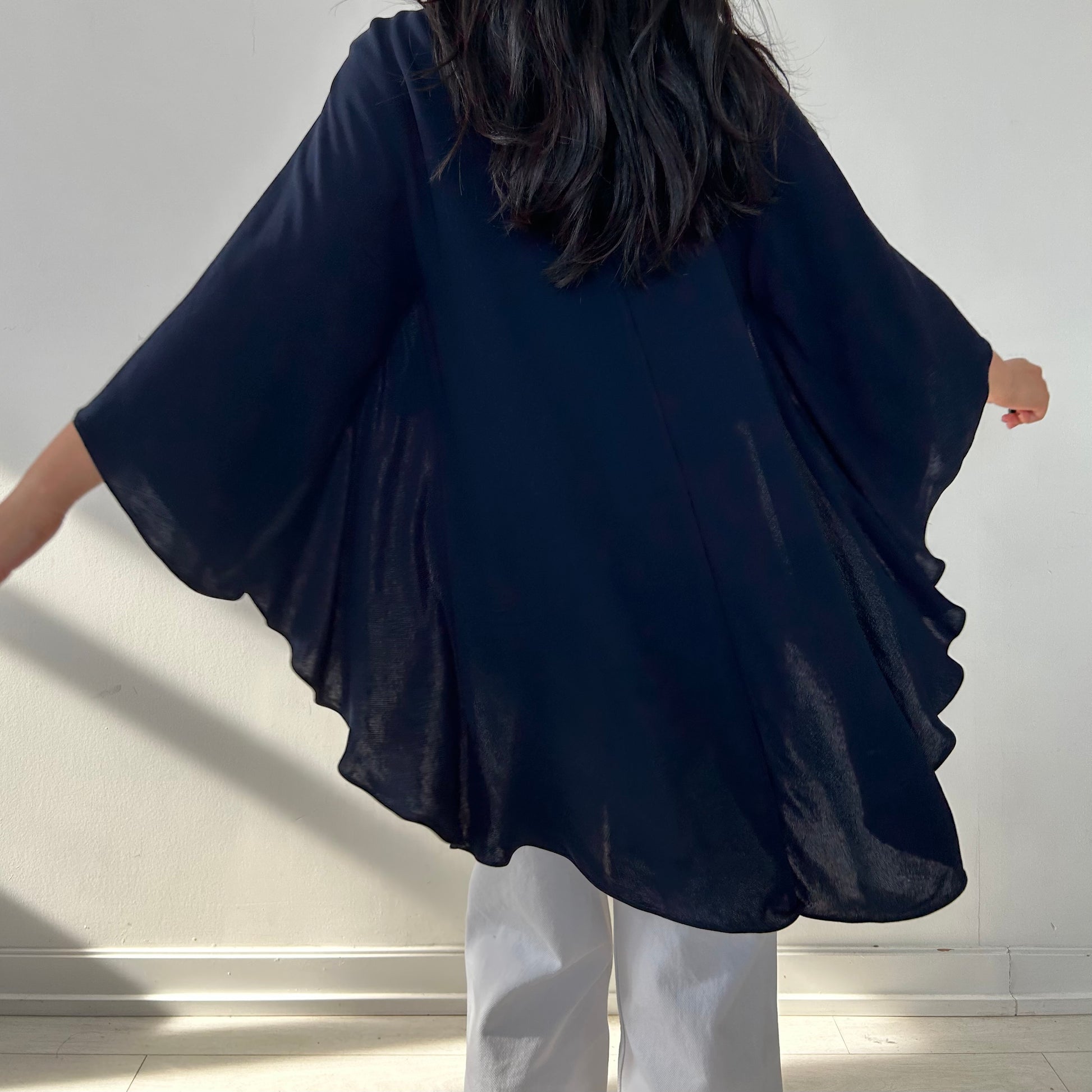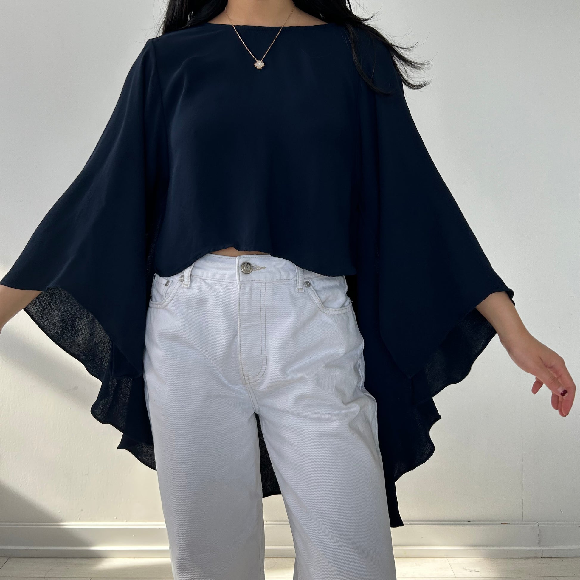 - Details: The Liana cape; navy blouse with crew neckline; cape element; boxy fit; high-low hemline; short sleeves