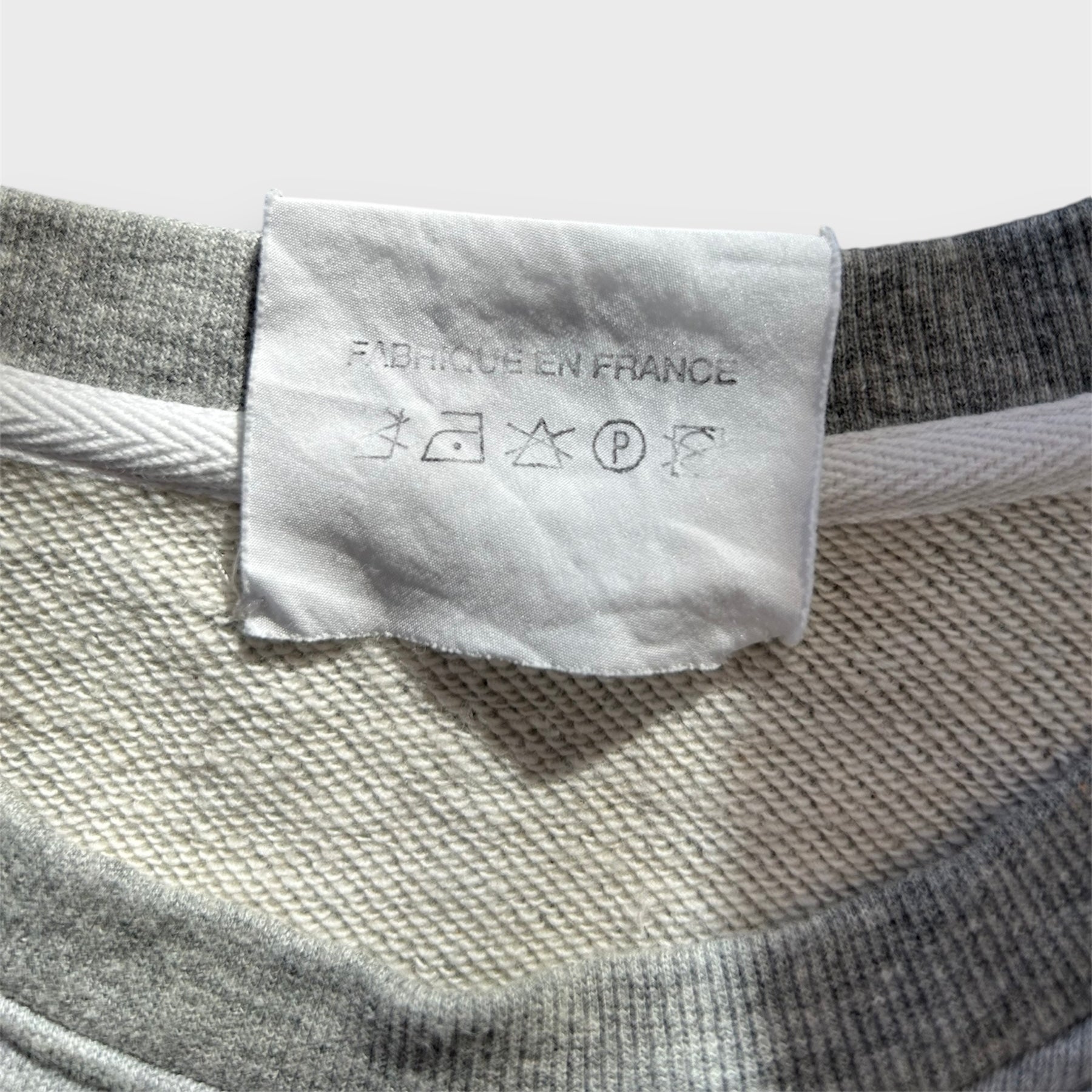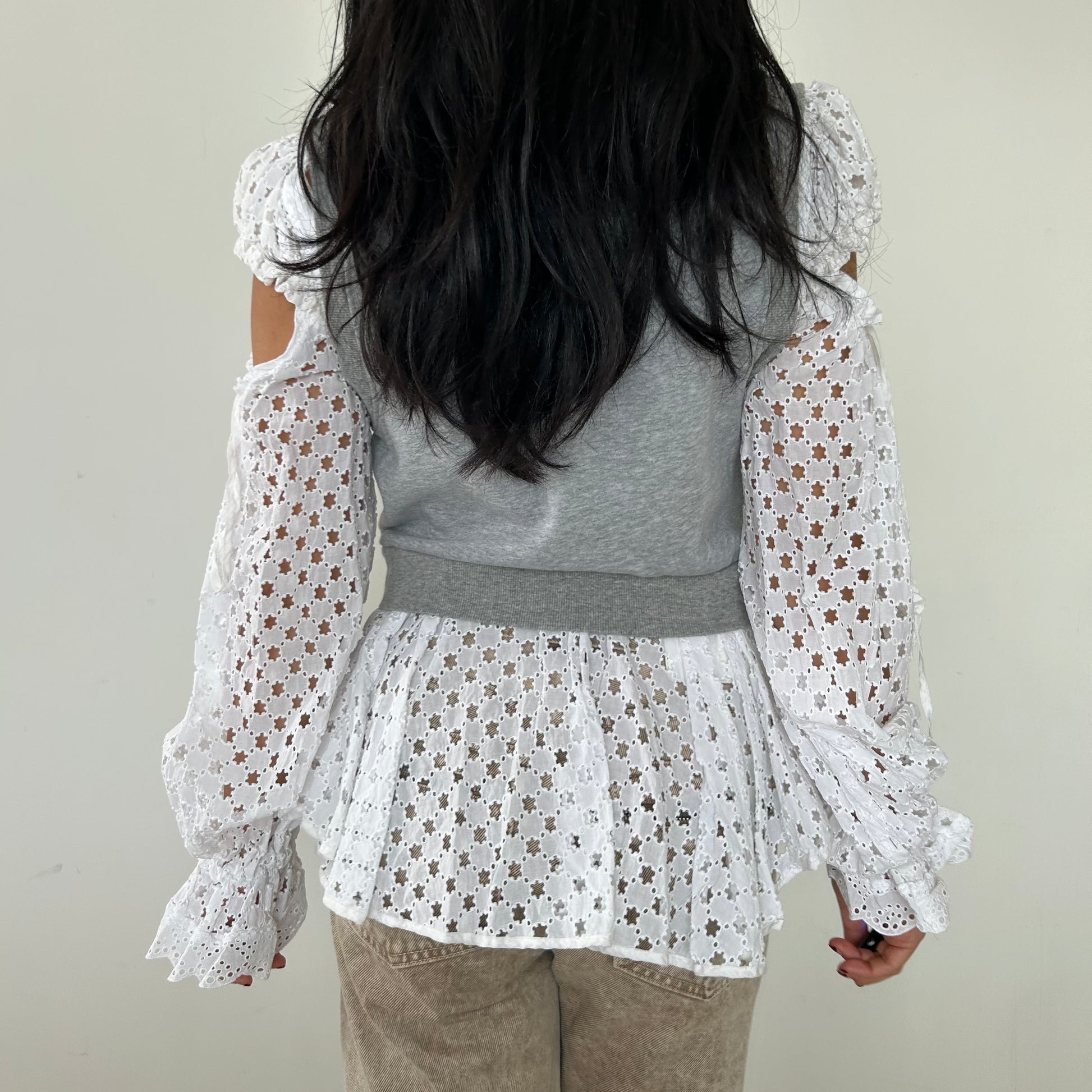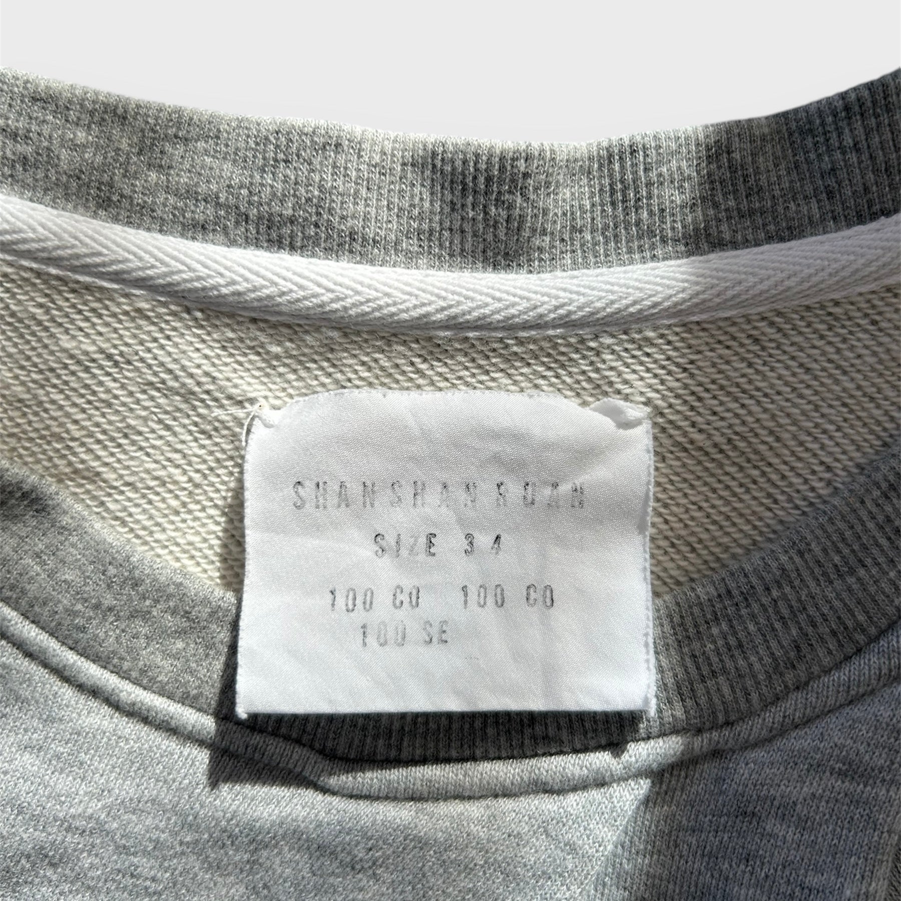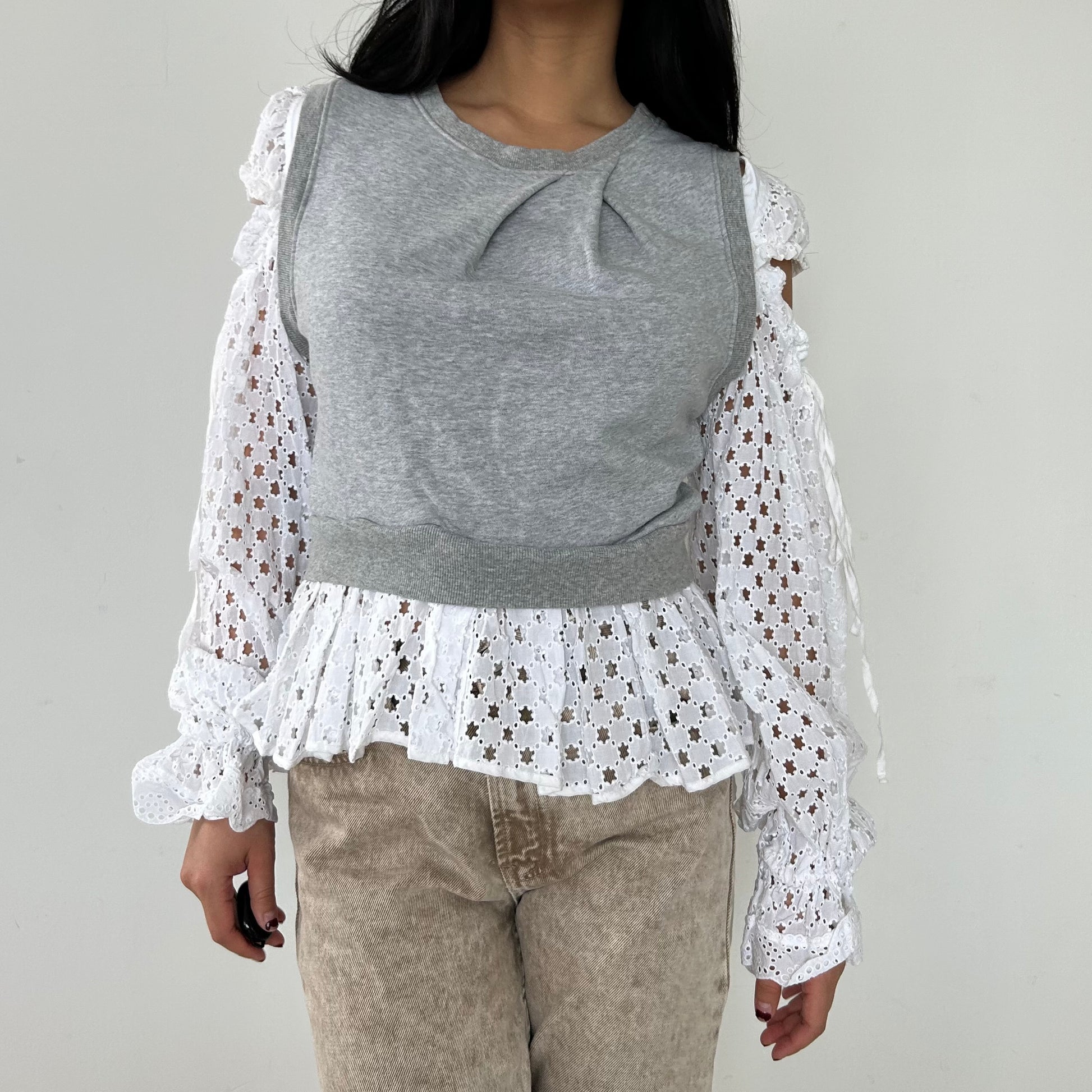 - Details: RRP $840 CAD; relaxed-fit; bi-fabric grey and white top; ribbed knit crew neck collar and hem with folded body detail; contrast fabric open-shoulder sleeves with adjustable drawstring; removable sleeves via button attachment; pleated contrast fabric lower attachment
