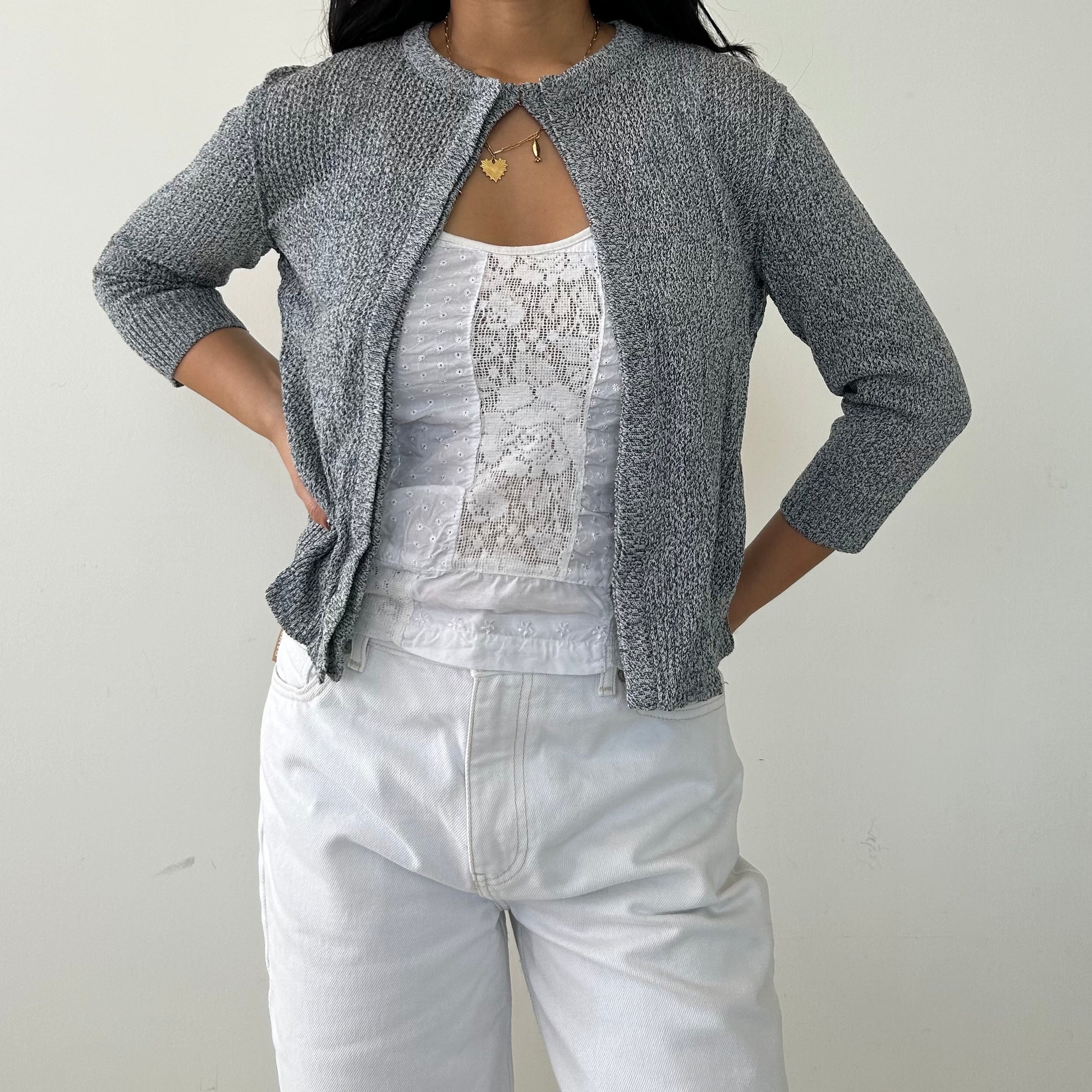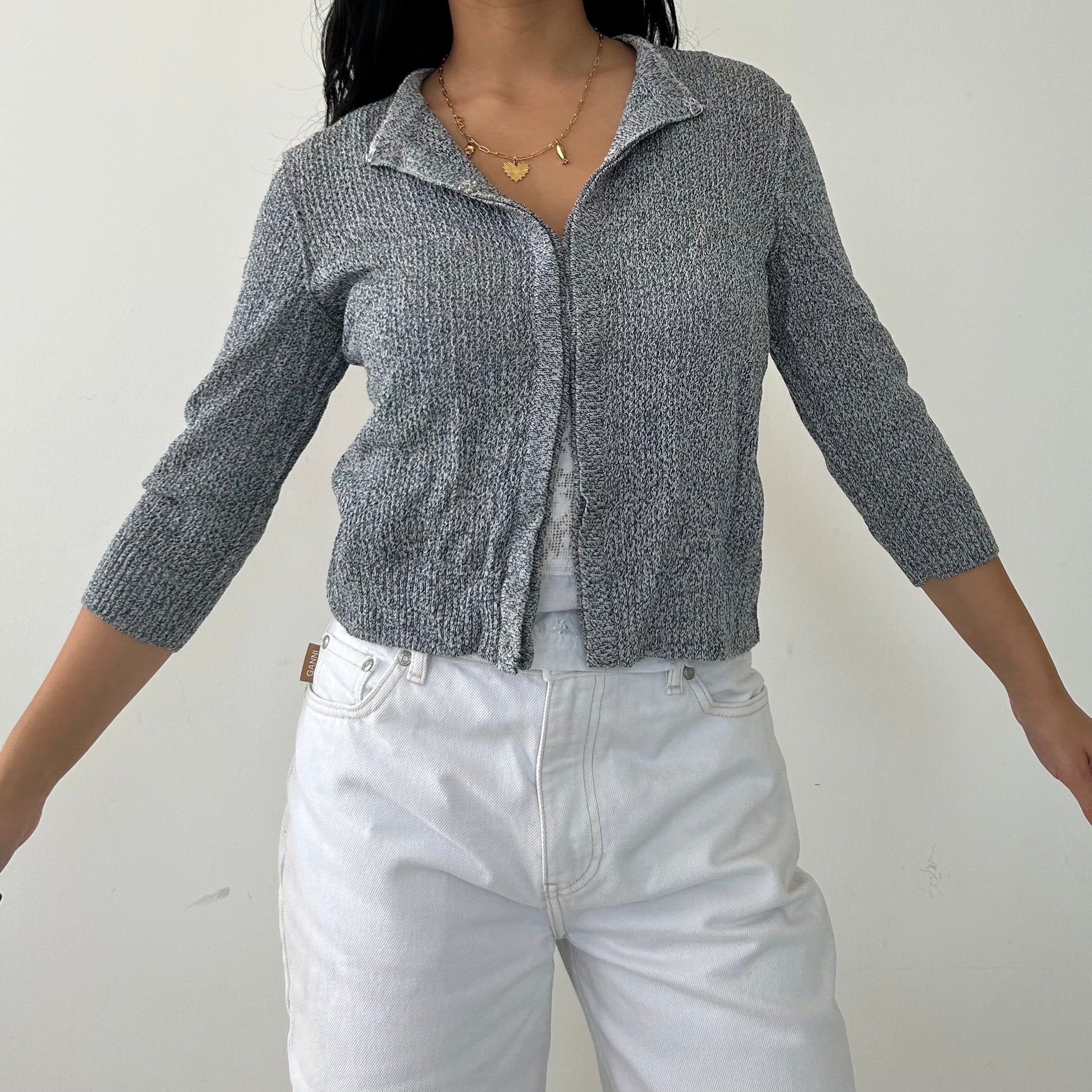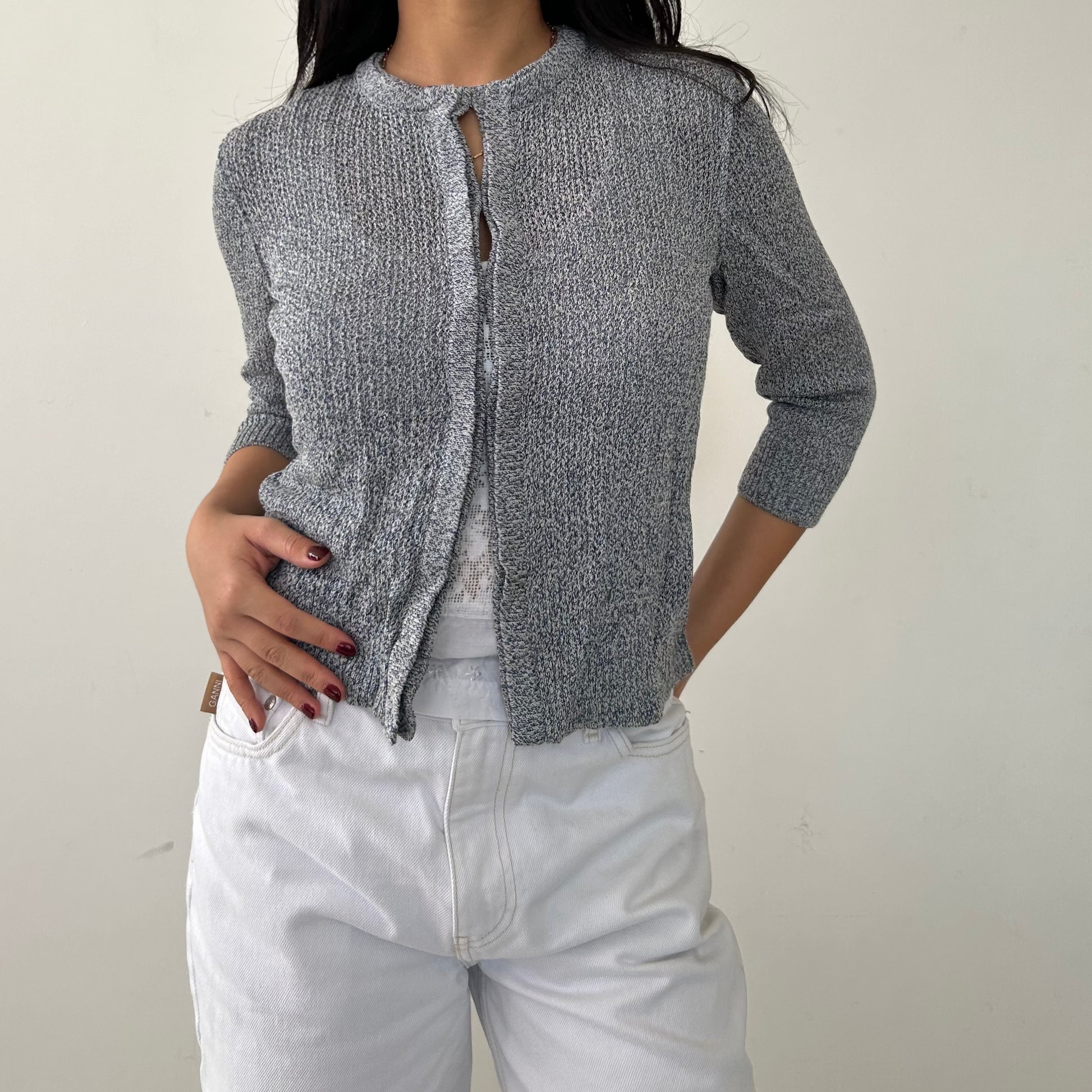 - Details: Blue and white crewneck knit cardigan; 3/4 sleeves; hook-and-eye closure