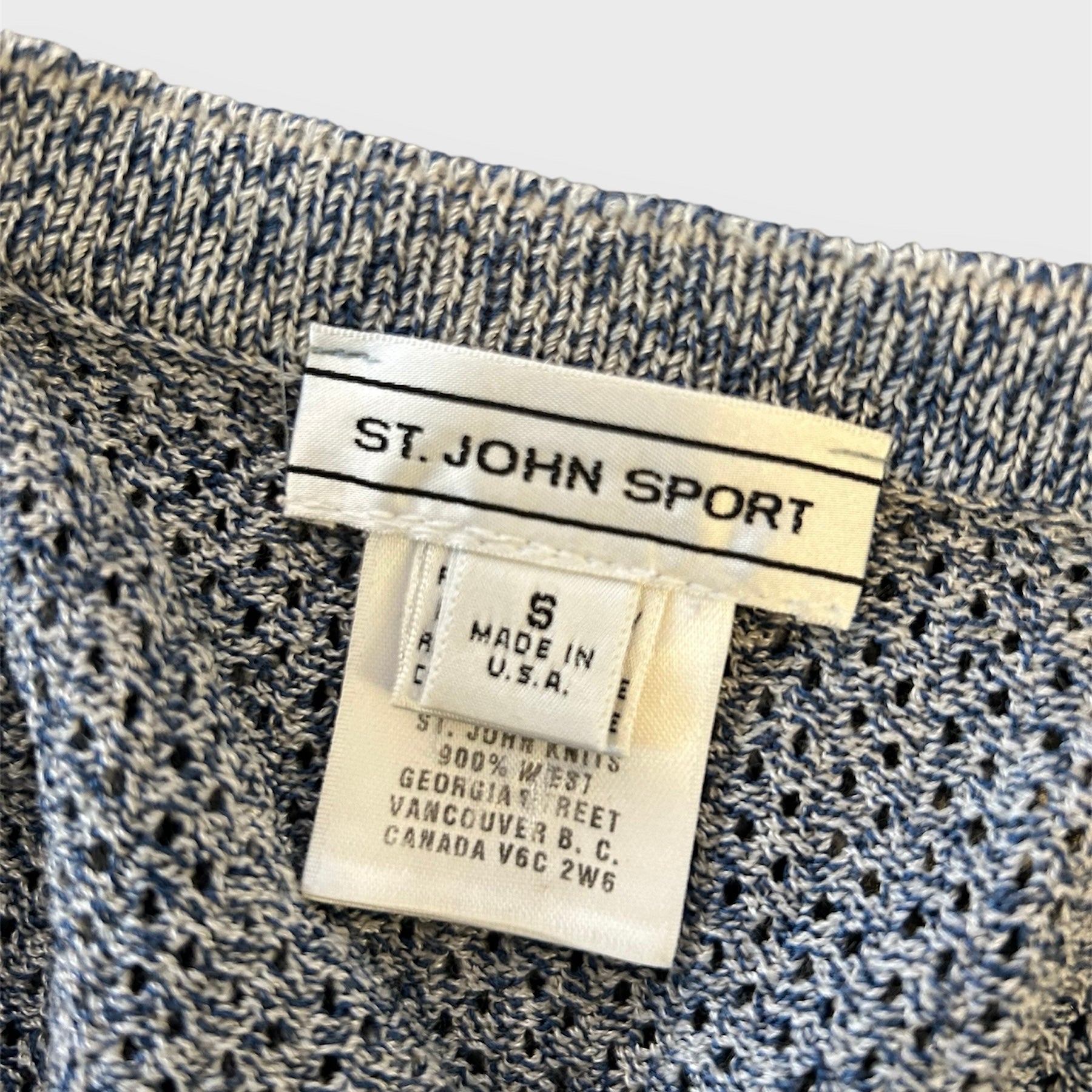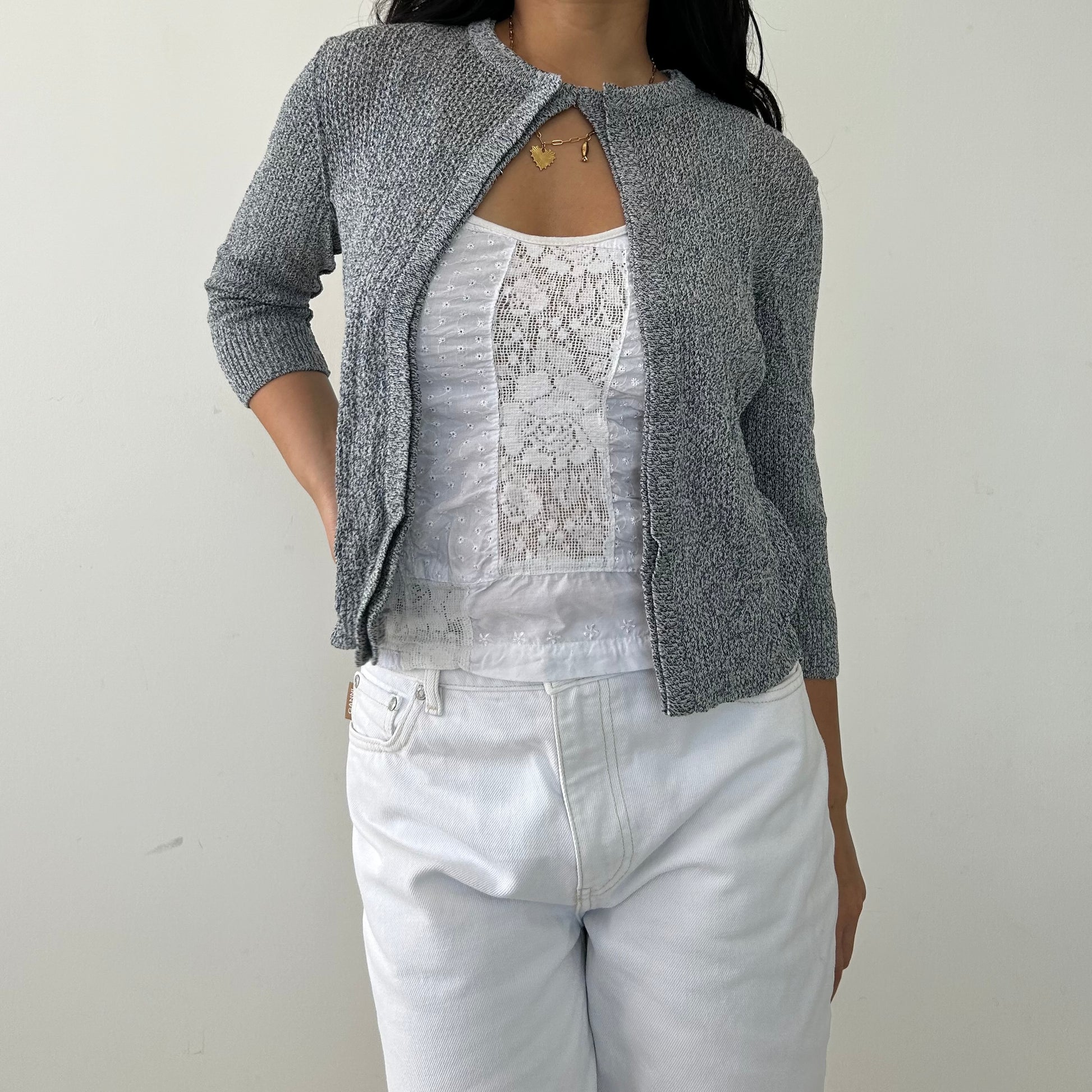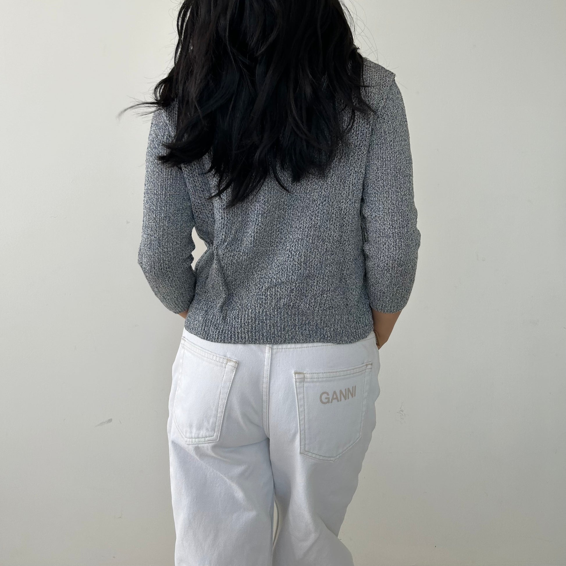 - Details: Blue and white crewneck knit cardigan; 3/4 sleeves; hook-and-eye closure