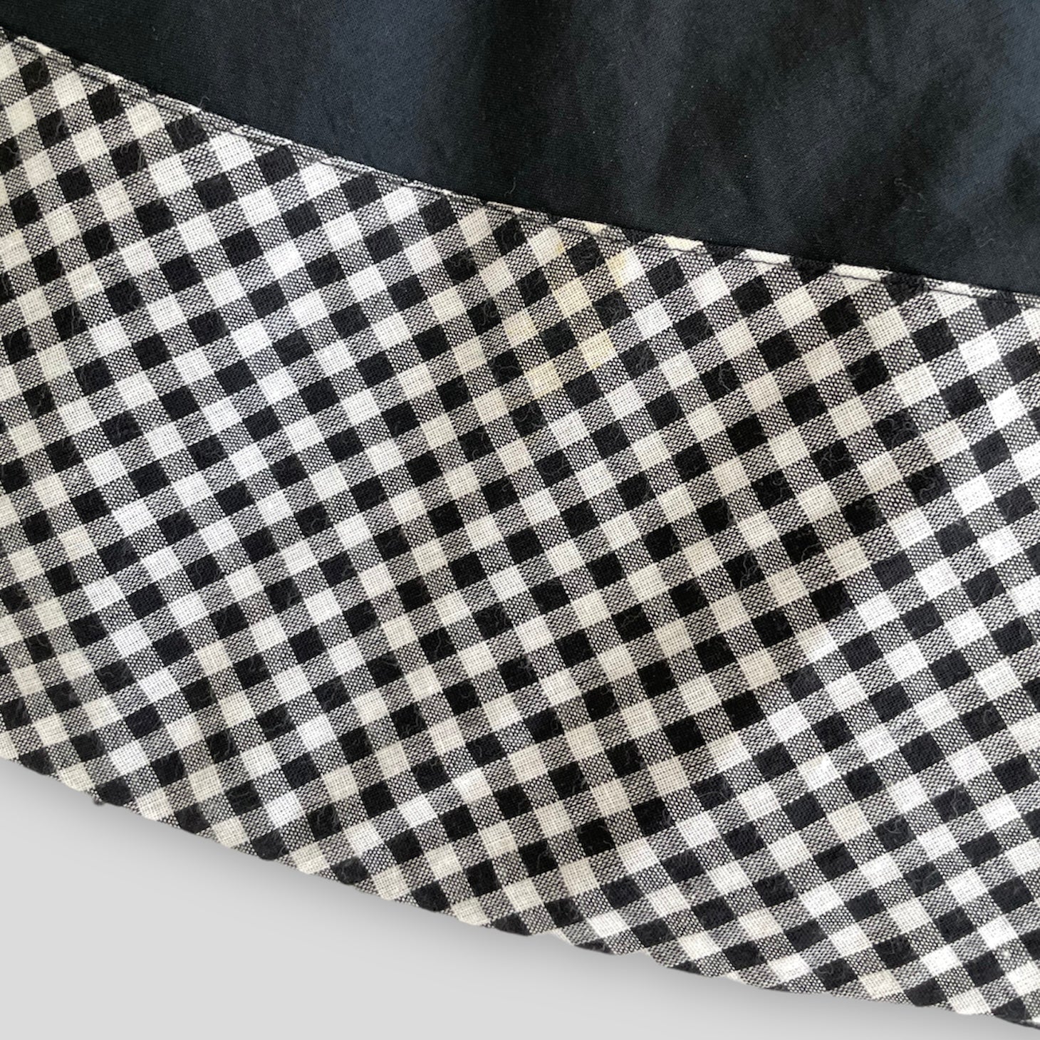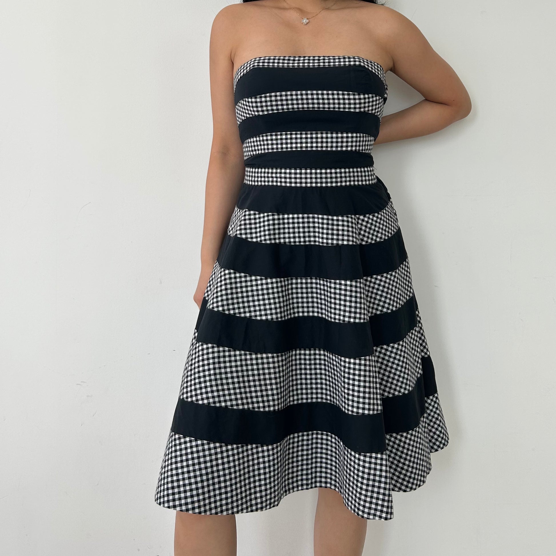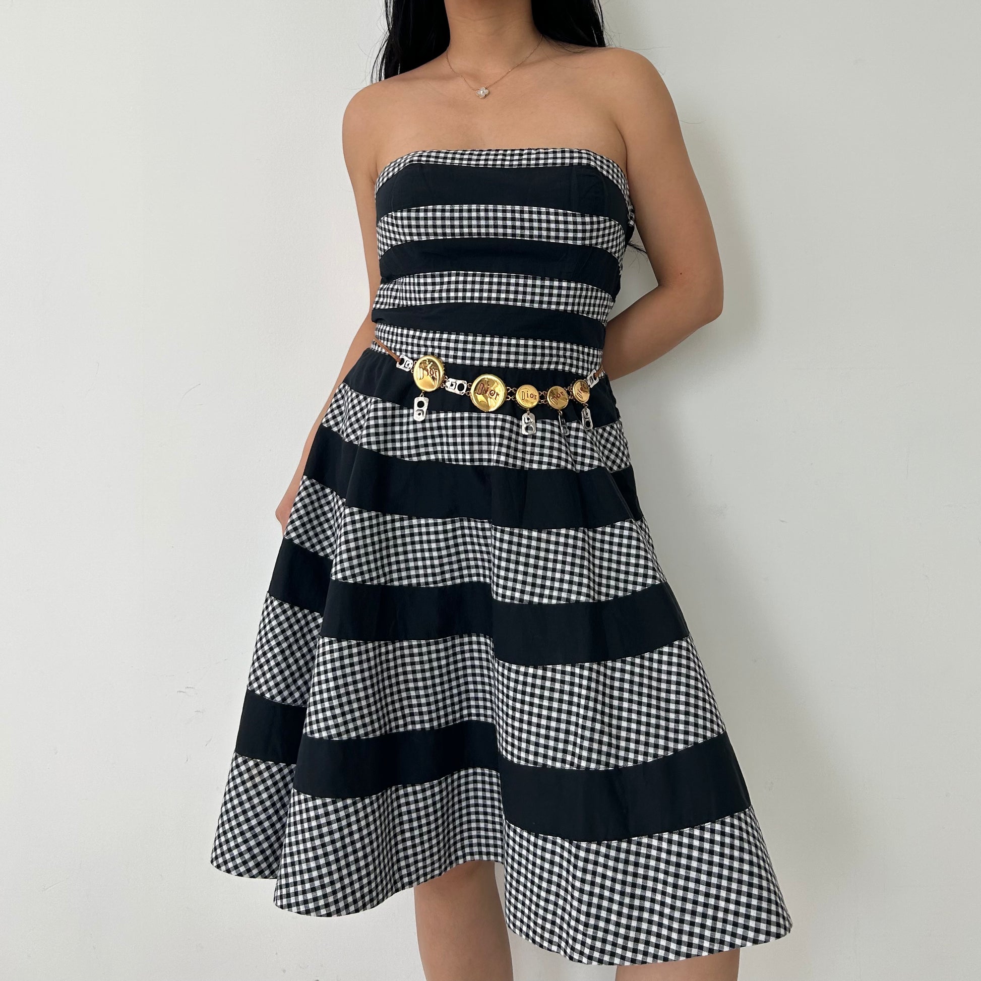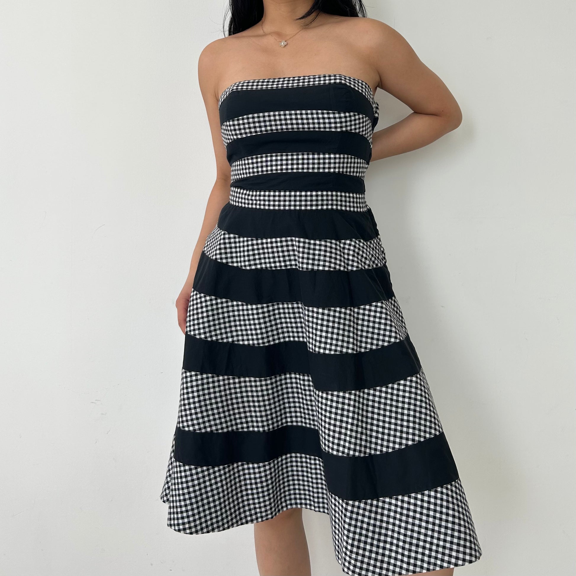 - Details: Black and white gingham print; black horizontal stripes; tulle underskirt; fit and flare dress; 4 layer skirt; concealed side zip; fabric button details on the back