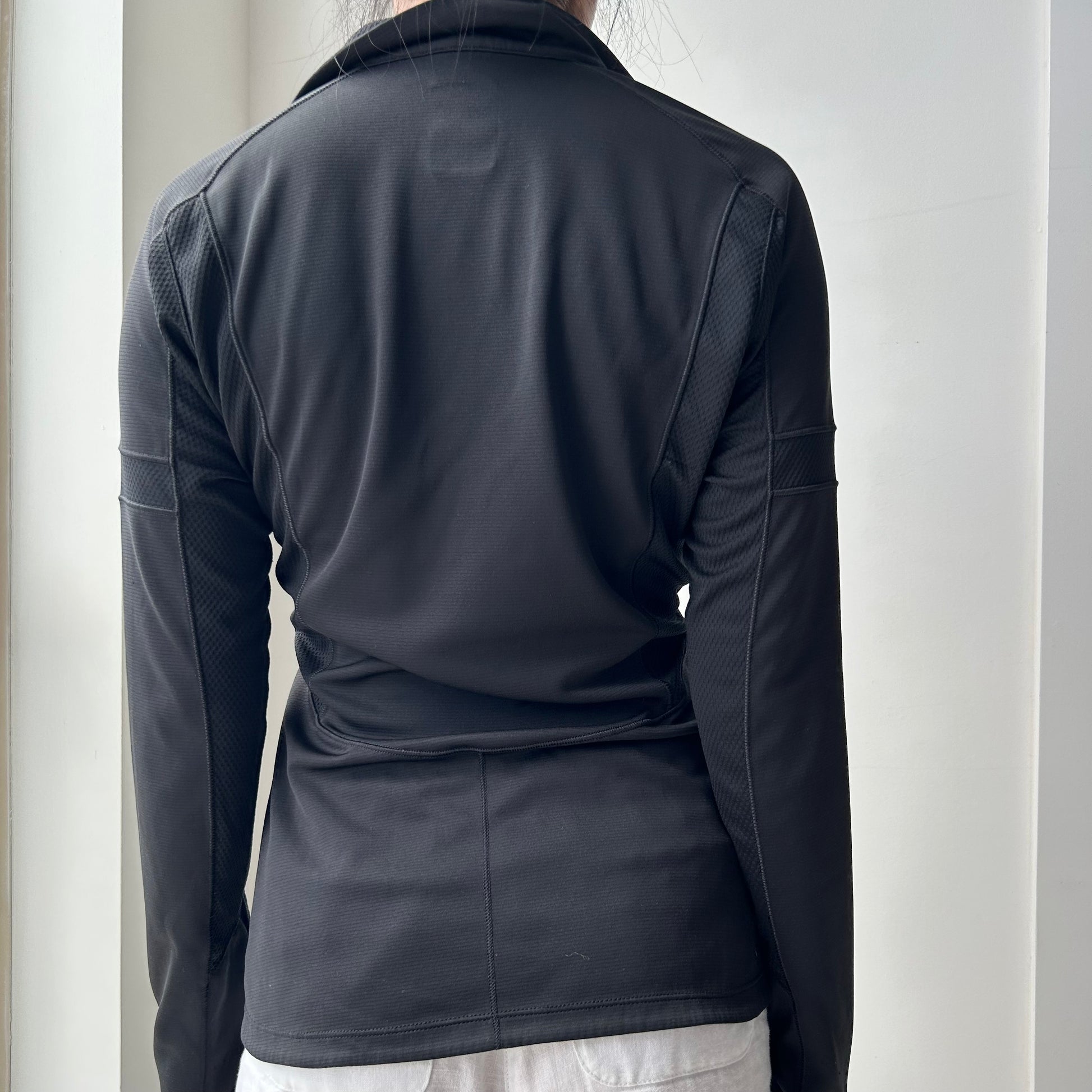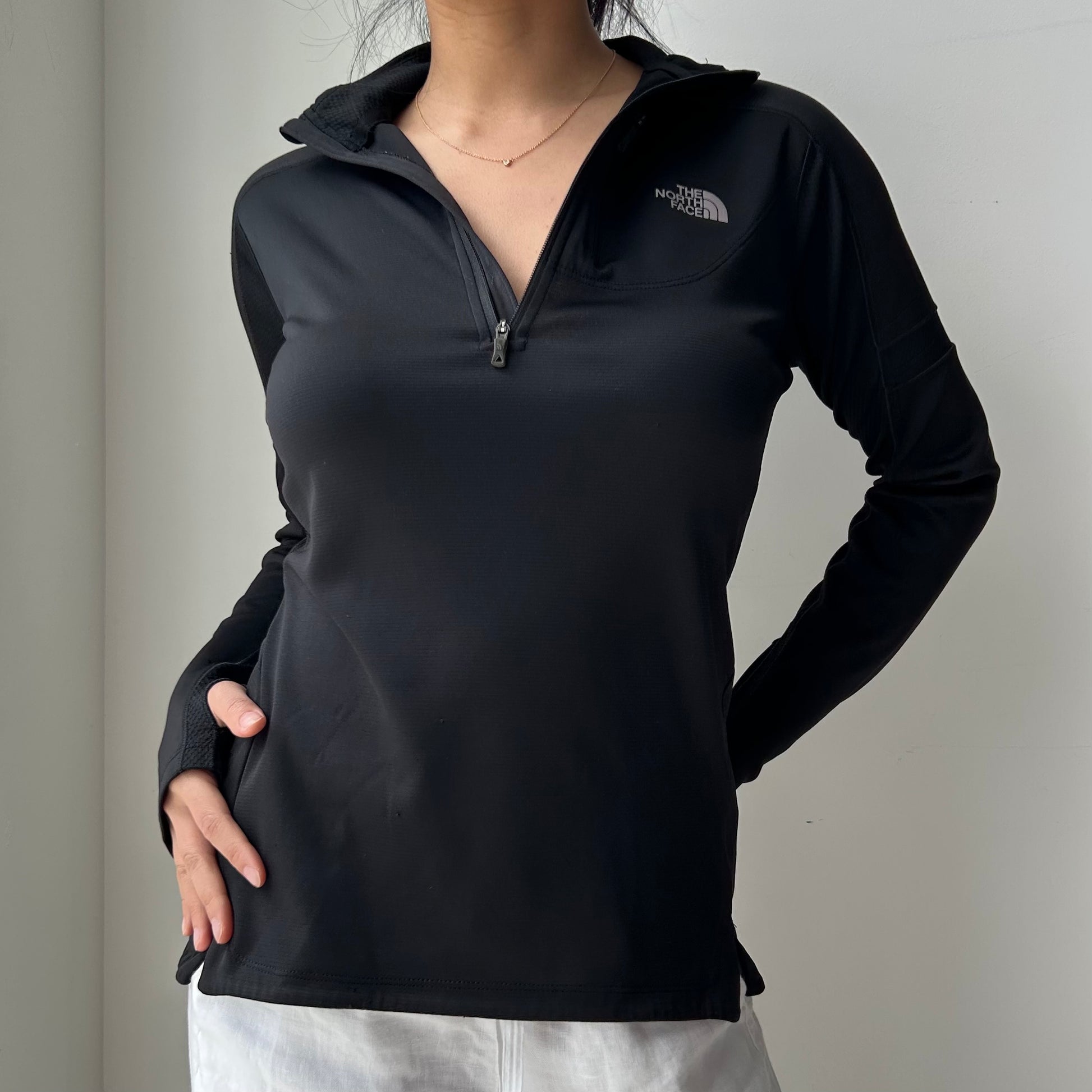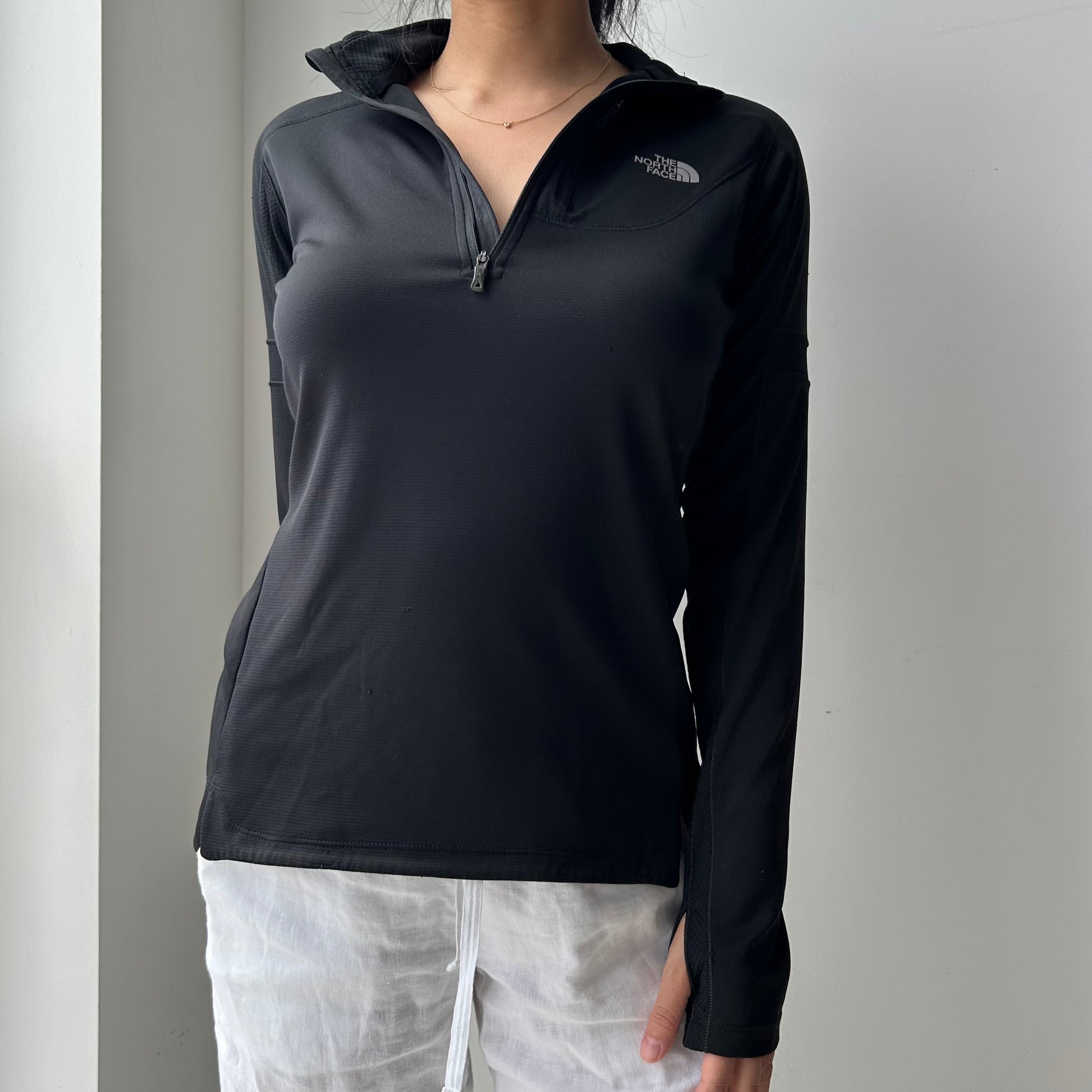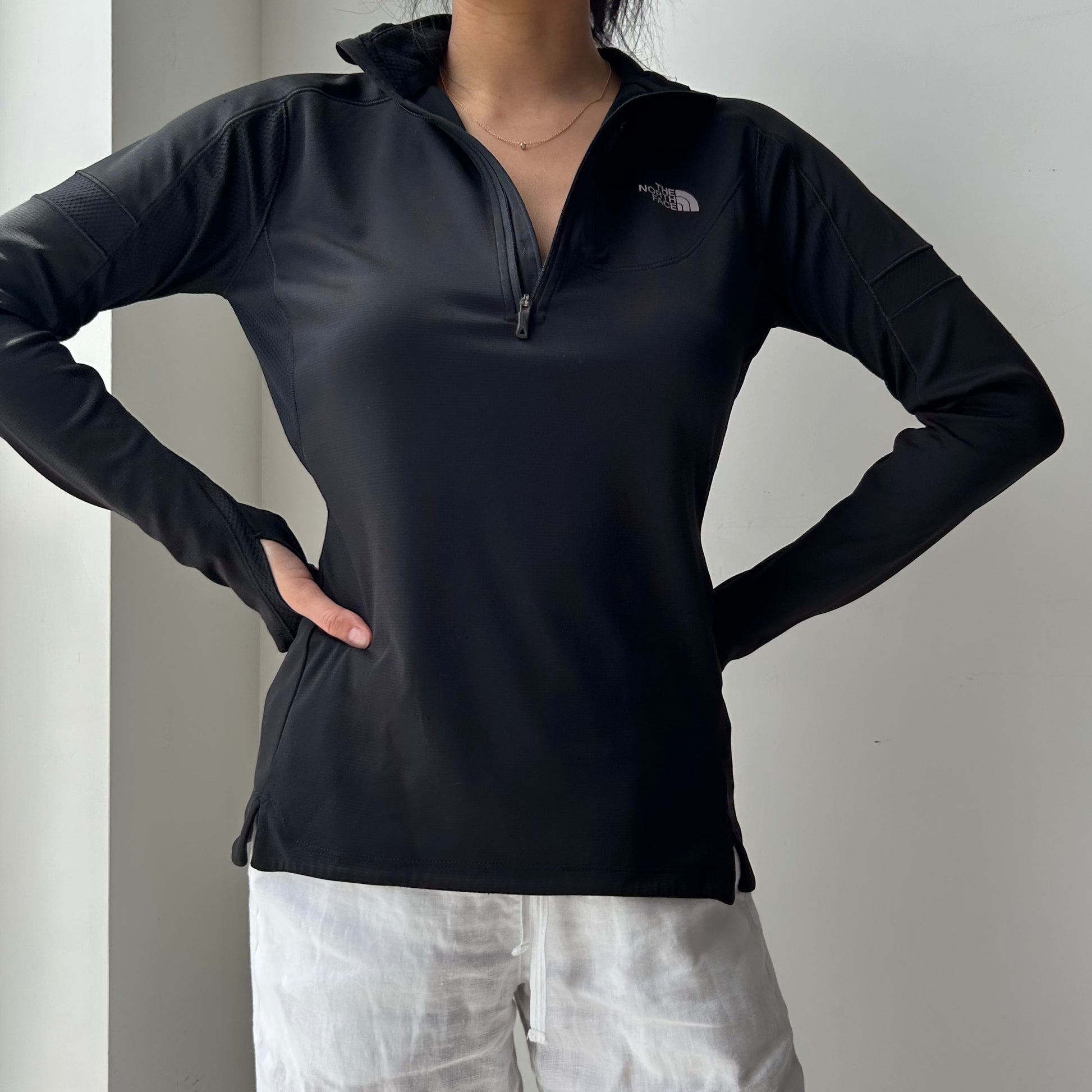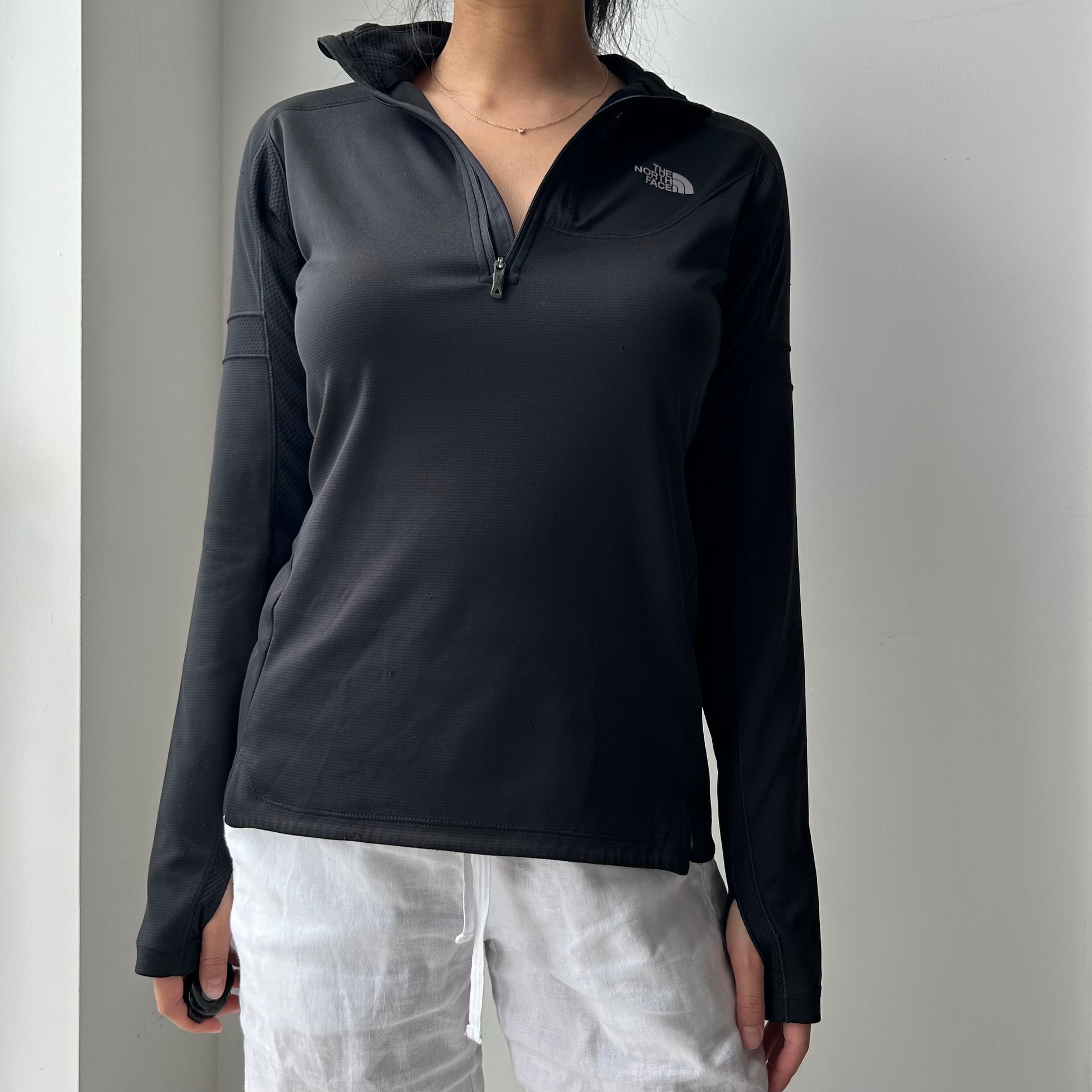 - Details: Black lightweight long sleeve quarter zip pullover; 'The North Face' logo on left chest; thumbholes
