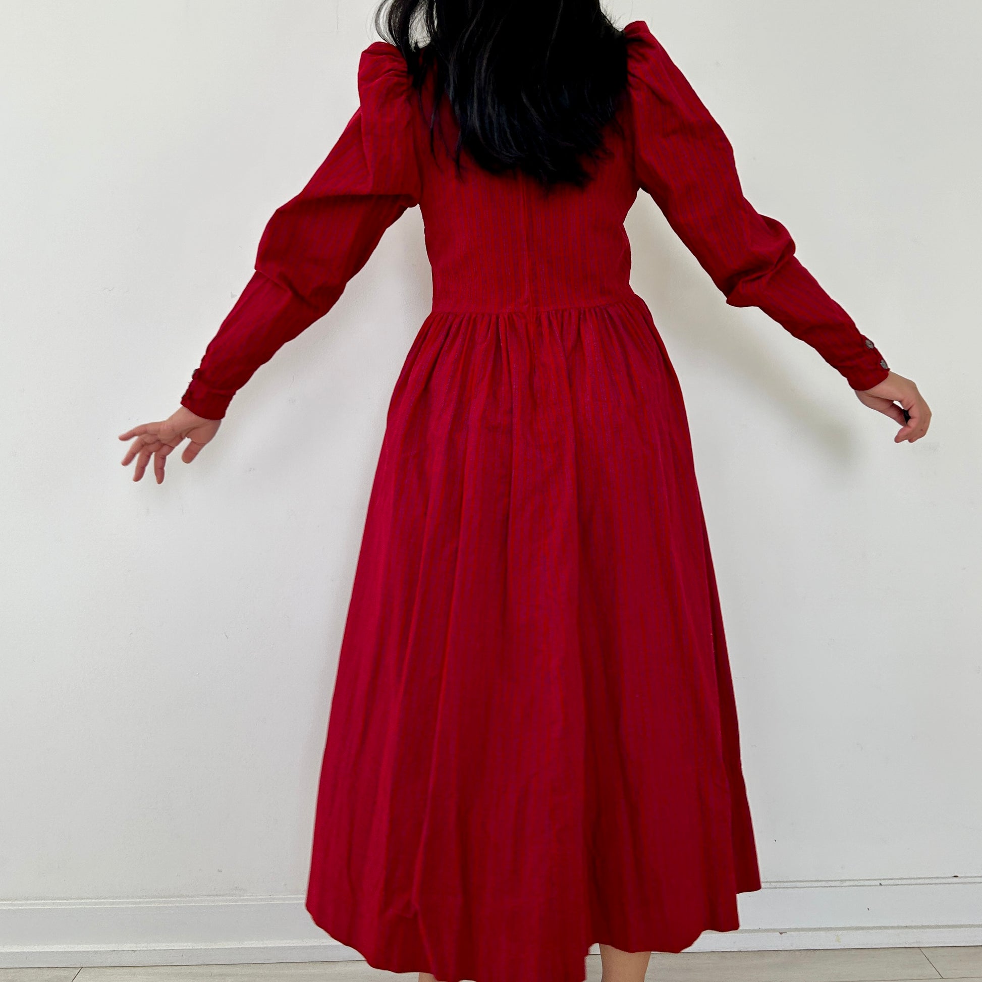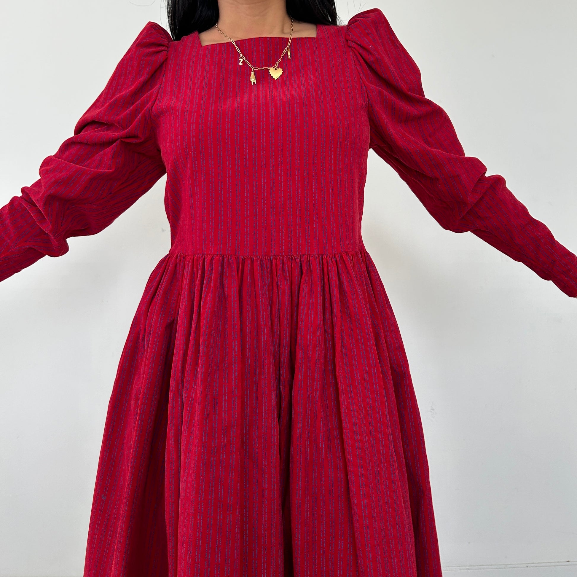 - Details: Red with blue stripes; puff shoulders; long sleeve prairie dress; corduroy material