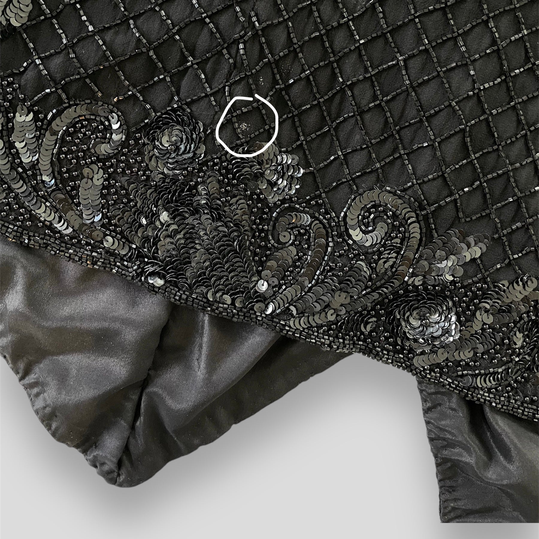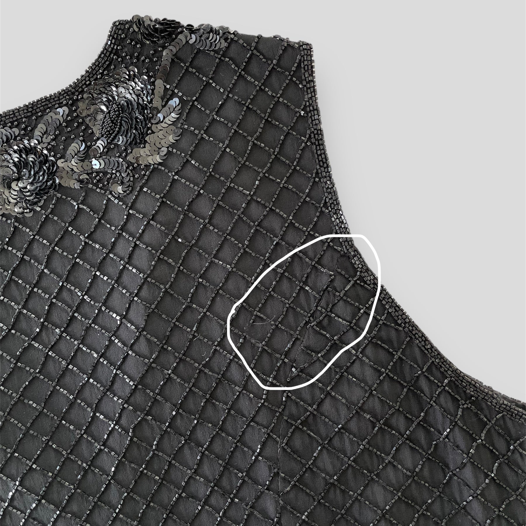 - Details: From the 1980s; hook and eye closure; sleeveless; black sequin and bead details