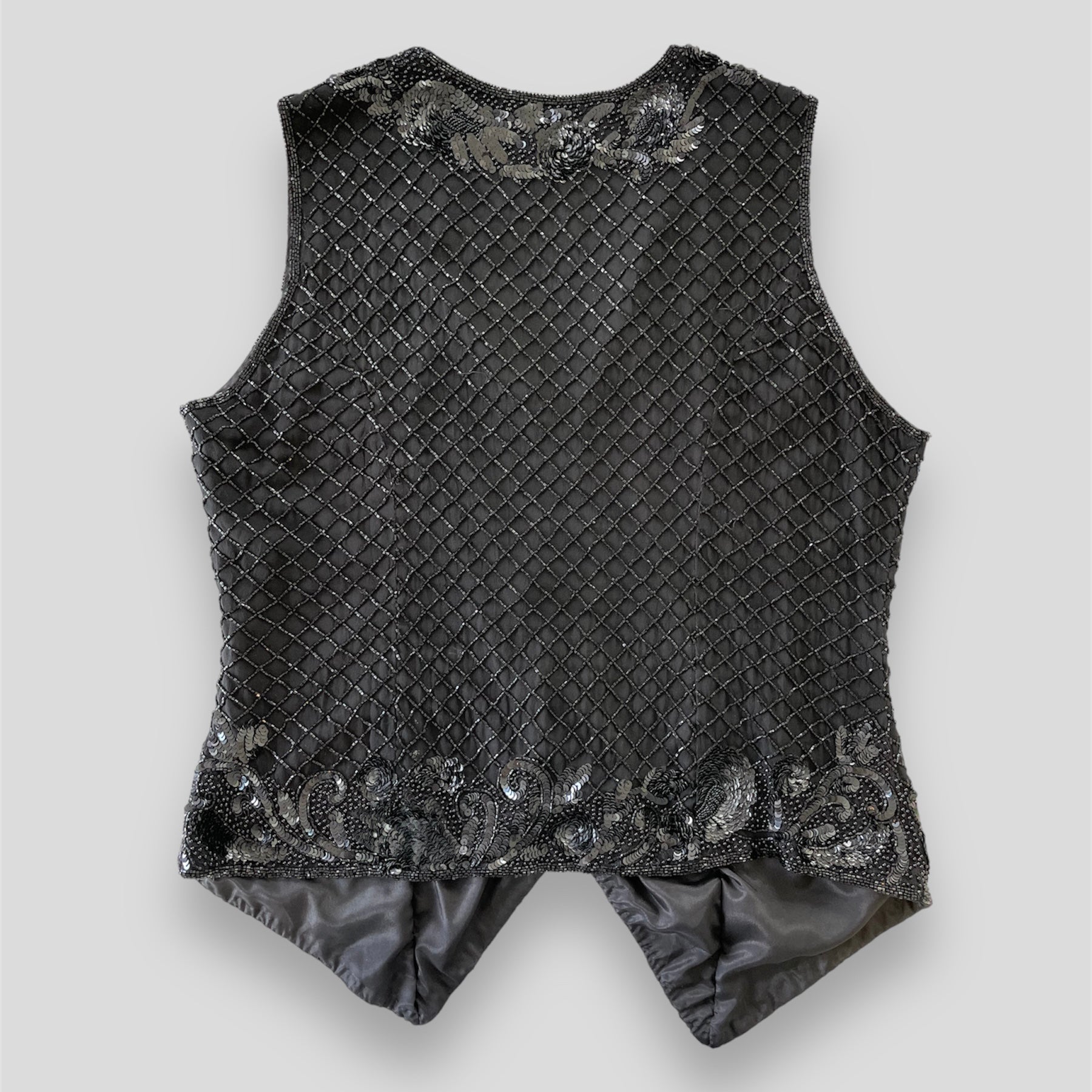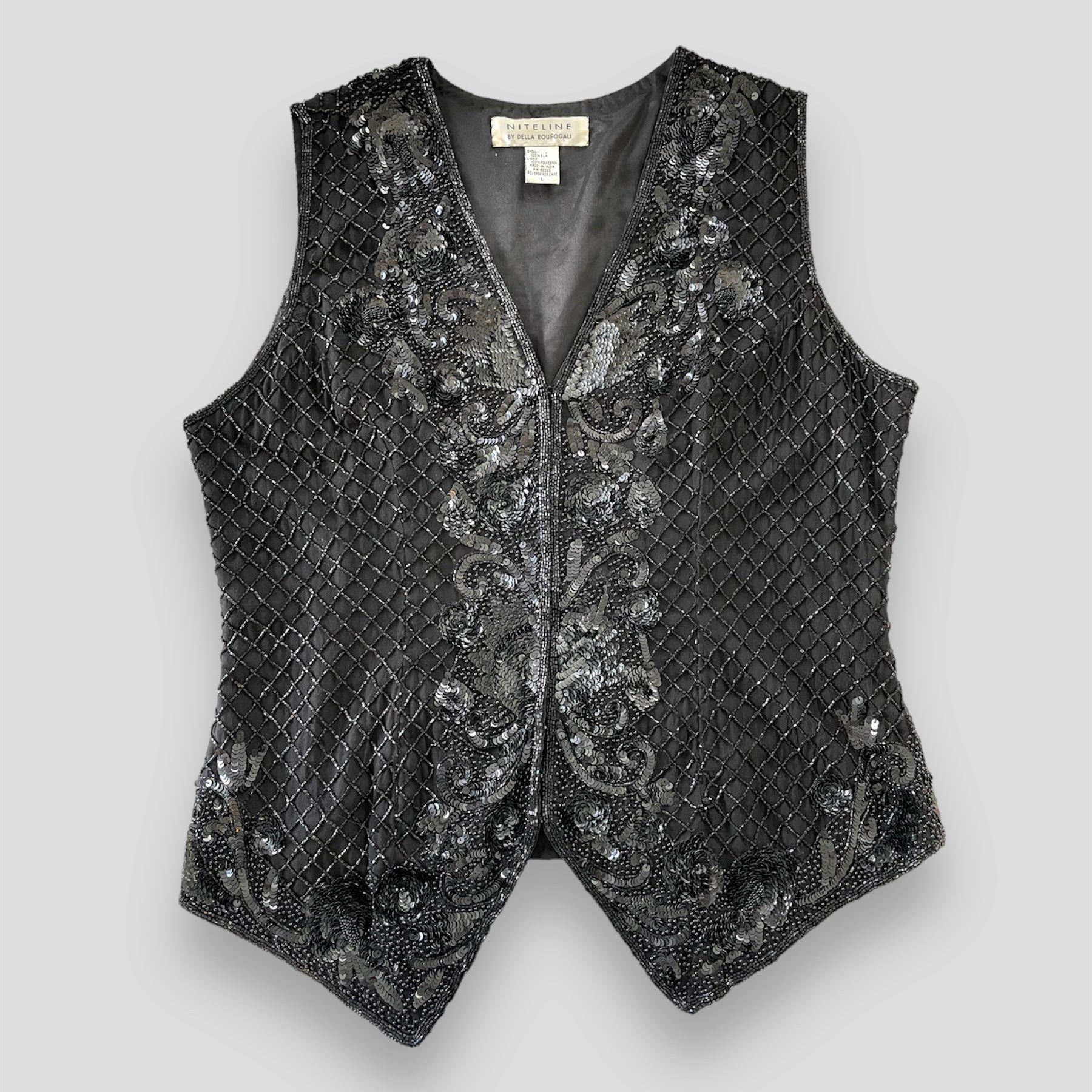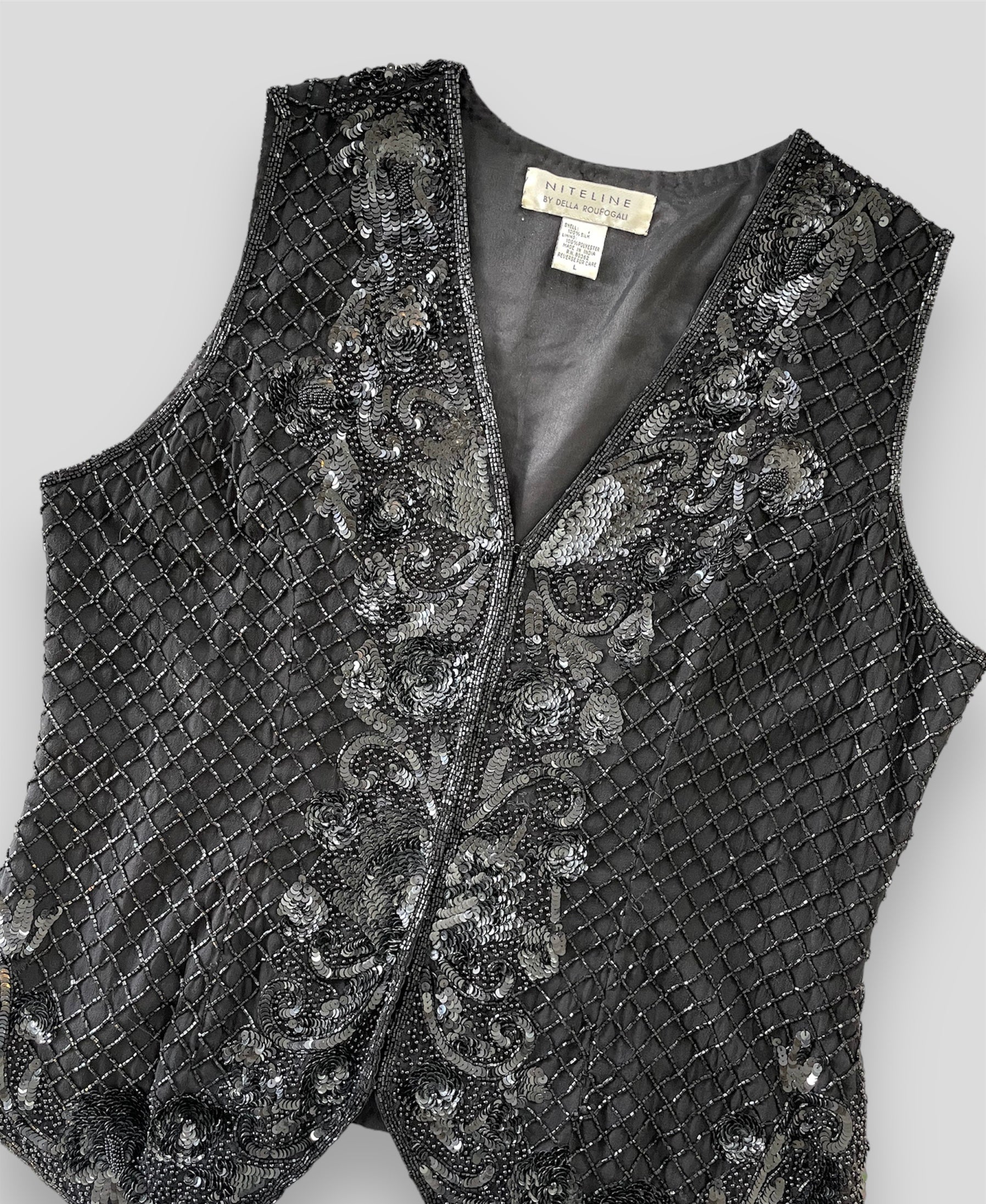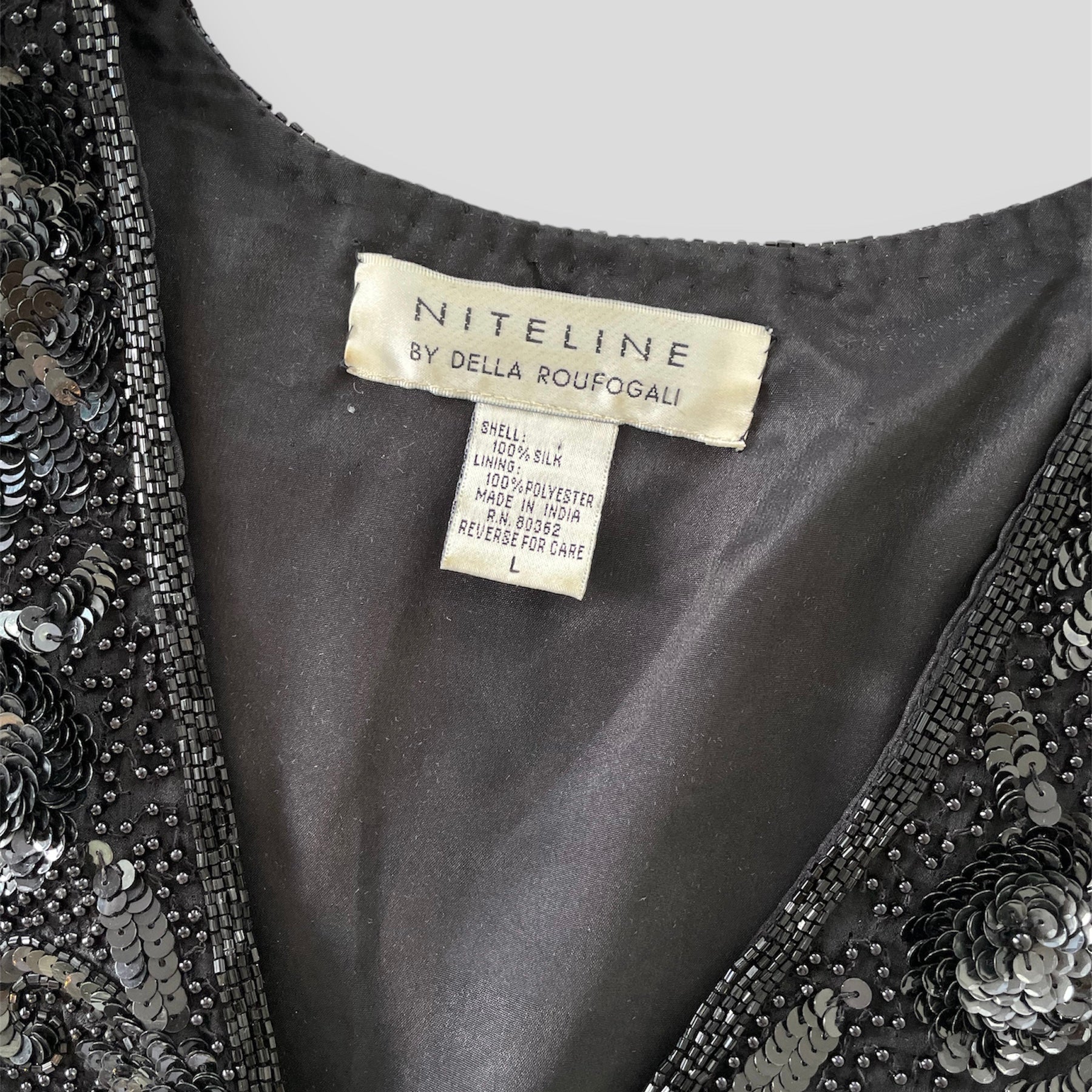 Vintage 1980s Niteline by Della Roufogali Black Beaded Silk Vest - Large