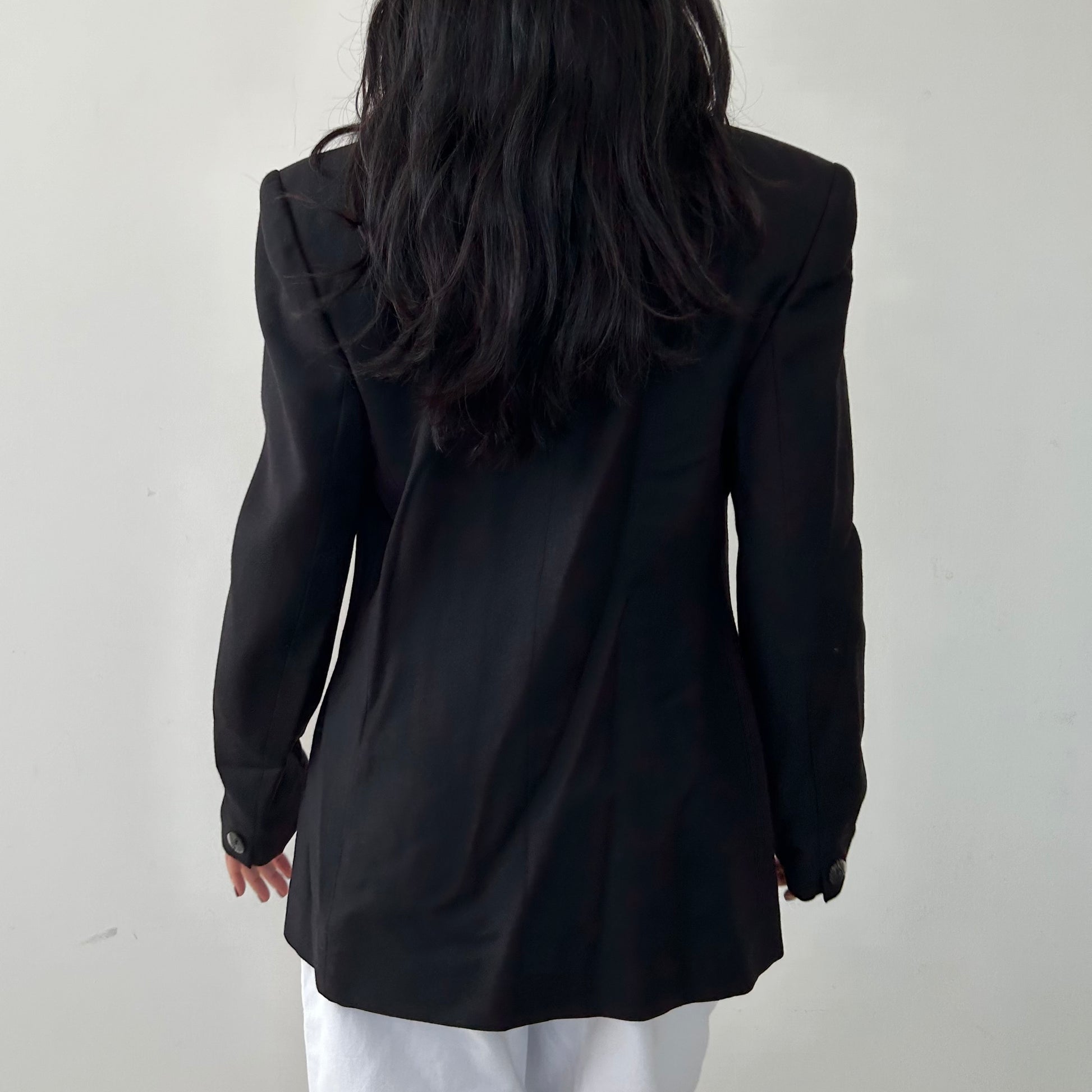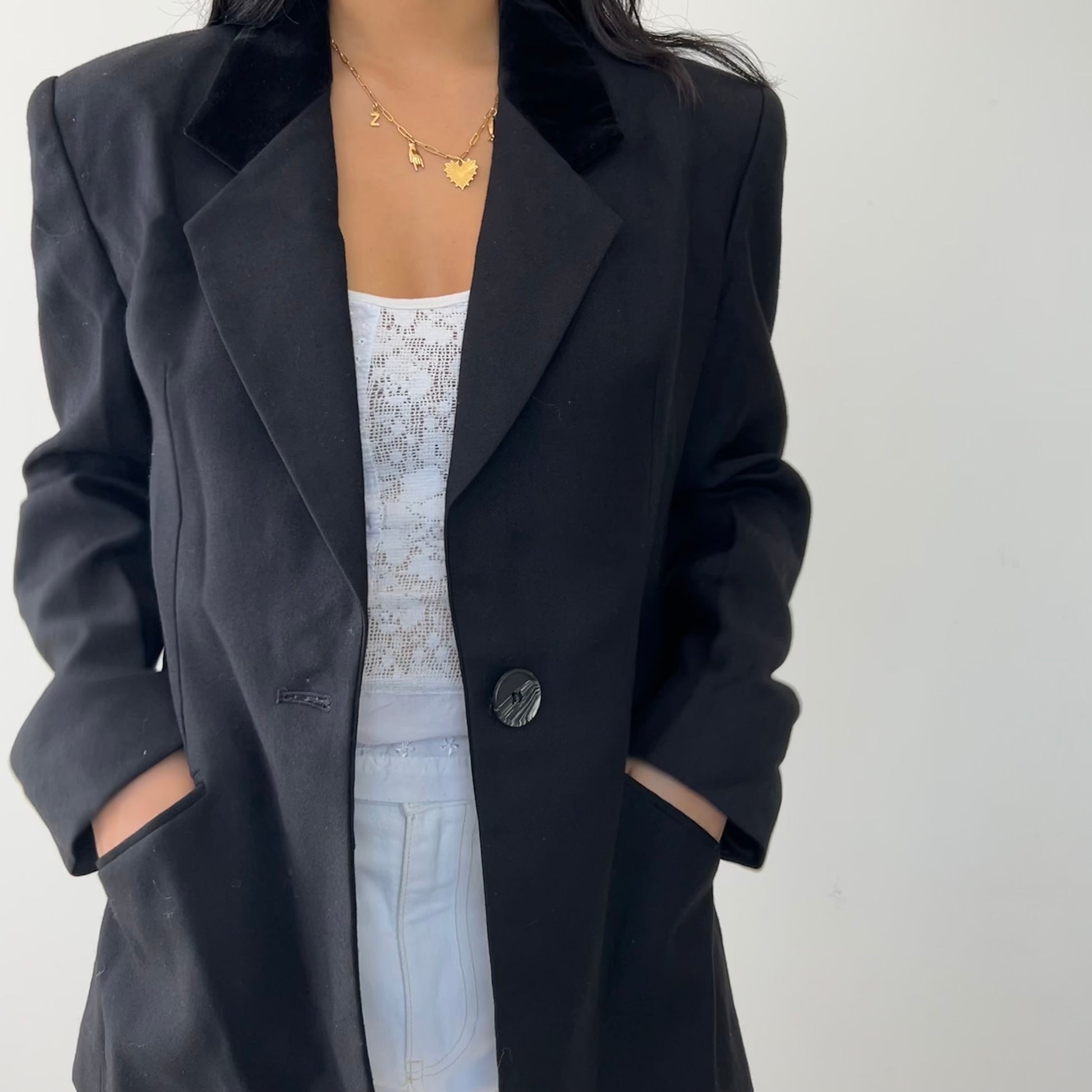 Details: Structured black blazer with a contrasting velvet notch lapel; features a single-button closure, padded shoulders, and front welt pockets; fully lined.