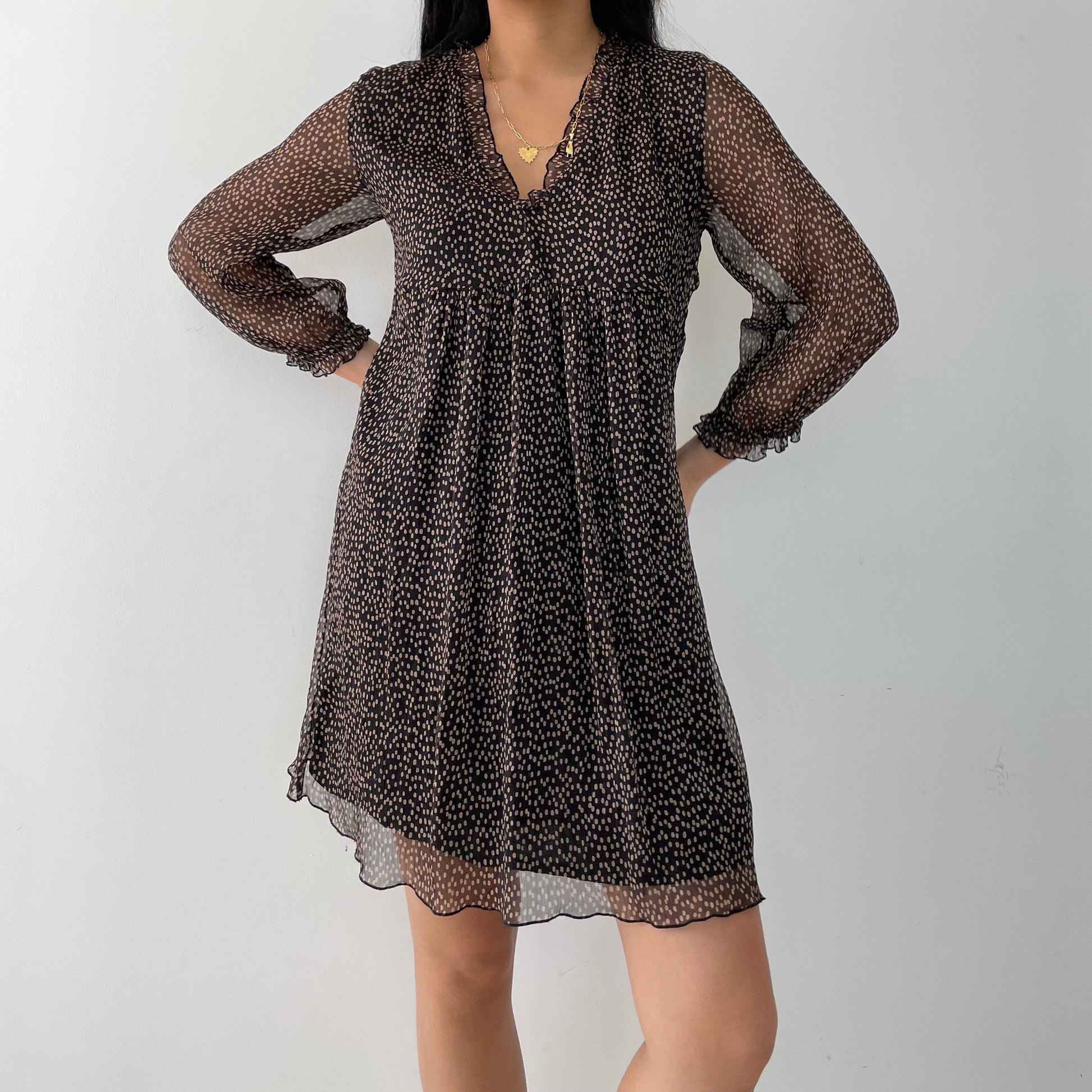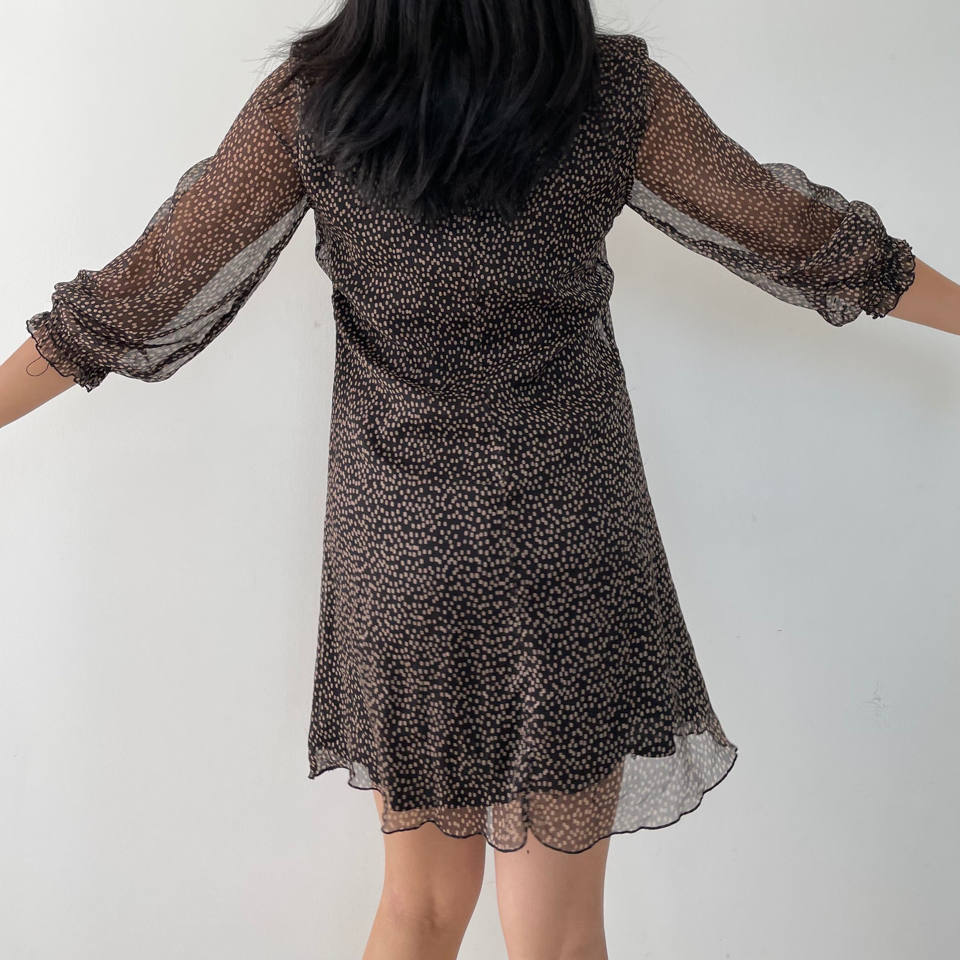 - Details: Double lined; 3/4 sleeves; brown and white polka dot pattern; empire waist; sheer sleeves; v-neck