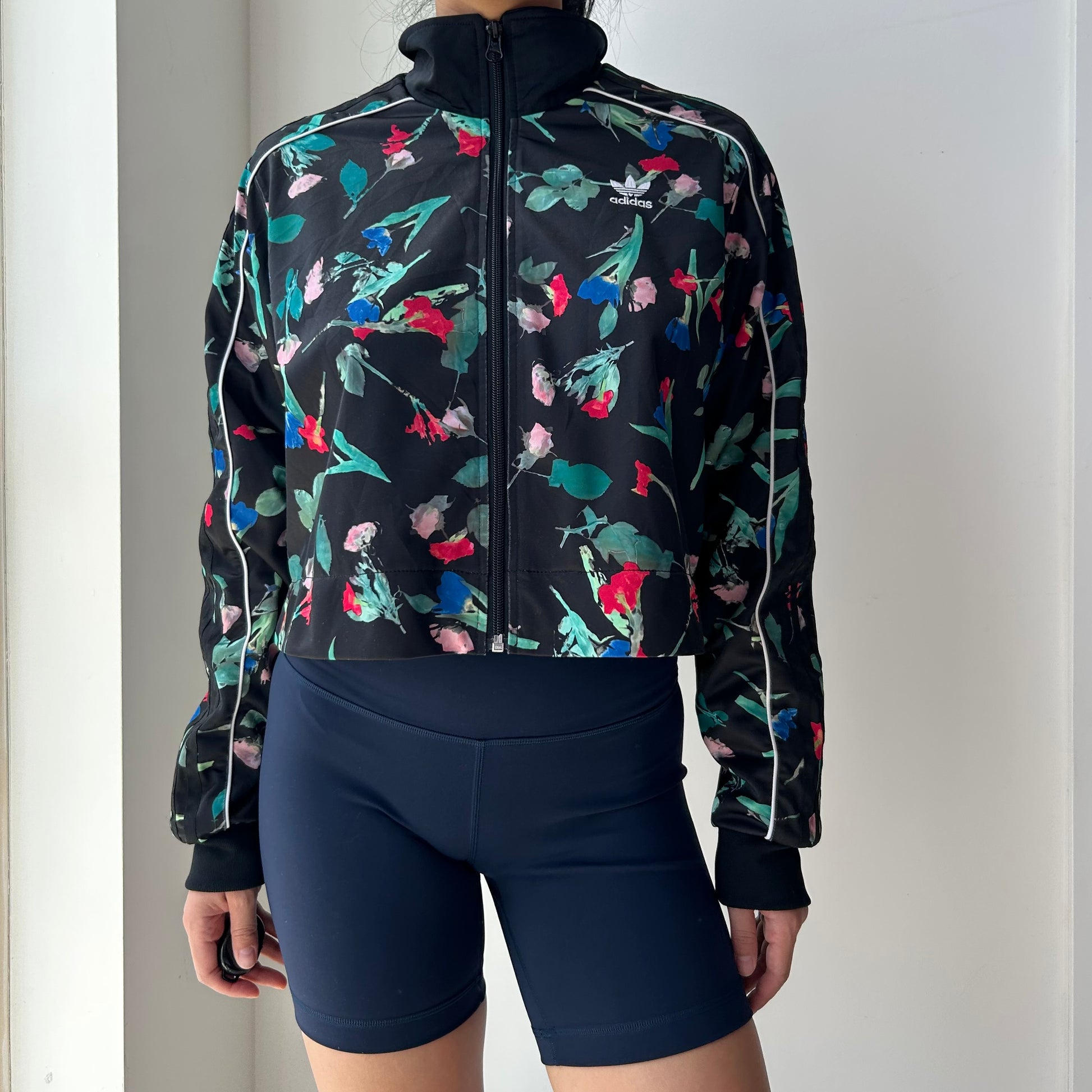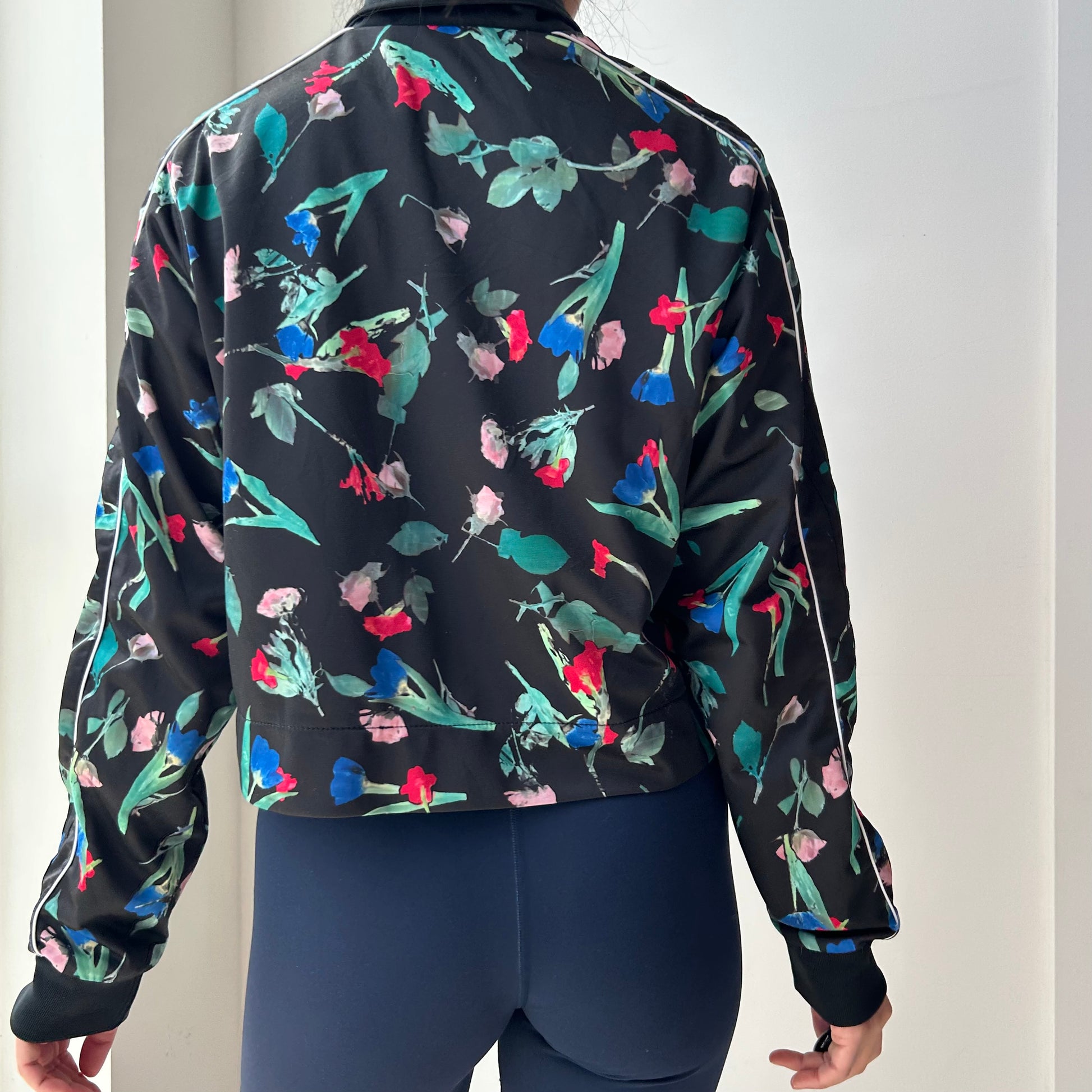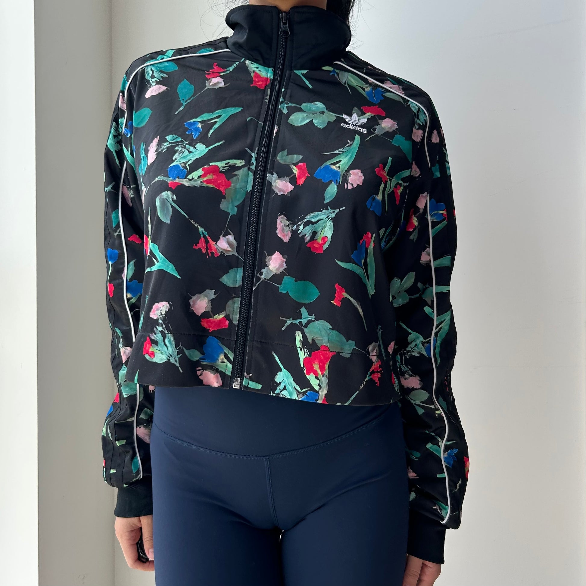 - Details: Stand collar; piped long sleeves; signature triple stripes at sleeves; rib-knit cuffs; front zip closure; embroidered trefoil logo at chest; cropped silhouette; allover floral print; unlined