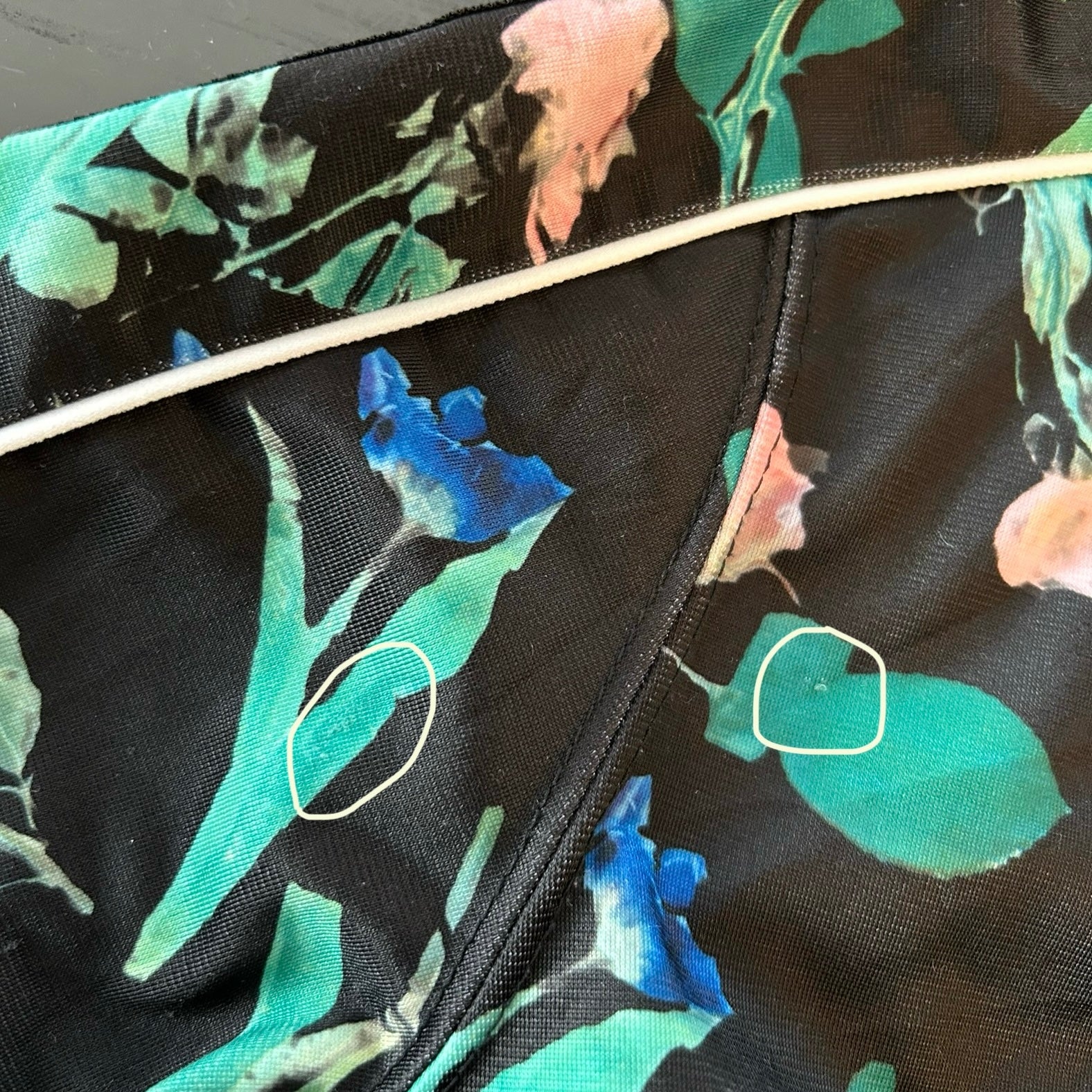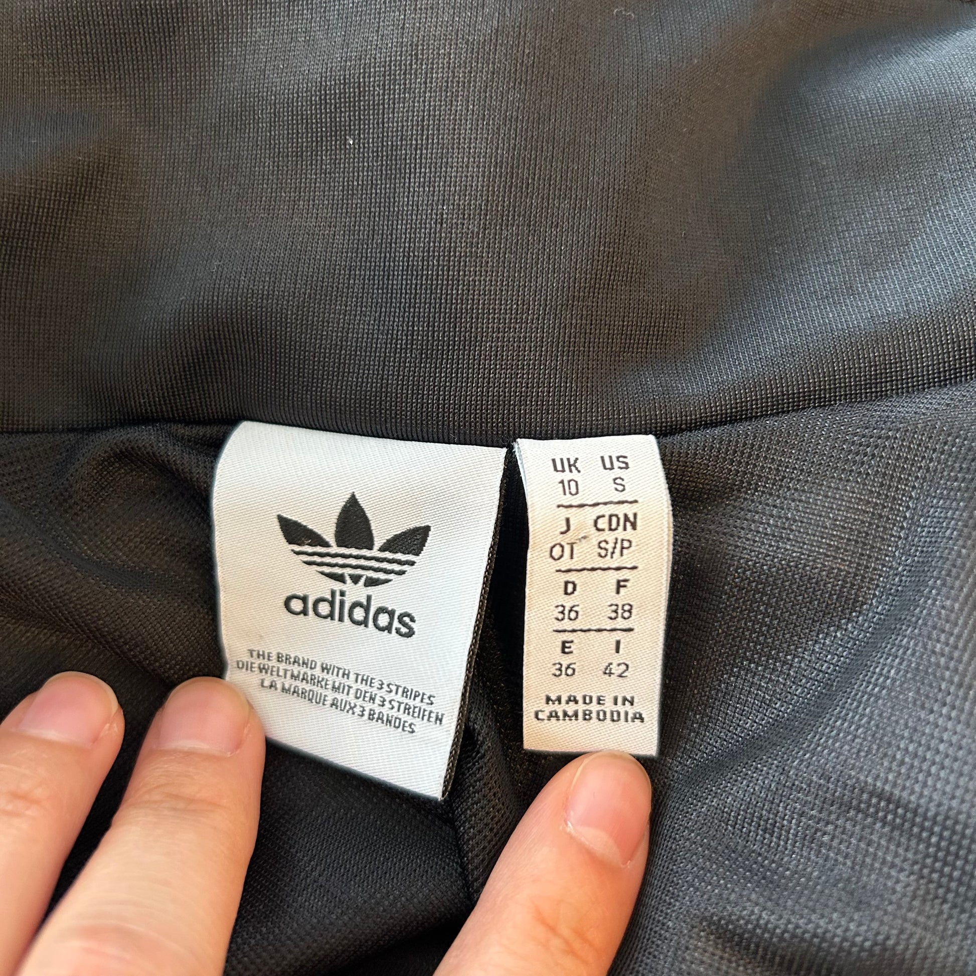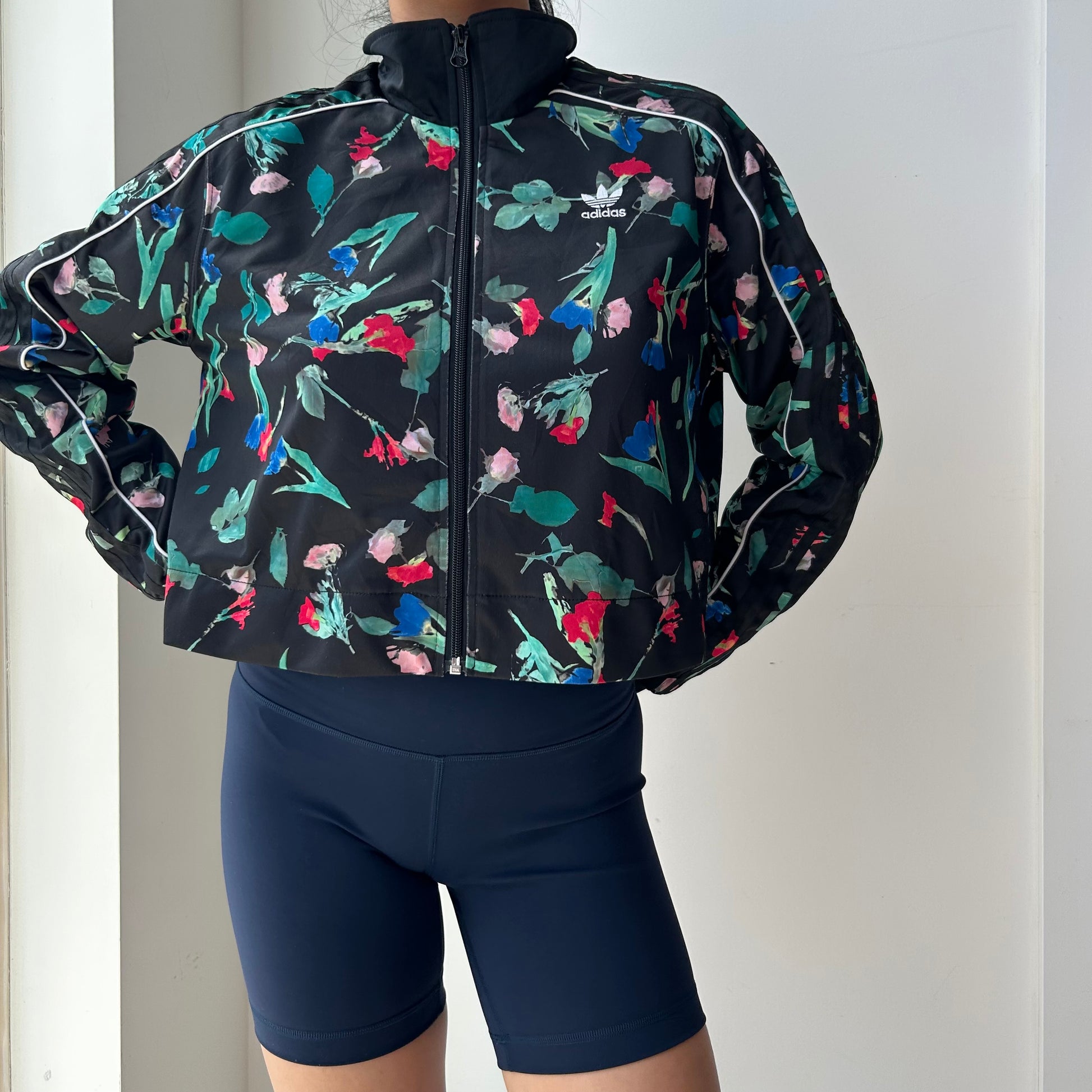 - Details: Stand collar; piped long sleeves; signature triple stripes at sleeves; rib-knit cuffs; front zip closure; embroidered trefoil logo at chest; cropped silhouette; allover floral print; unlined