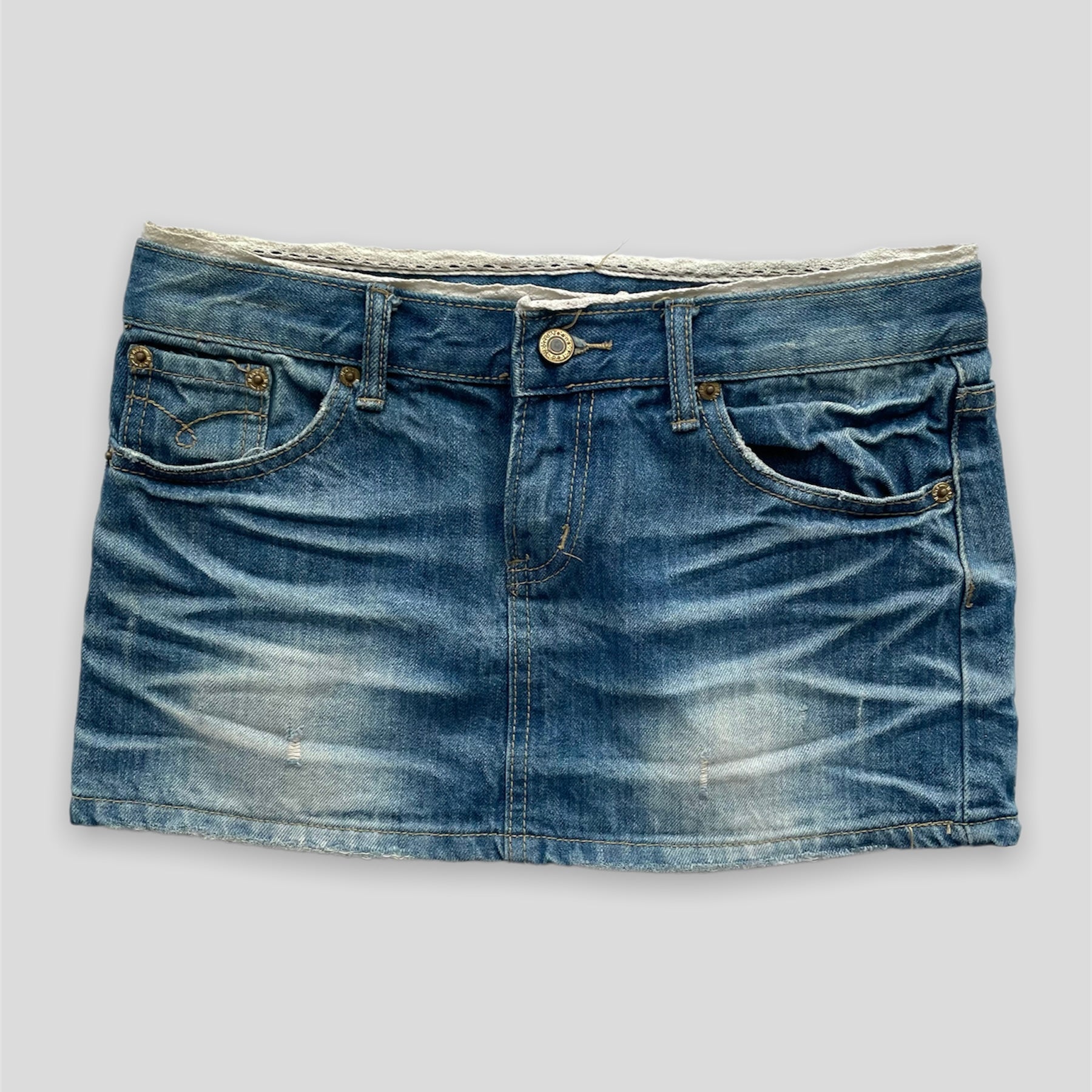 Lace Trim Mini Stone Wash Denim Skirt - Small