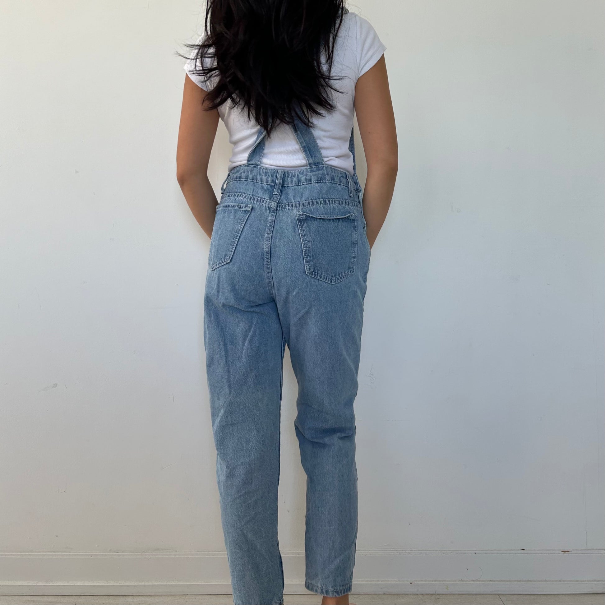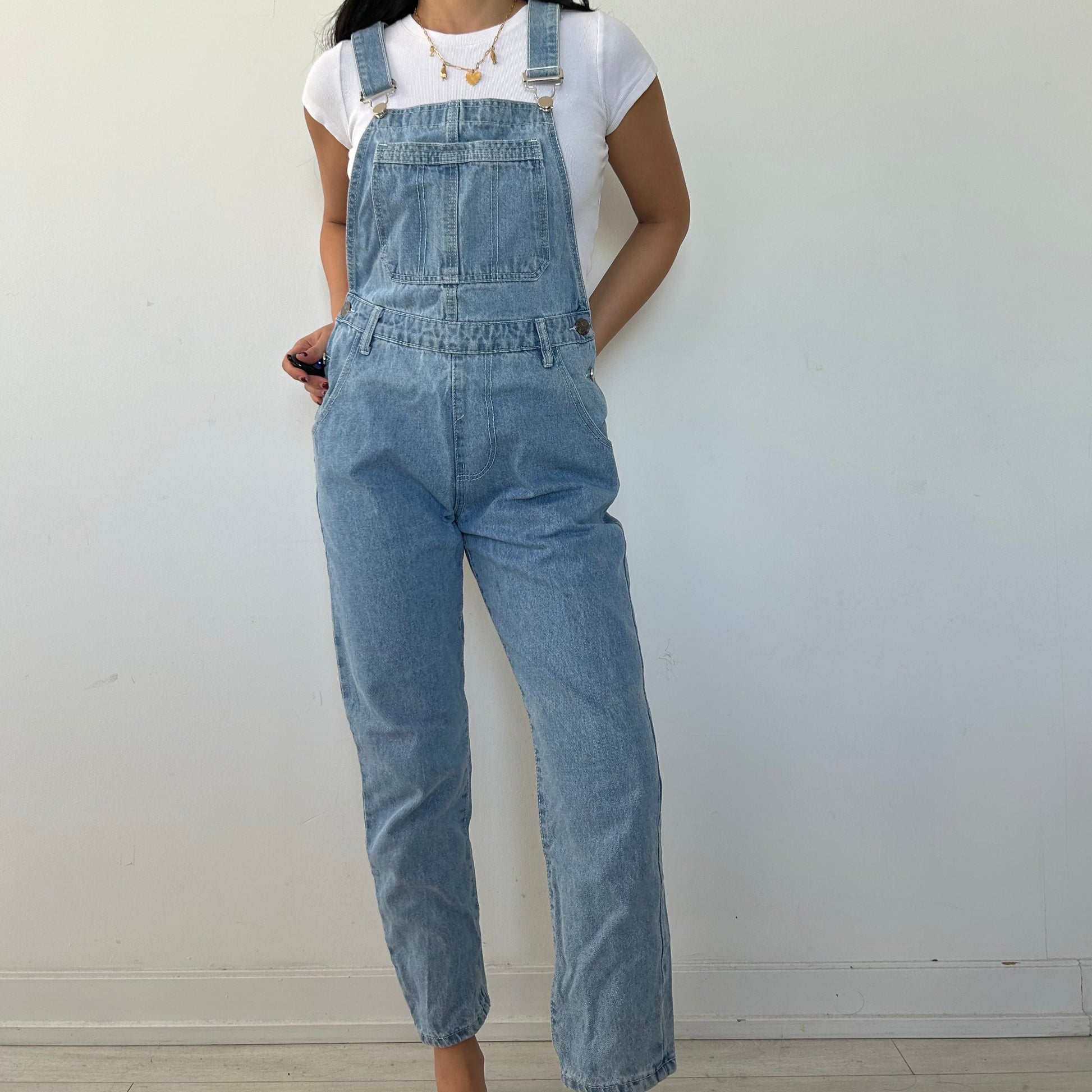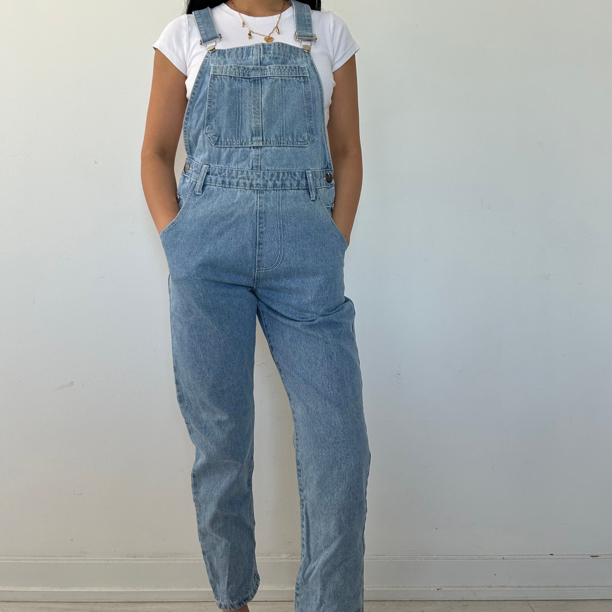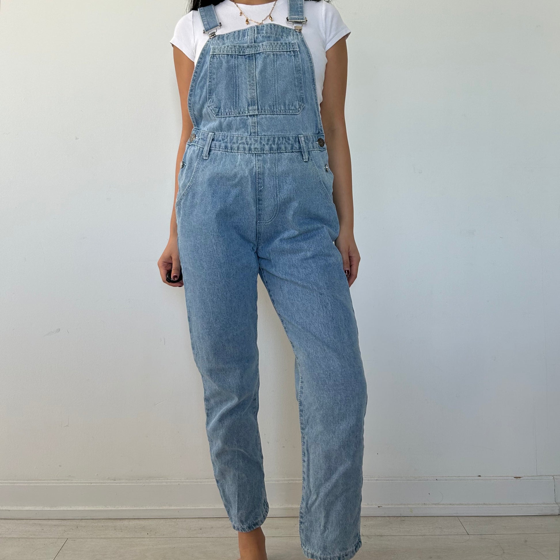 - Details: Straight leg non-stretch denim overalls; square neck; four-pocket styling; button fastening at outseams; adjustable shoulder straps; silver-tone hardware