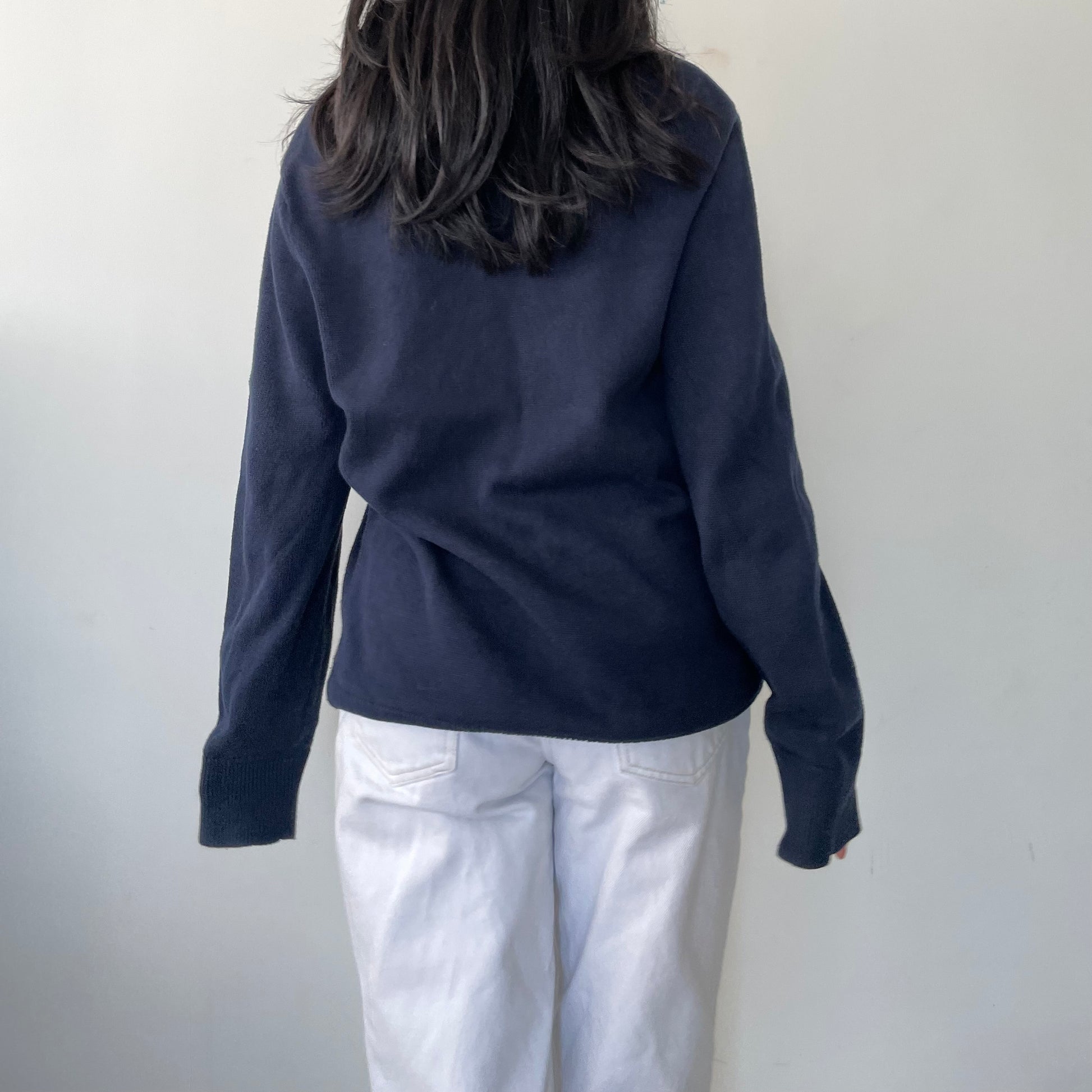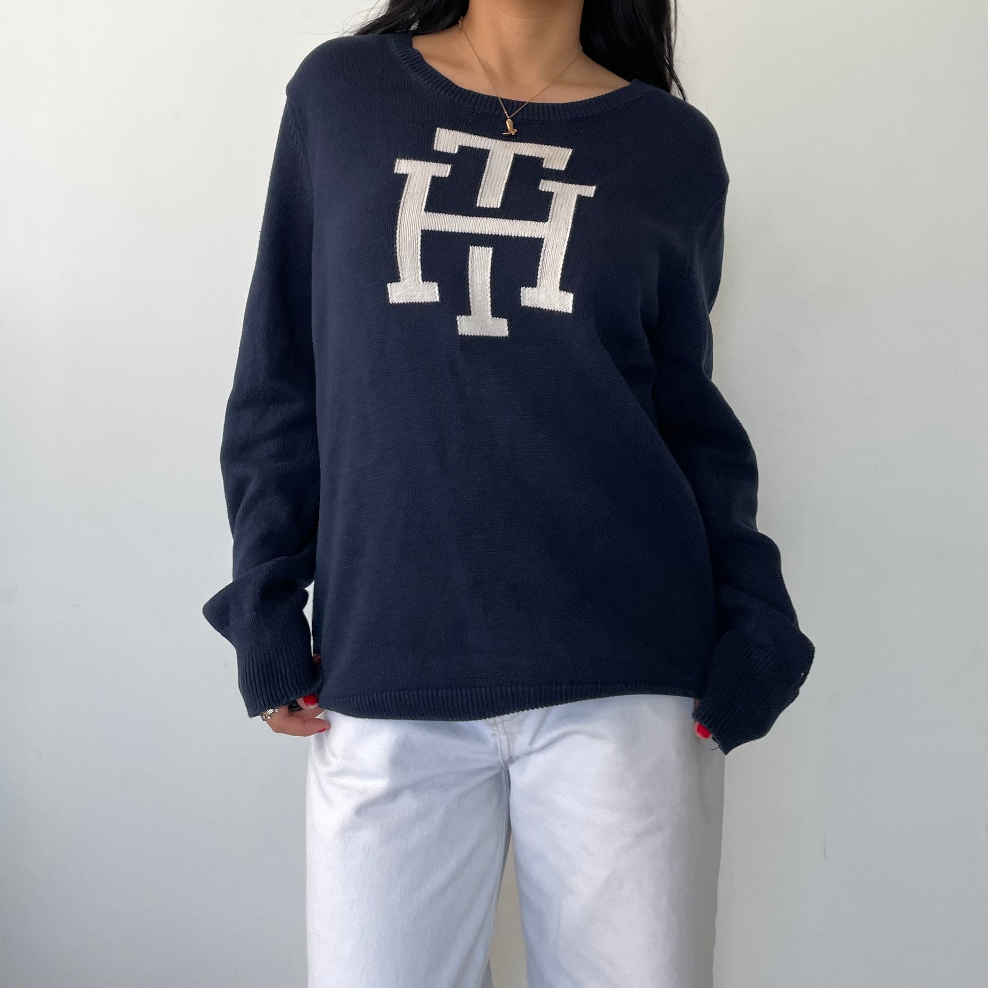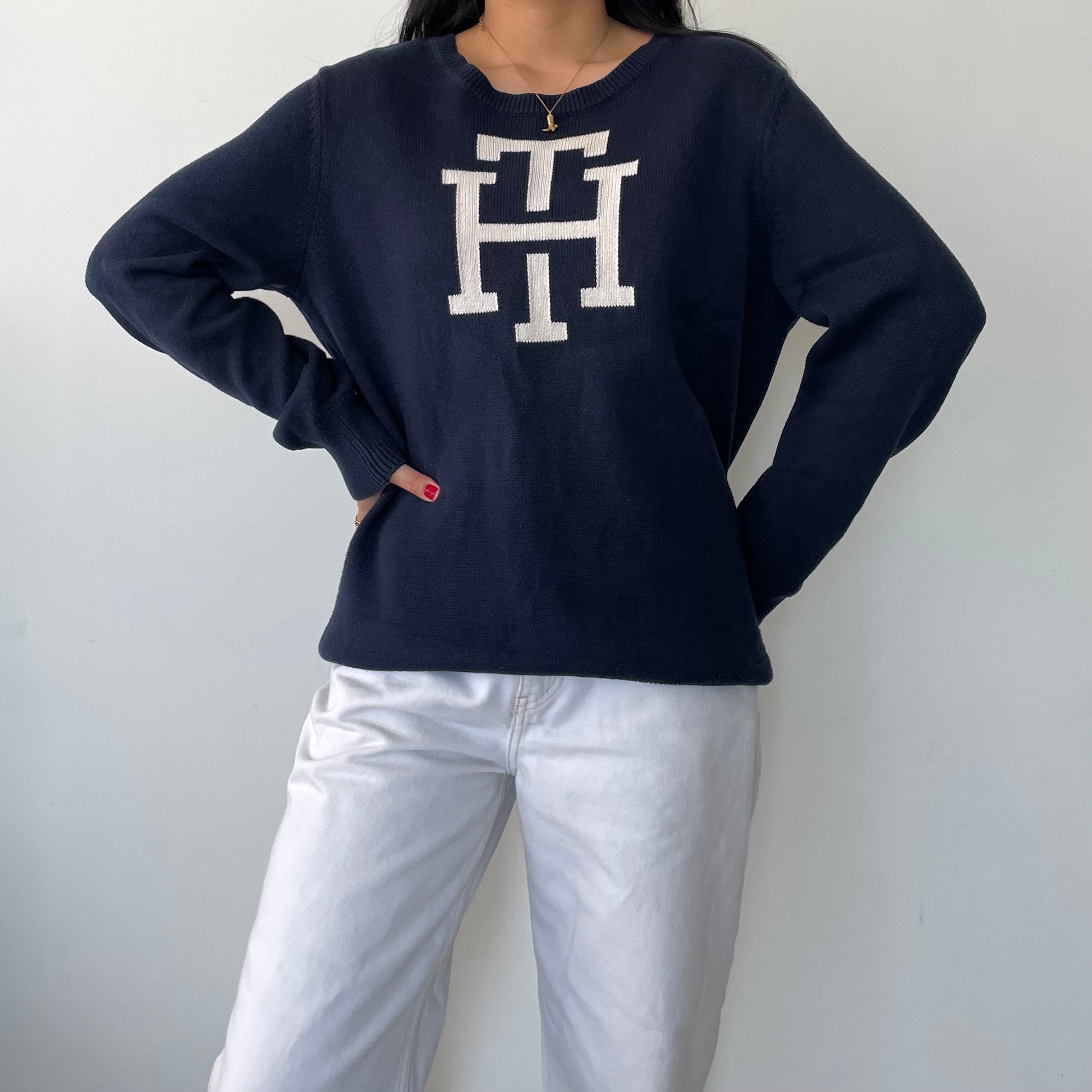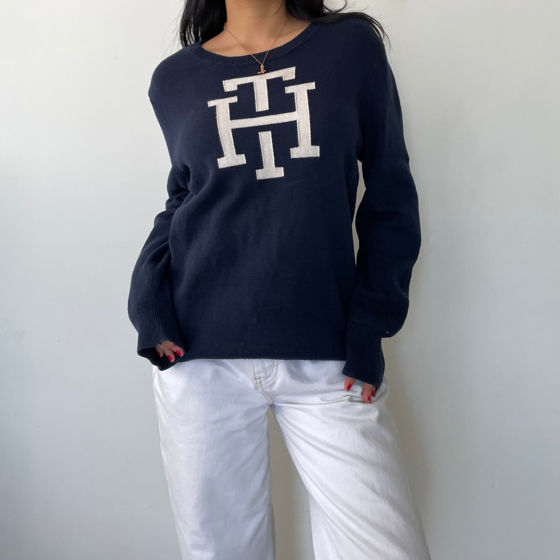 - Details: TH mongram in white; navy long sleeve crewneck cotton knit jumper