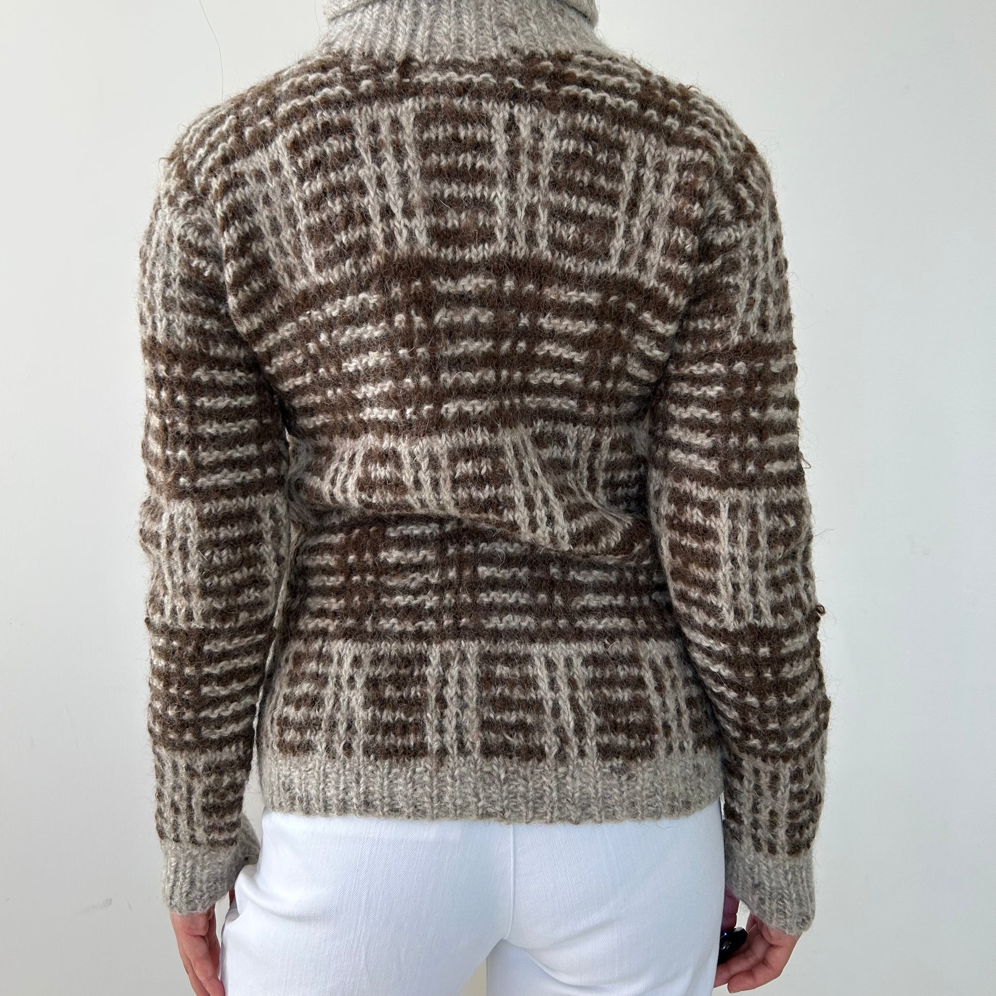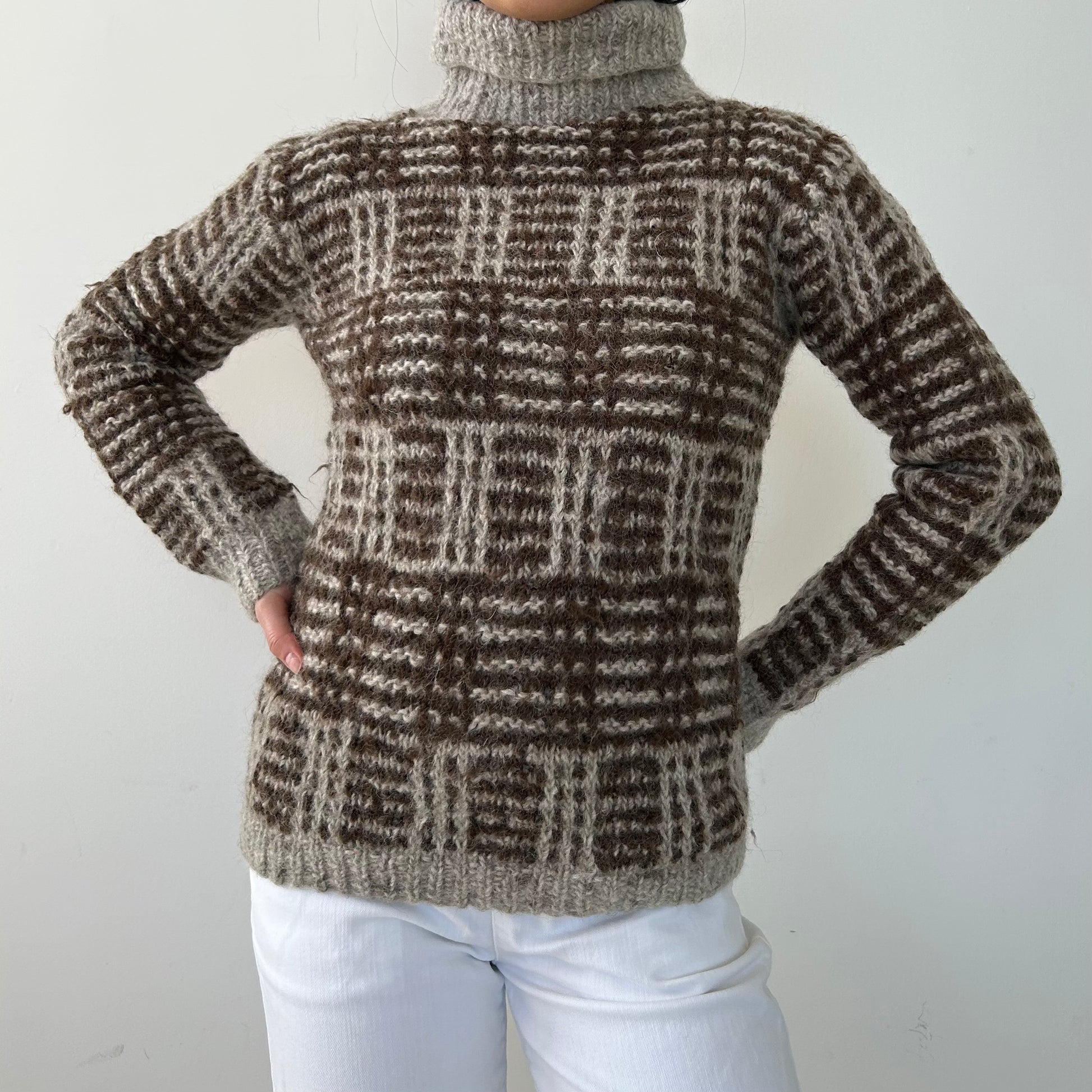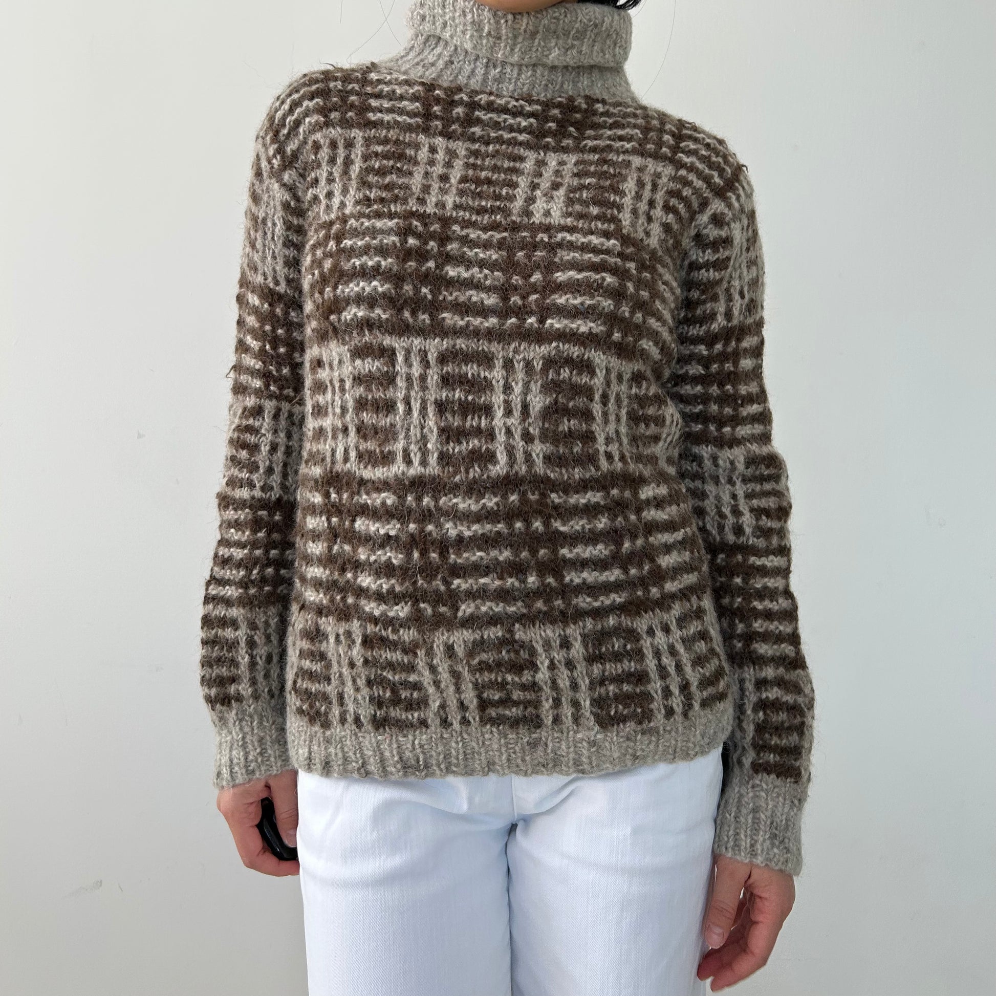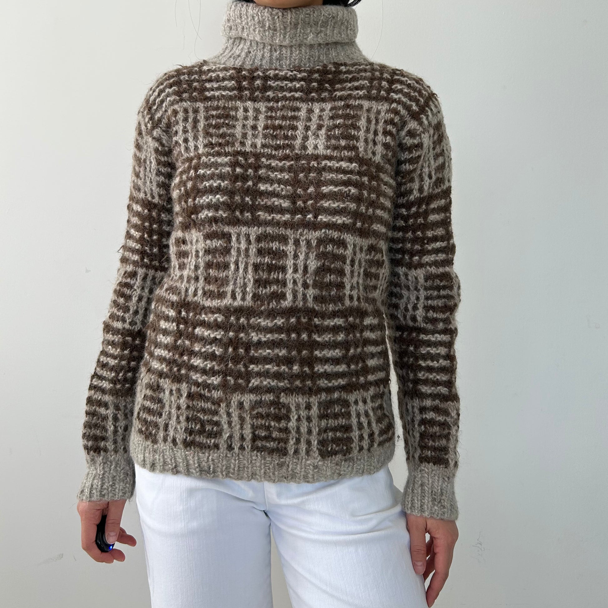 - Details: Vintage from the 1980s; long-sleeve turtleneck sweater; oversized check pattern in brown and beige tones; rib-knit collar, cuffs, and hem