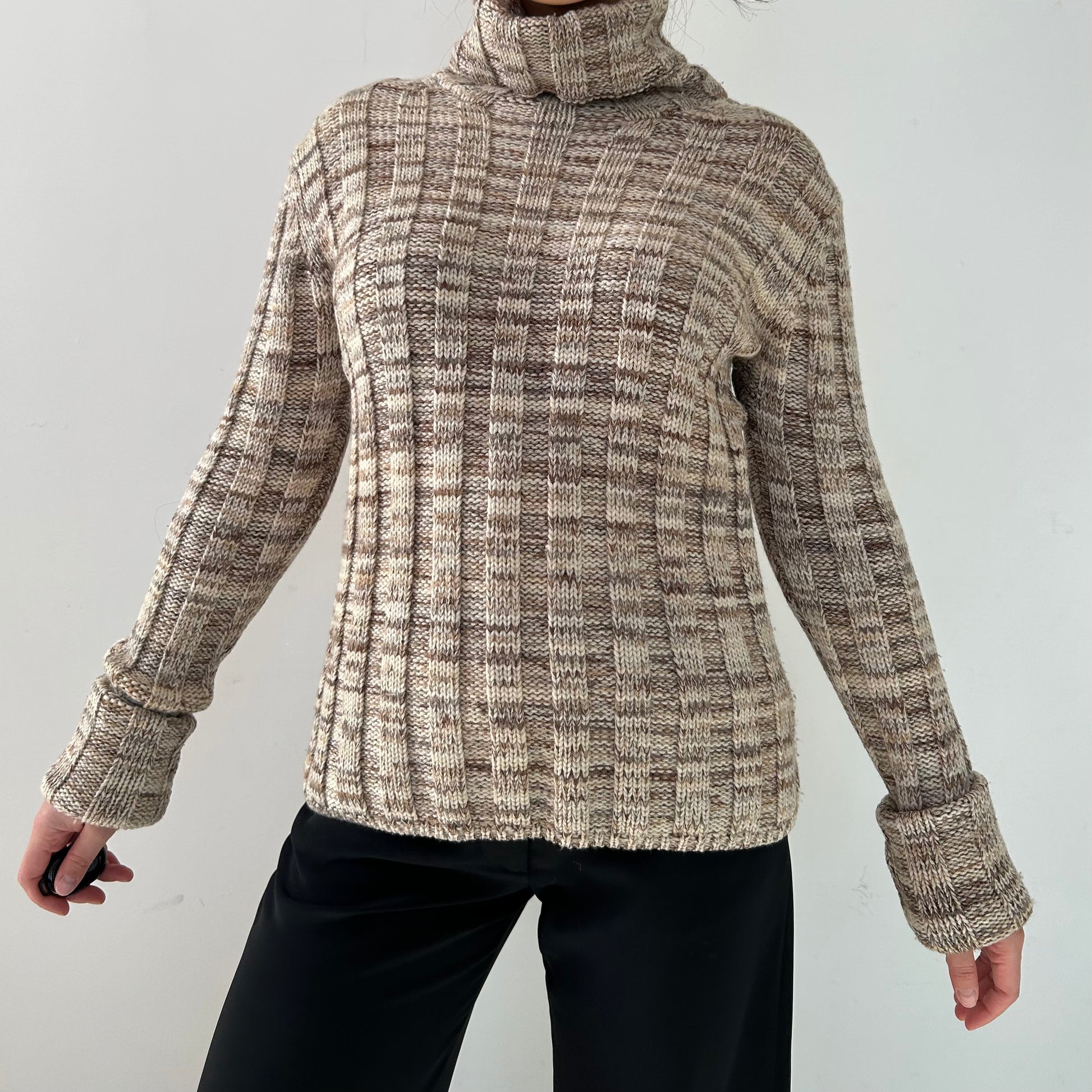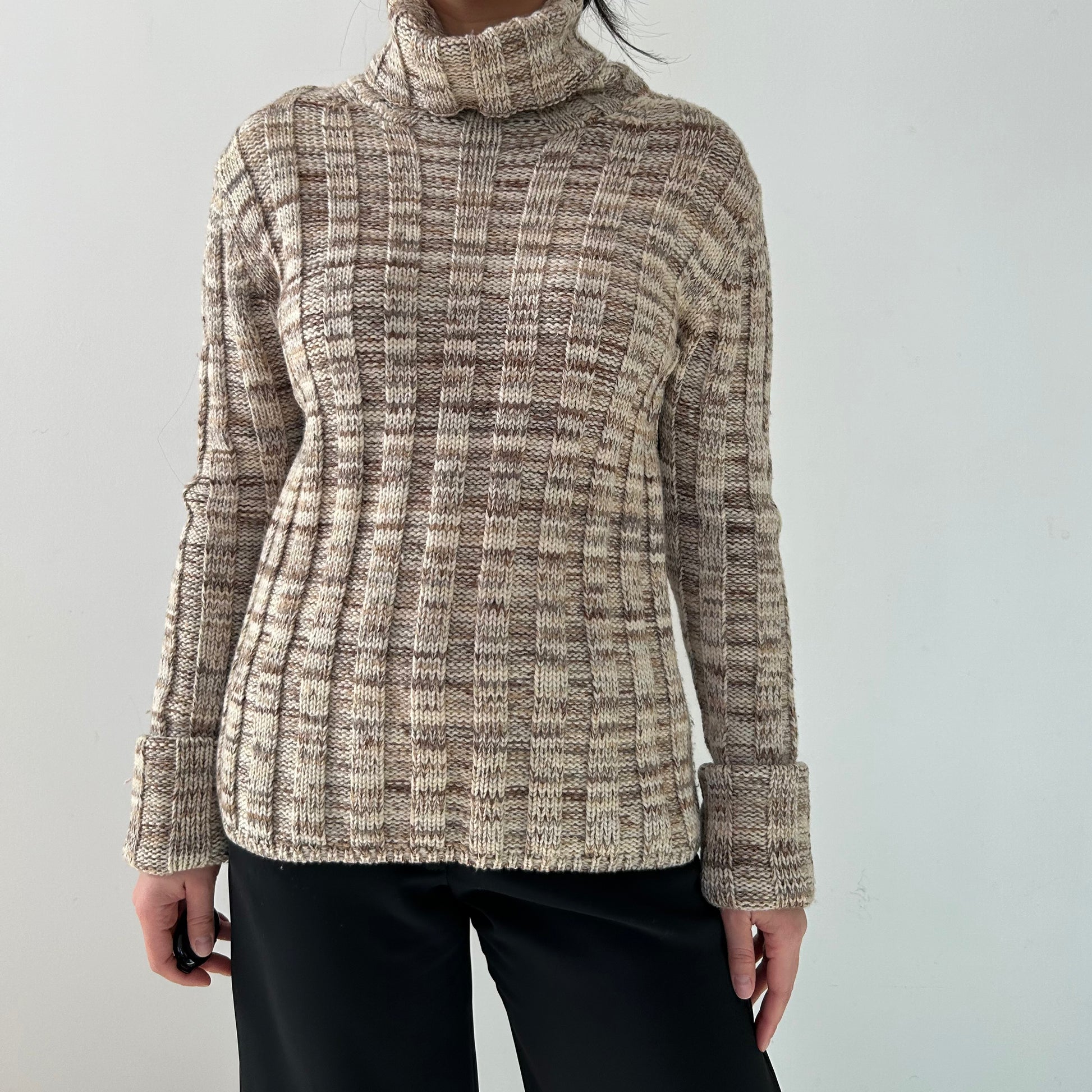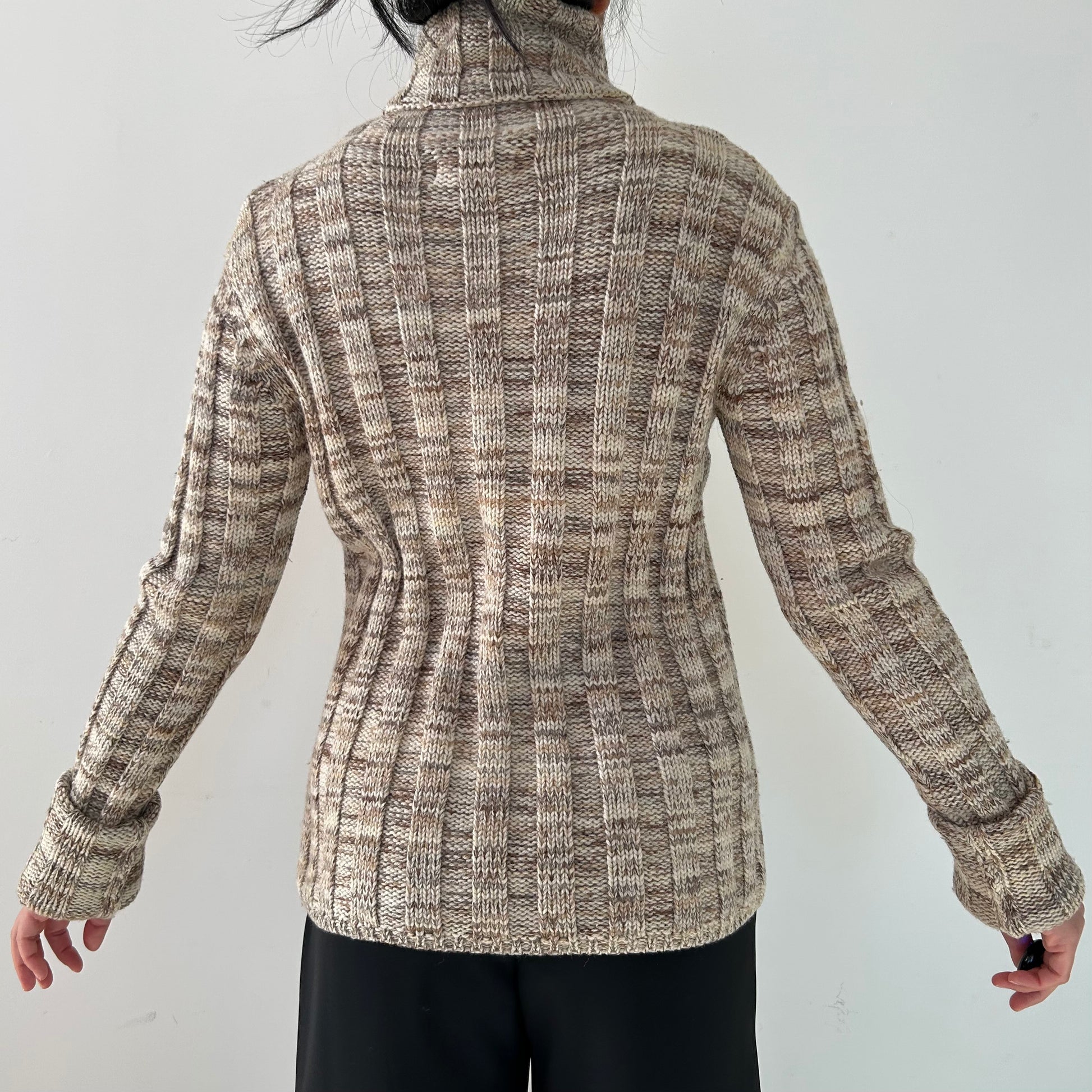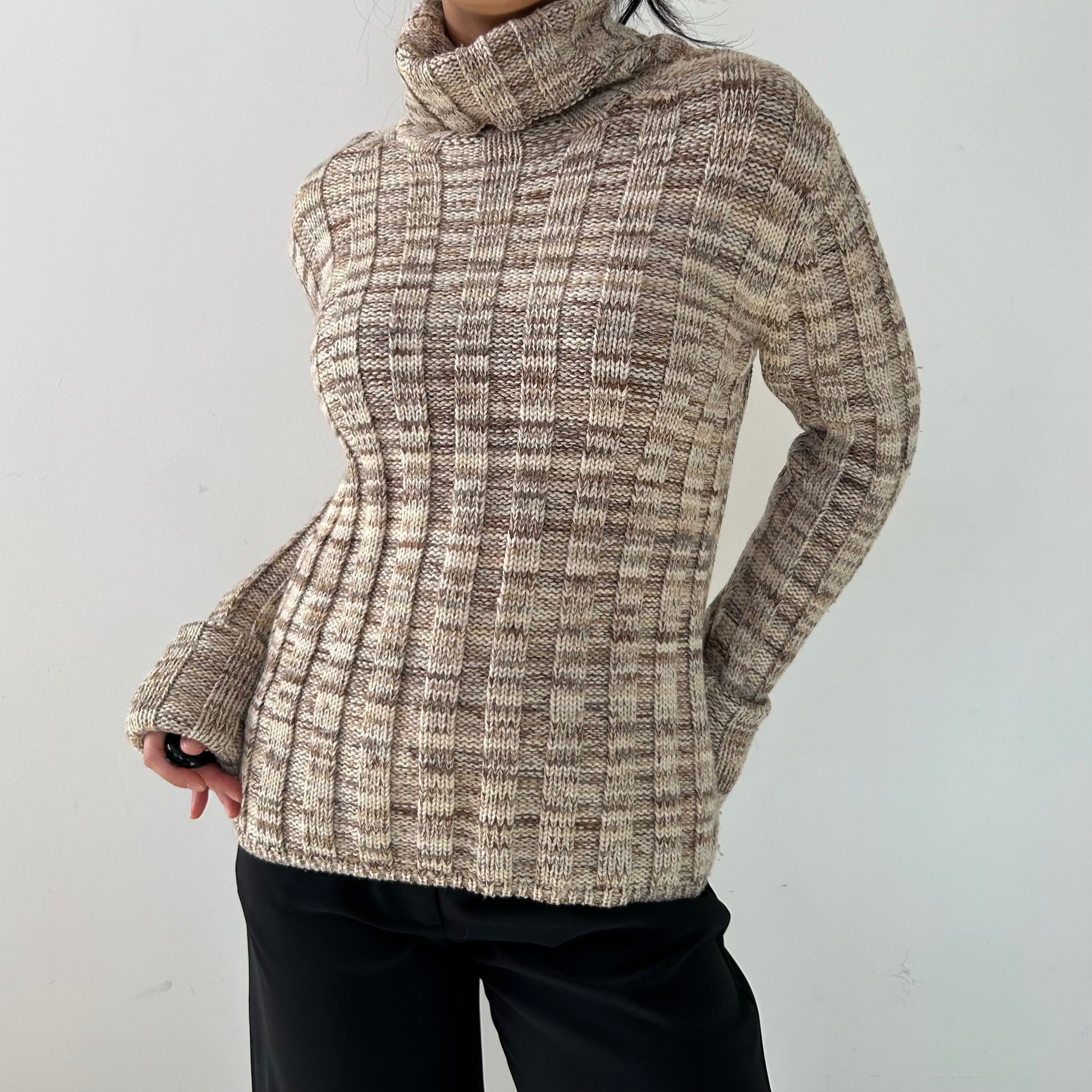 - Details: Vintage 1990s; beige wide rib knit turtleneck sweater; long sleeves