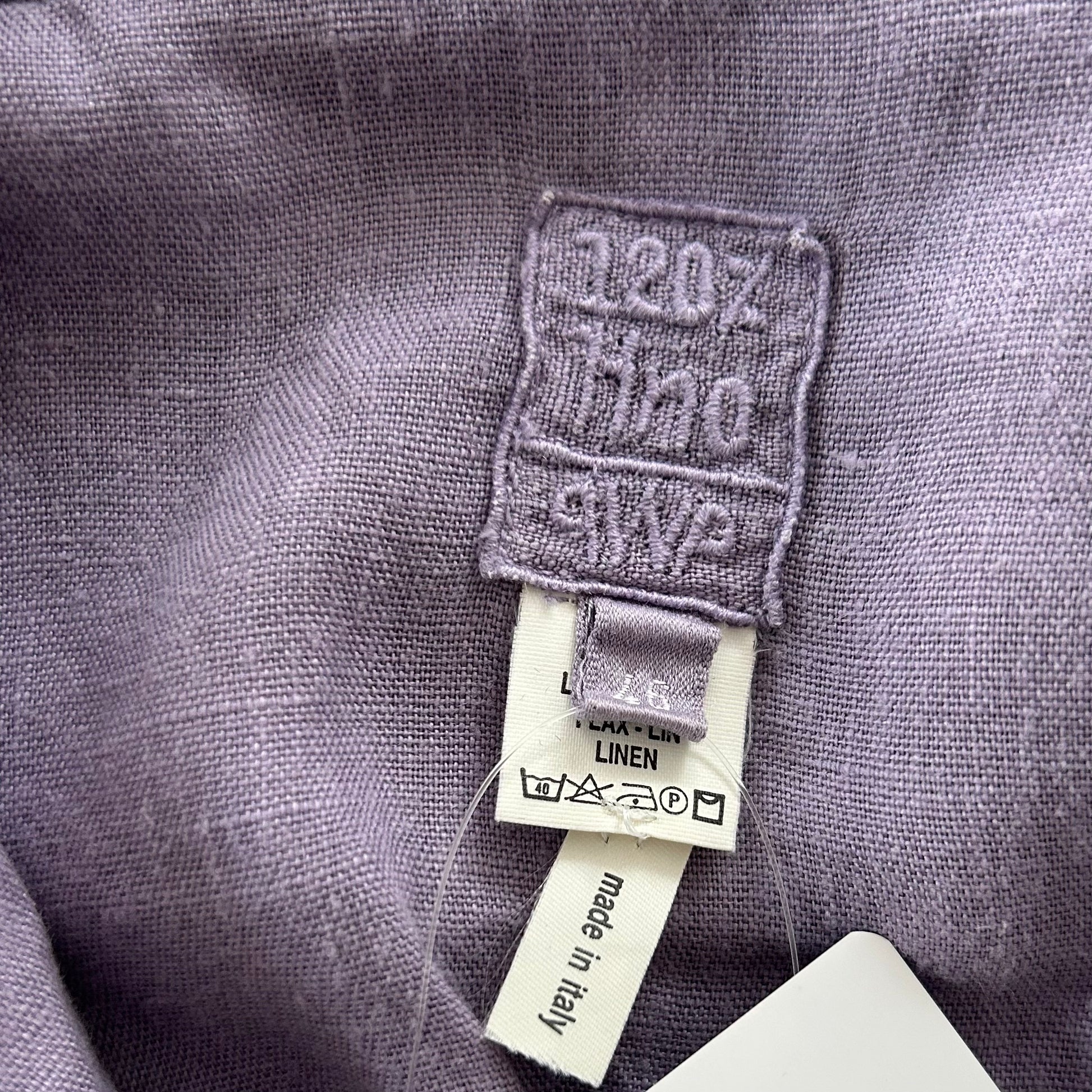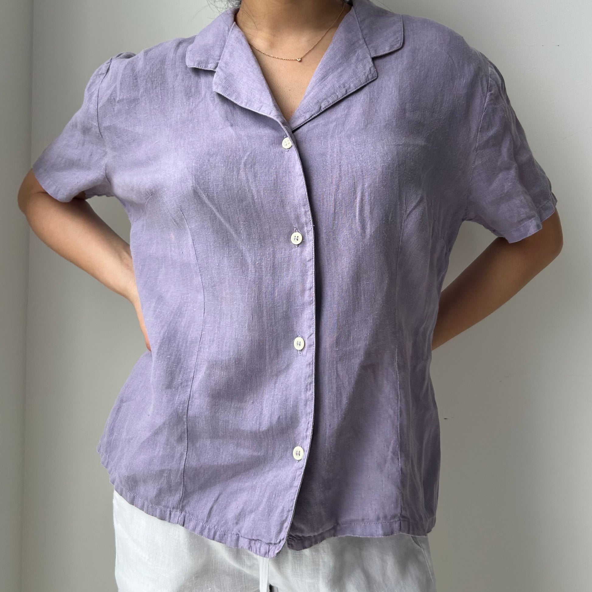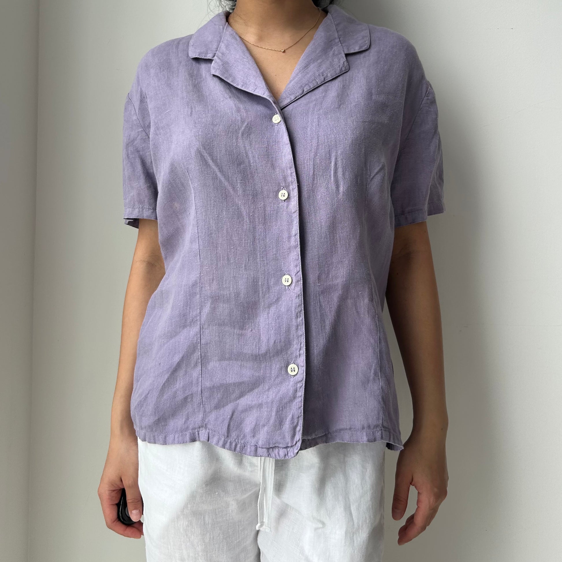 - Details: Purple short sleeve button up shirt in linen; normally retails for over $325 CAD