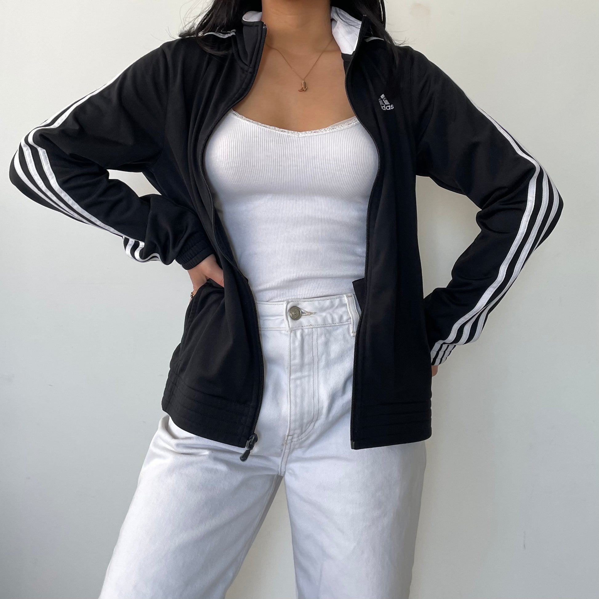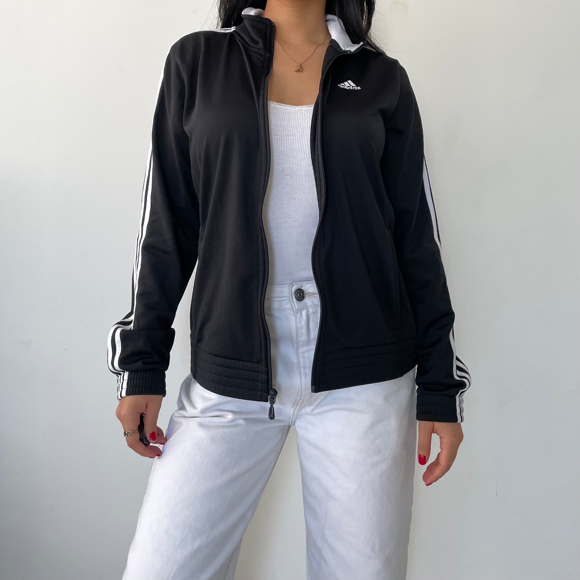 - Details: Black zip up track jacket; iconic white stripes on the arms; Adidas logo on the left chest