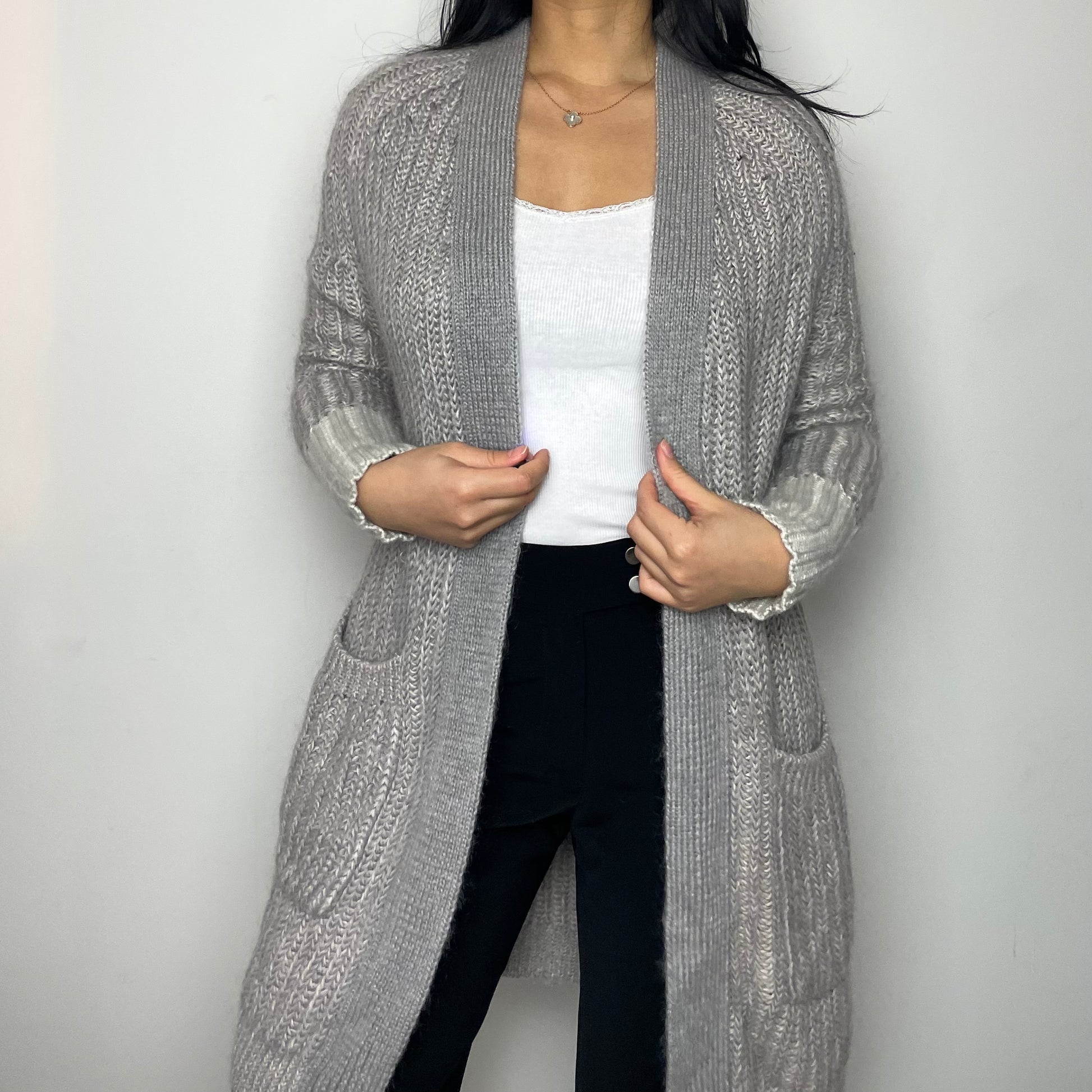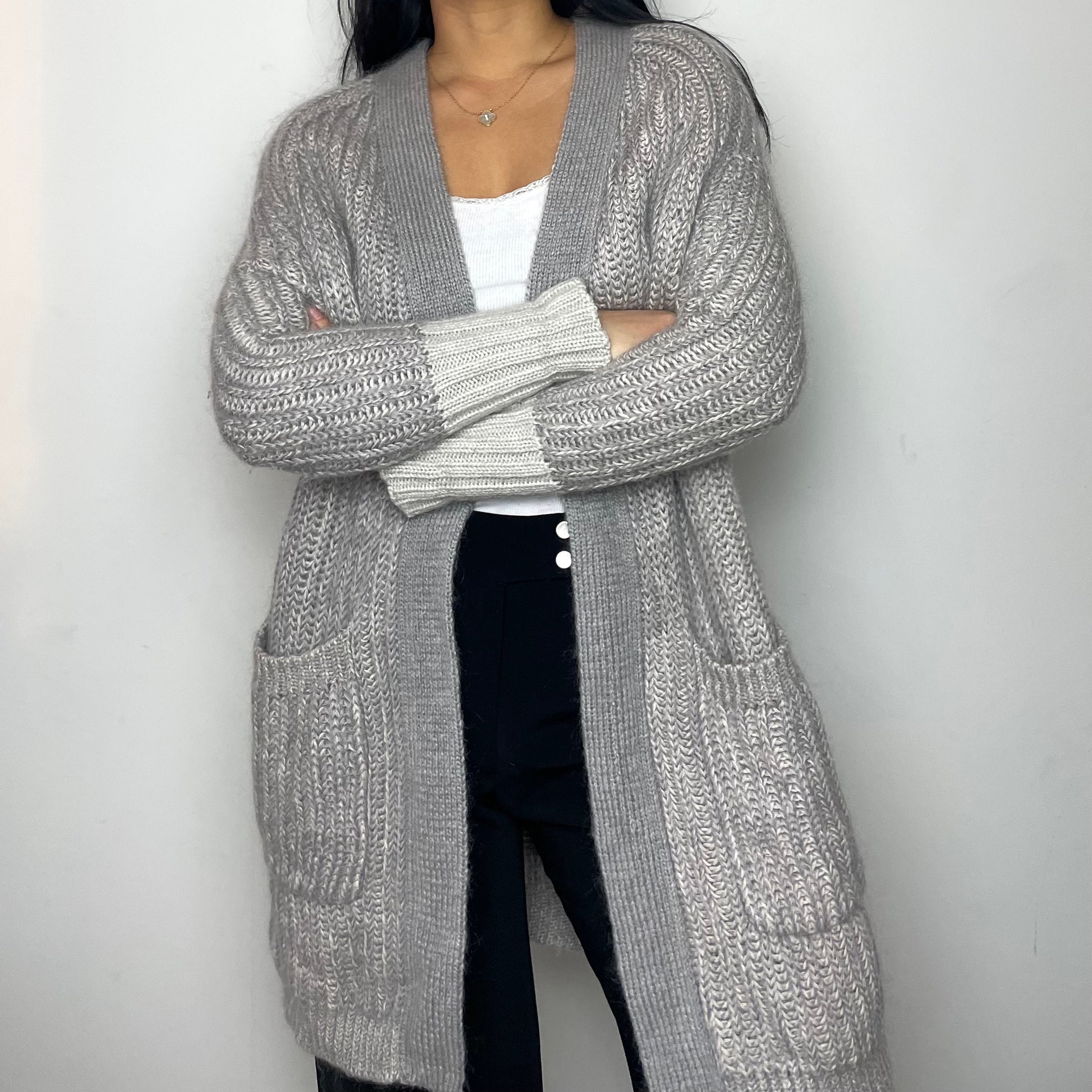 - Details: Grey open longline cardigan; colour block light grey sleeves which can be rolled up; two front pockets; chunky knit