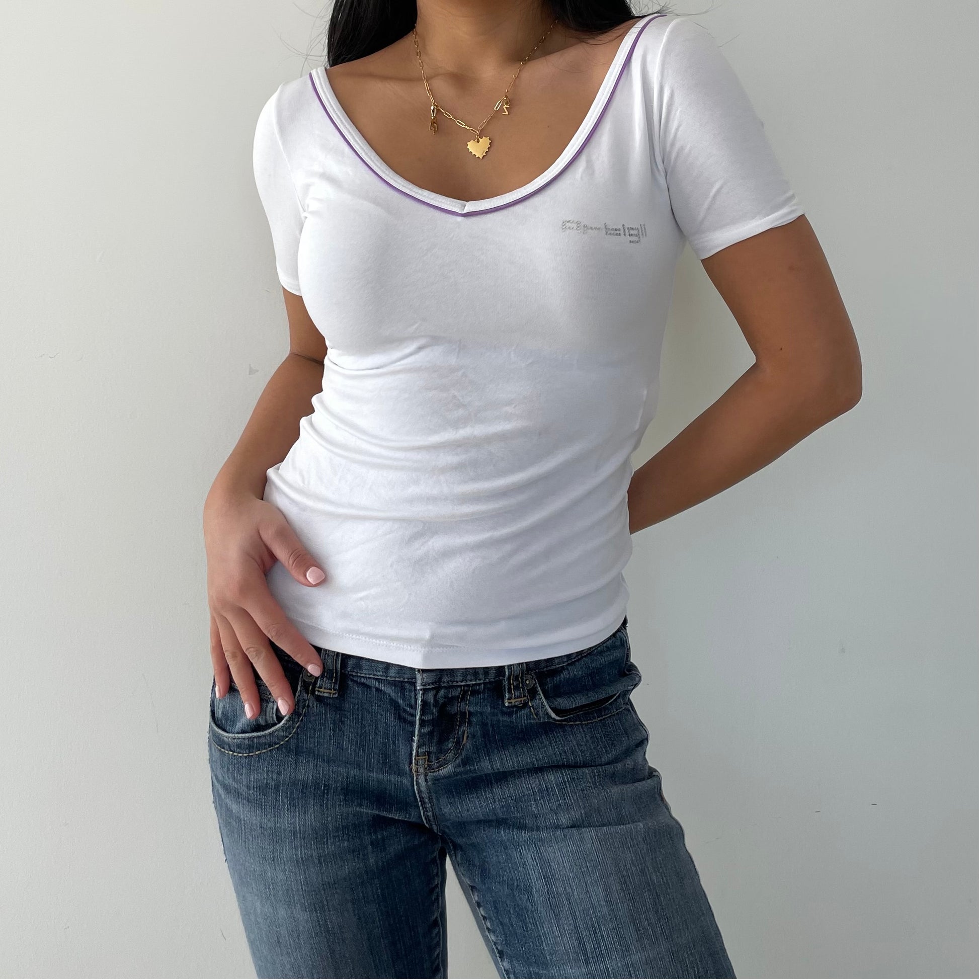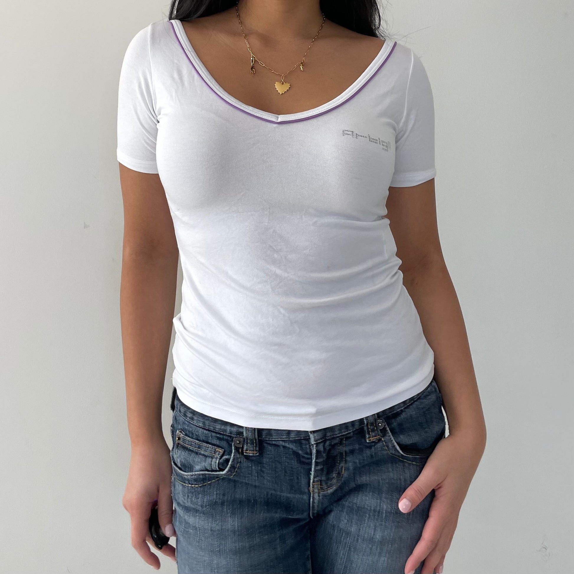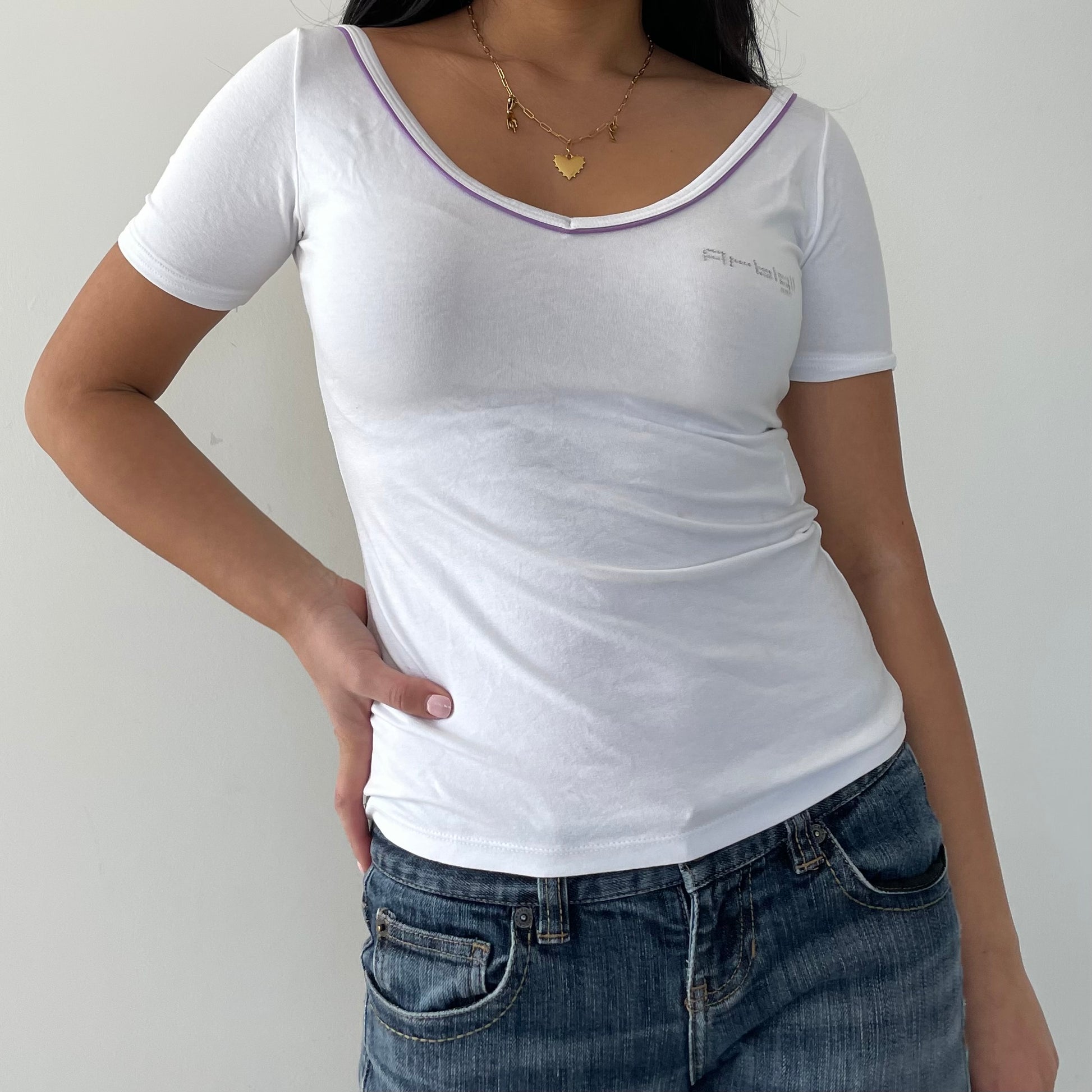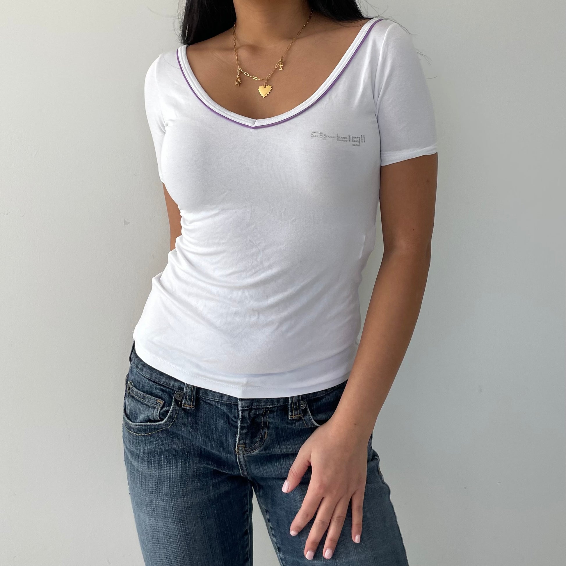 - Details: Short sleeve v-neck tee; purple trim; diamante logo on the left breast; white