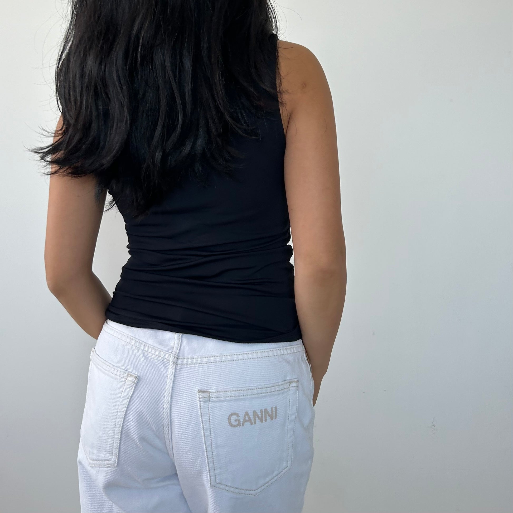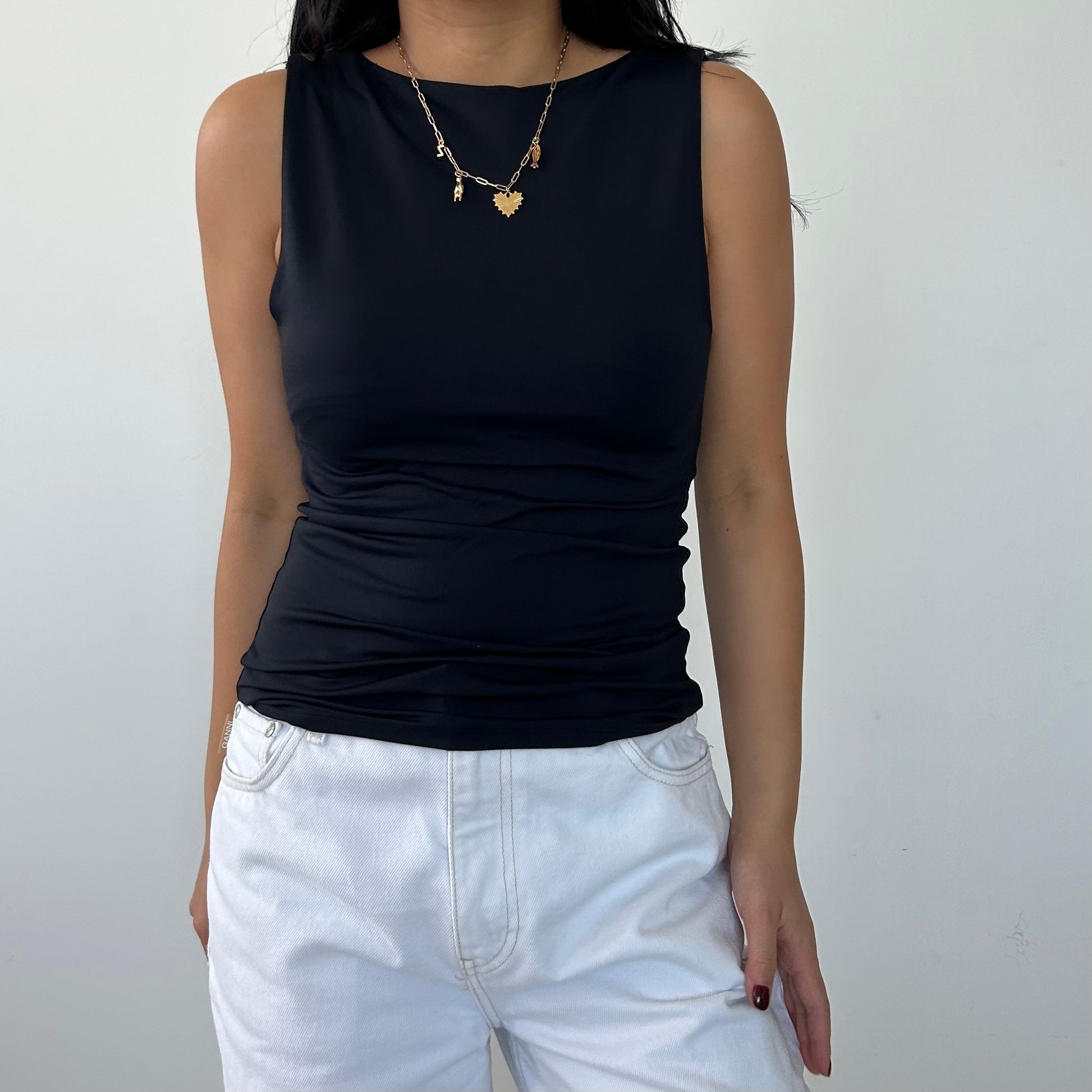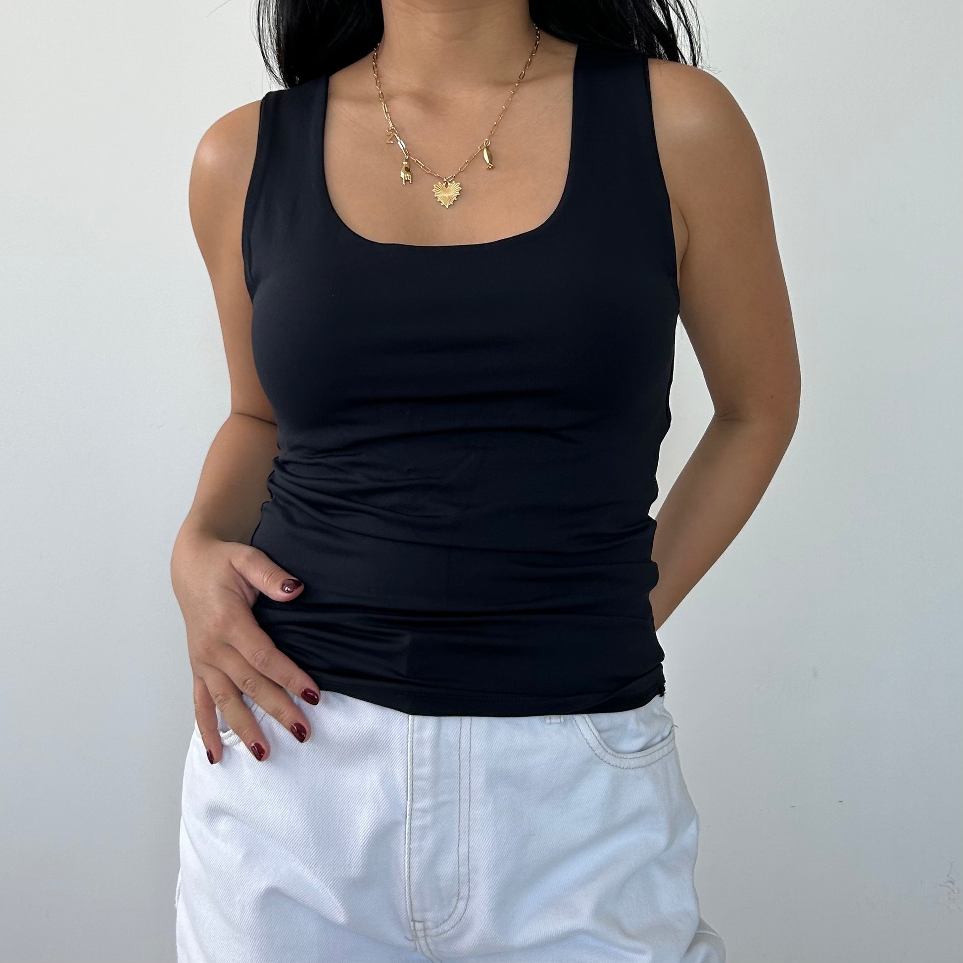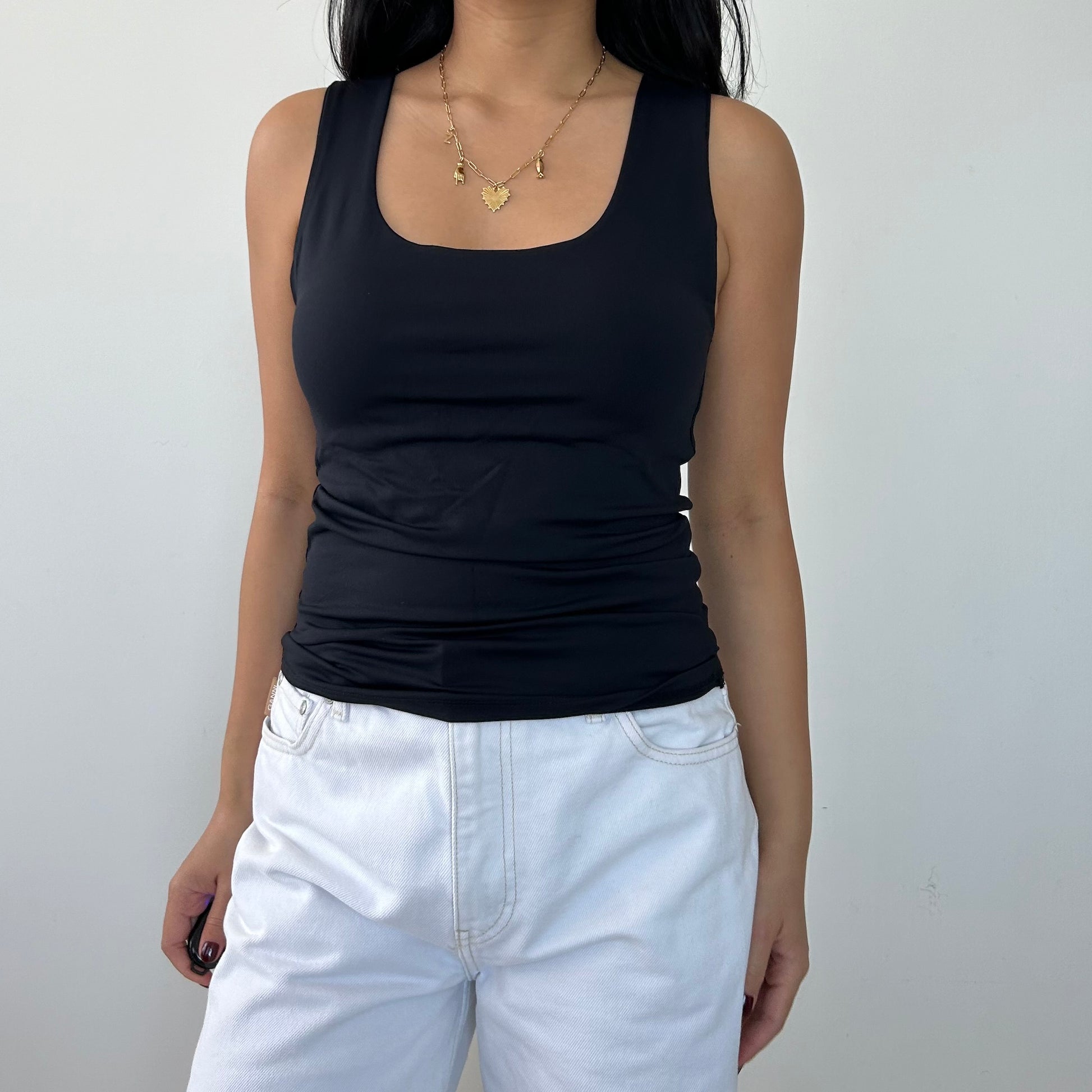 - Details: Black scoop neck tank; stretchy ultra-flattering fabric; can be worn backwards to be high neck; sleeveless