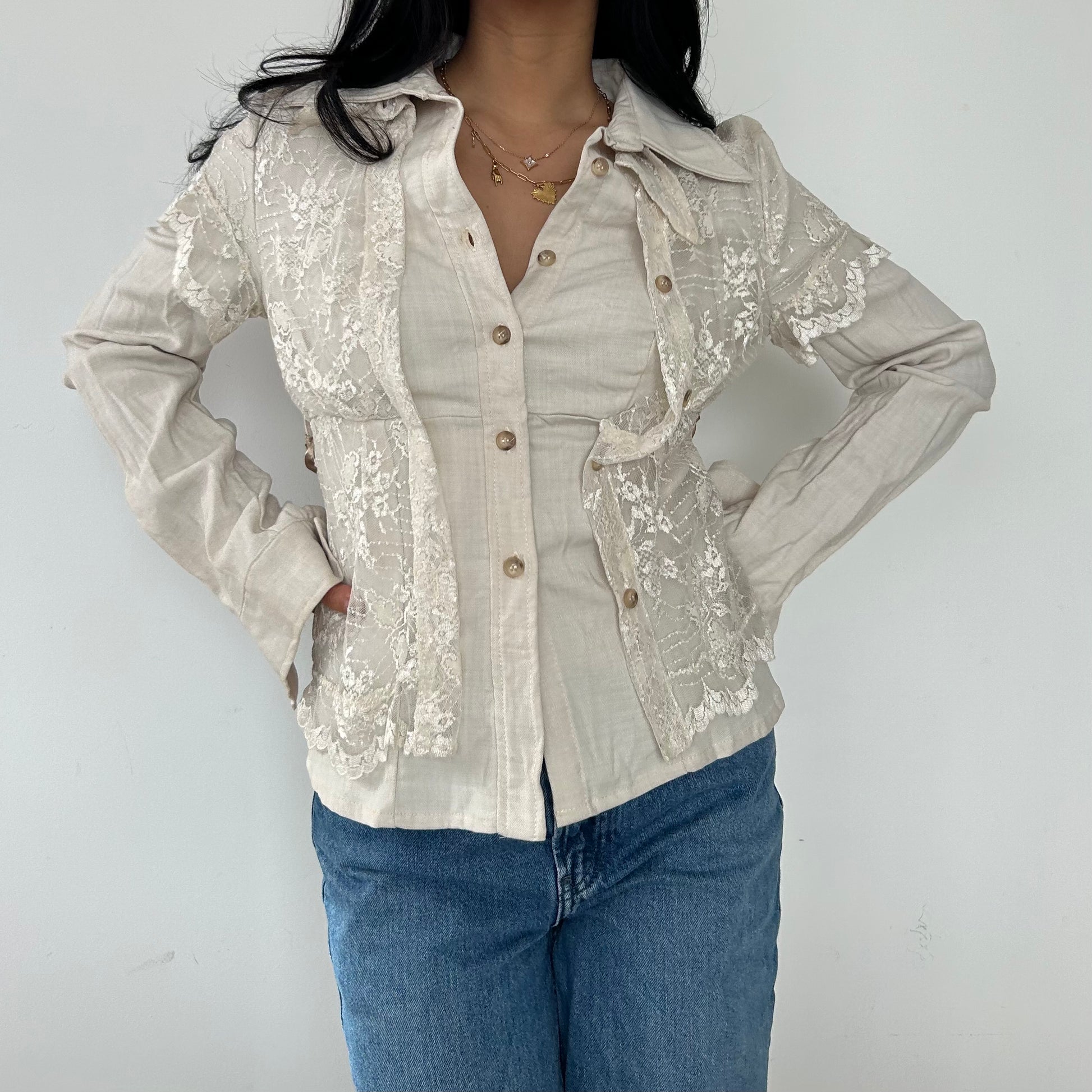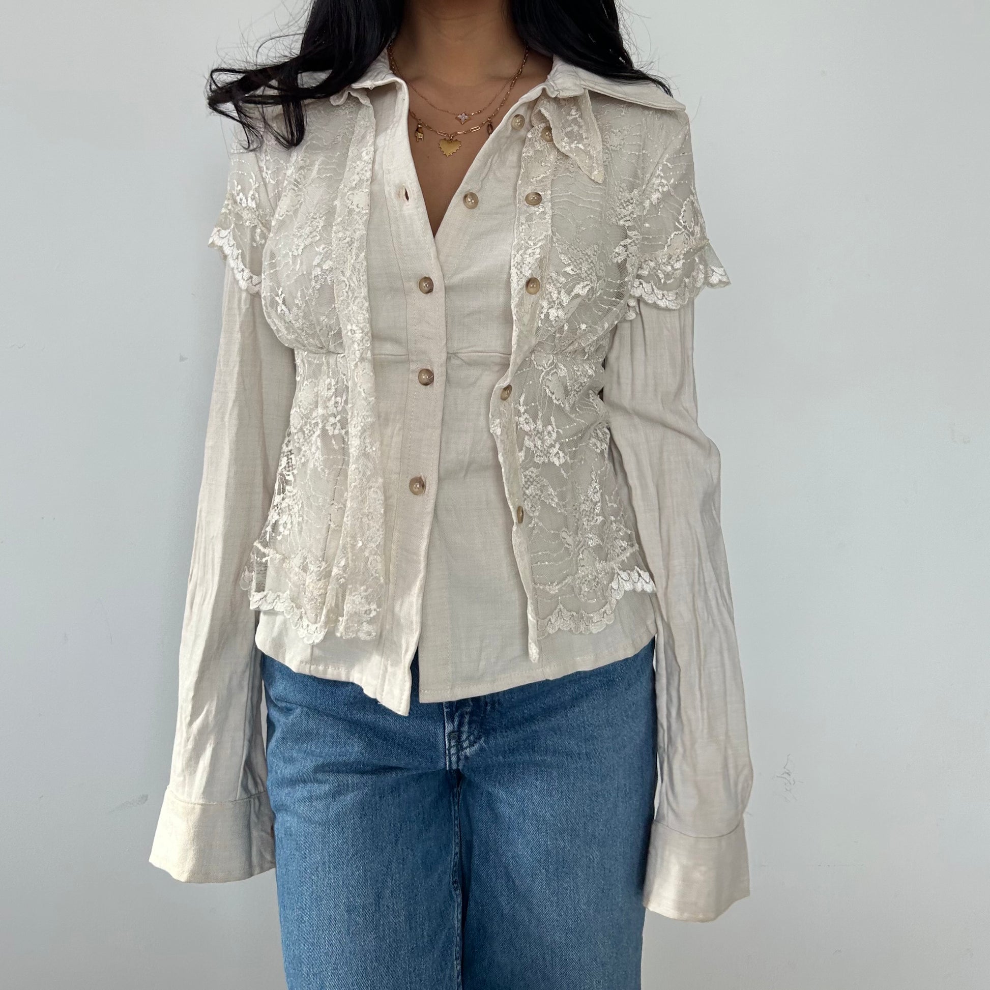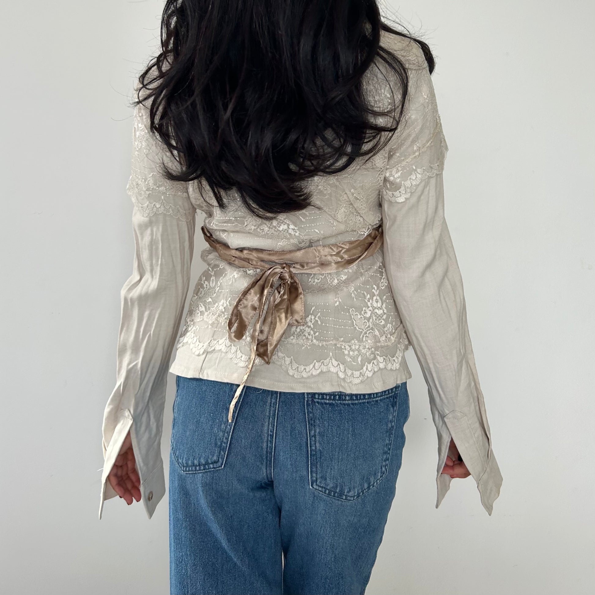 - Details: Long sleeve beige blouse; delicate lace overlay along the shoulders and torso; button-up closure with tonal buttons; pointed collar; exaggerated cuffs; ribbon tie waist on the back; RRP $450 CAD