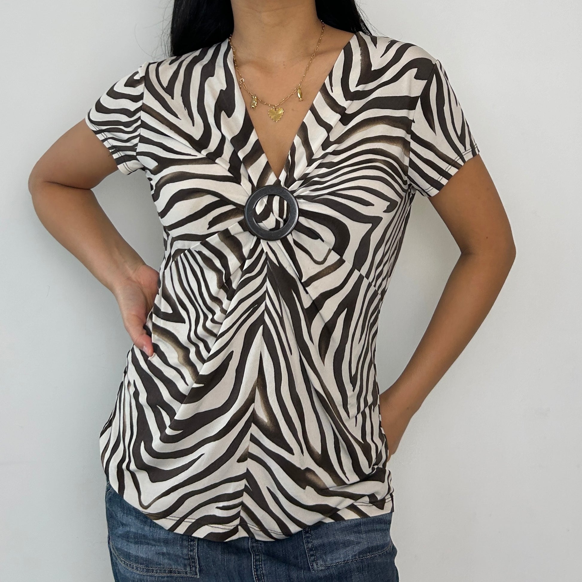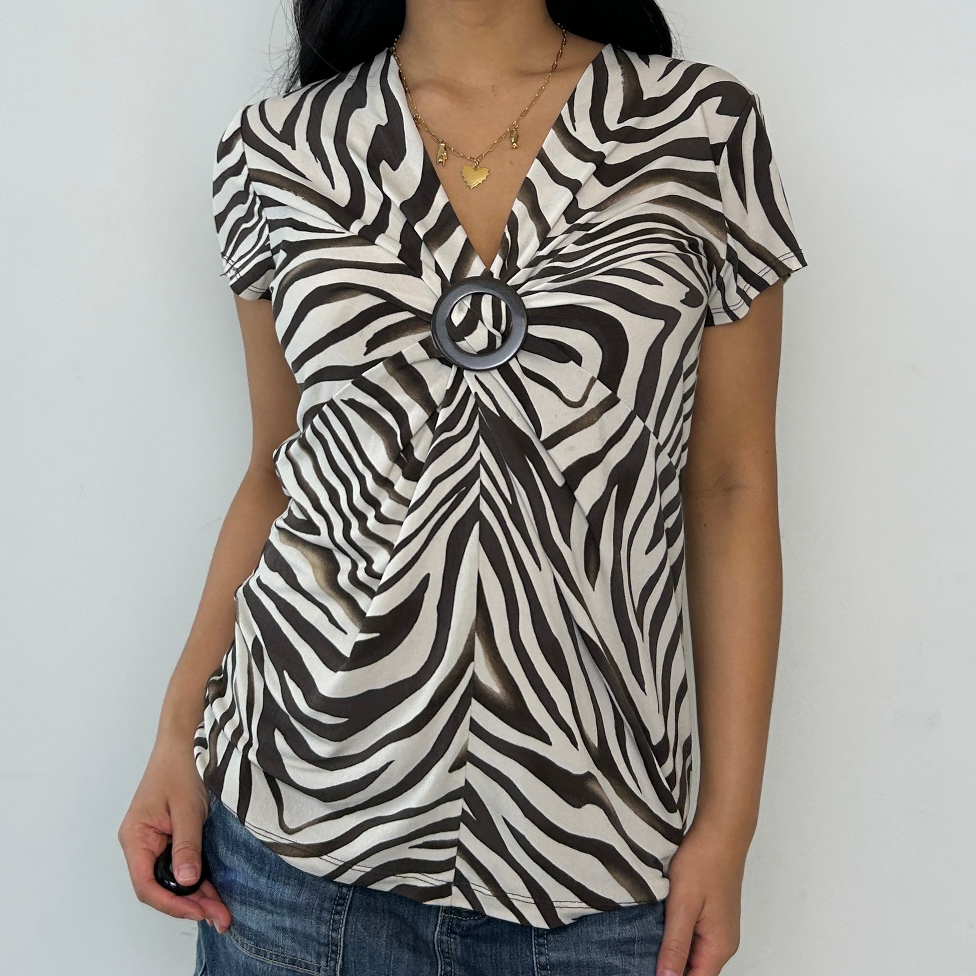 Details: Short sleeve blouse; brown and white zebra print; o-ring in the middle