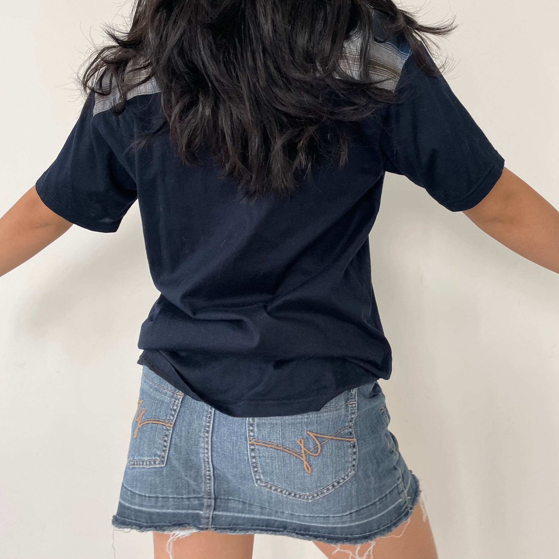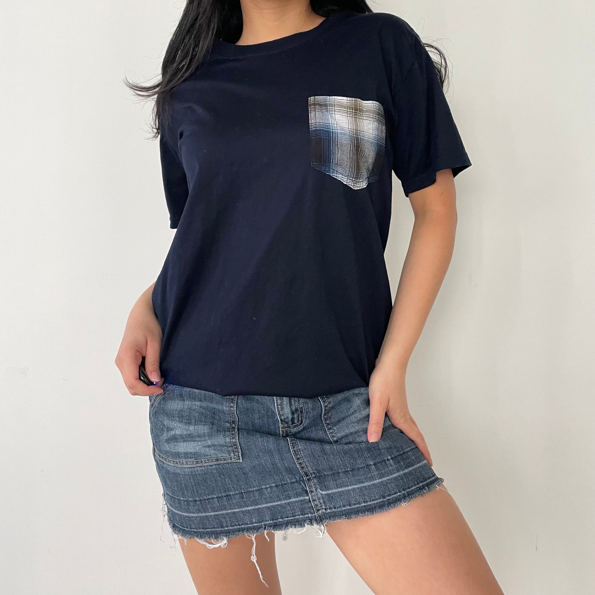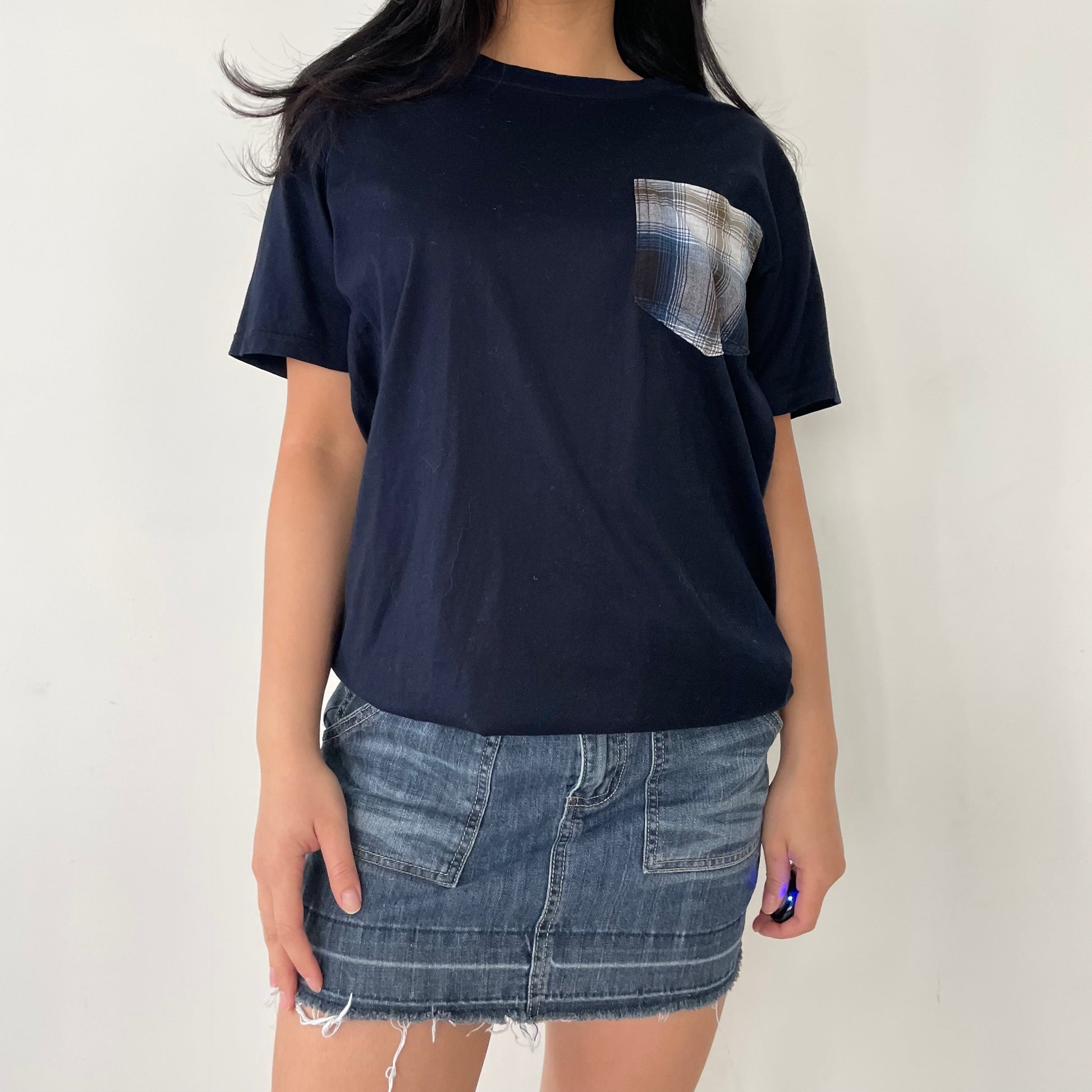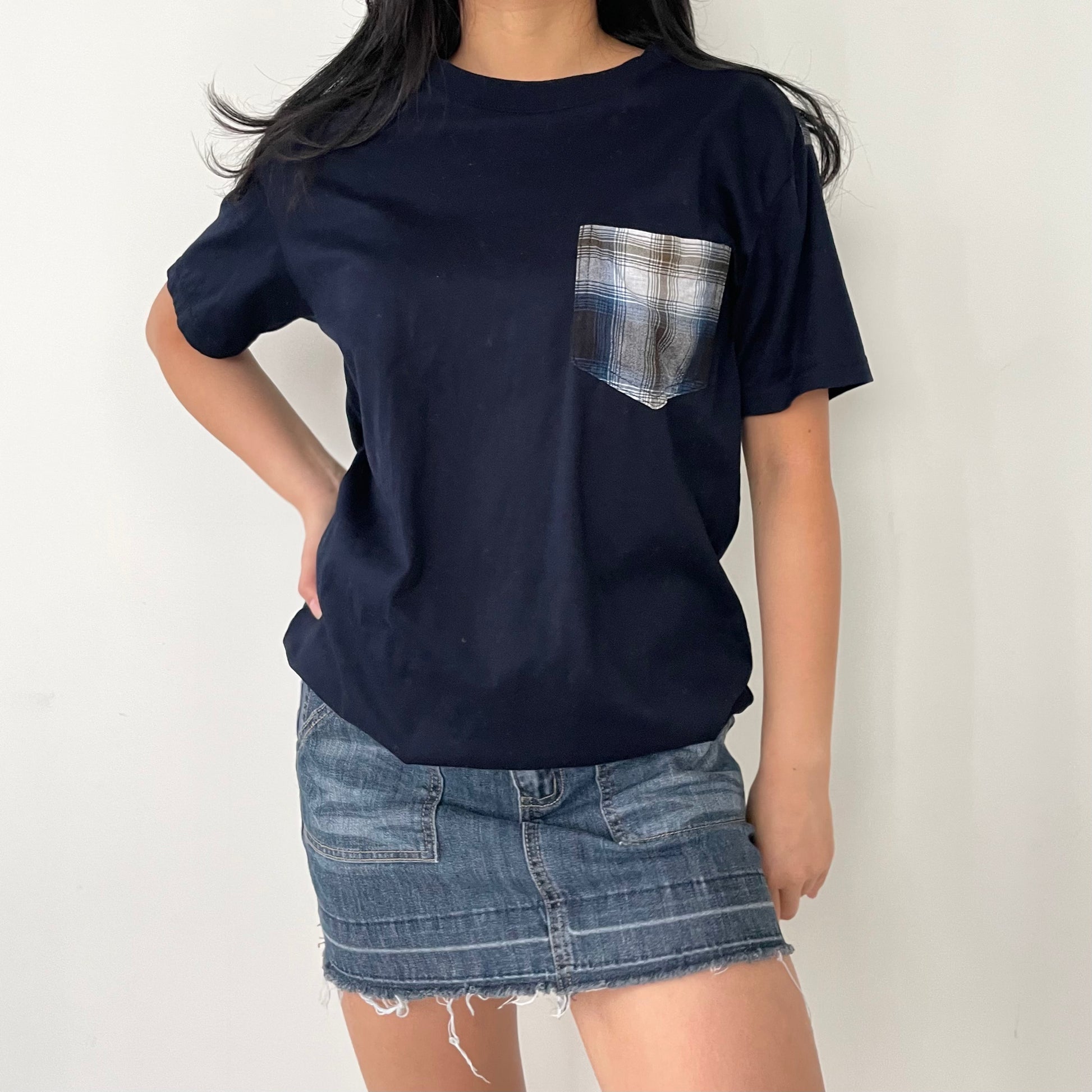 - Details: Navy short sleeve tee; flannel/plaid patterned pocket on the left chest; same patterned print on a panel on the back of the neck