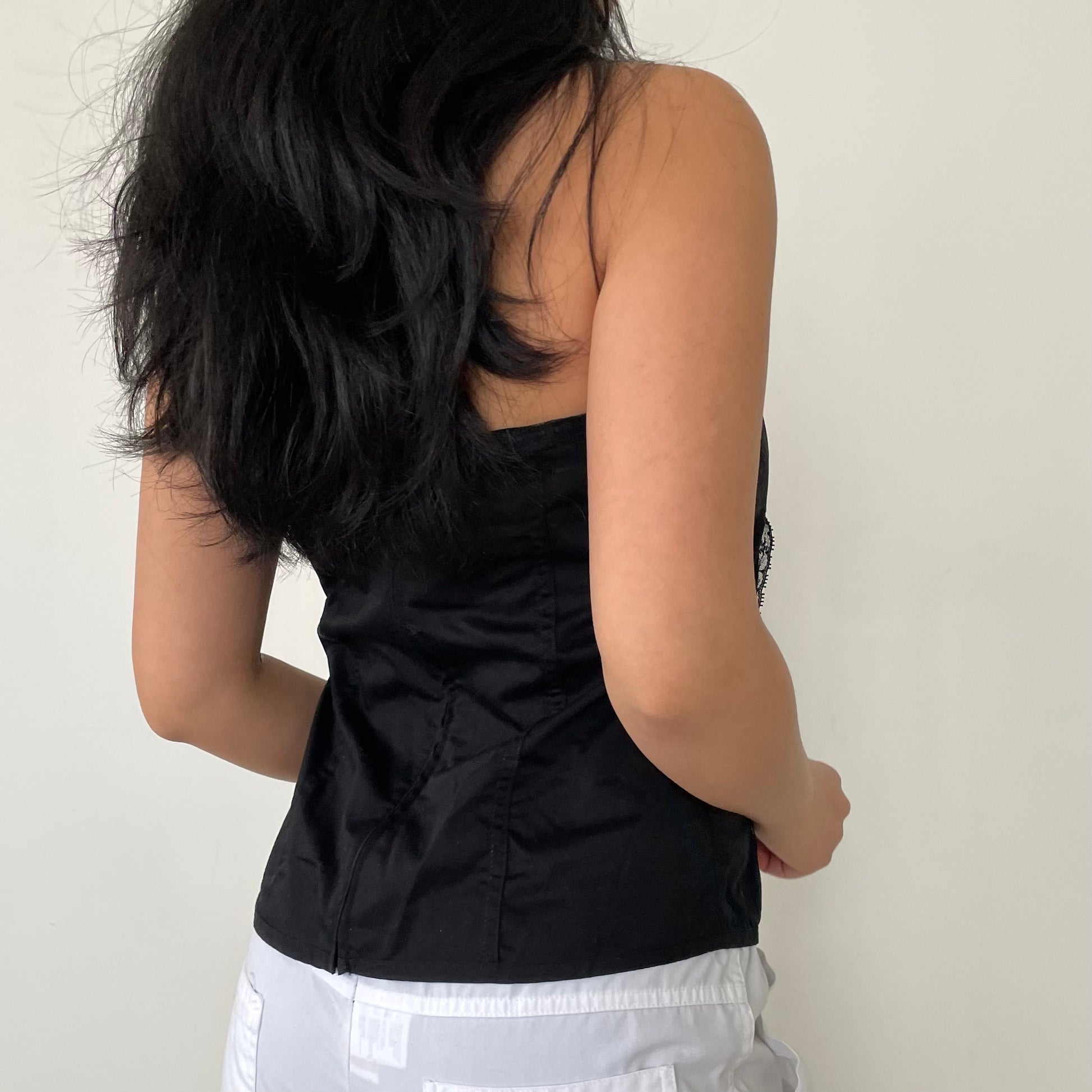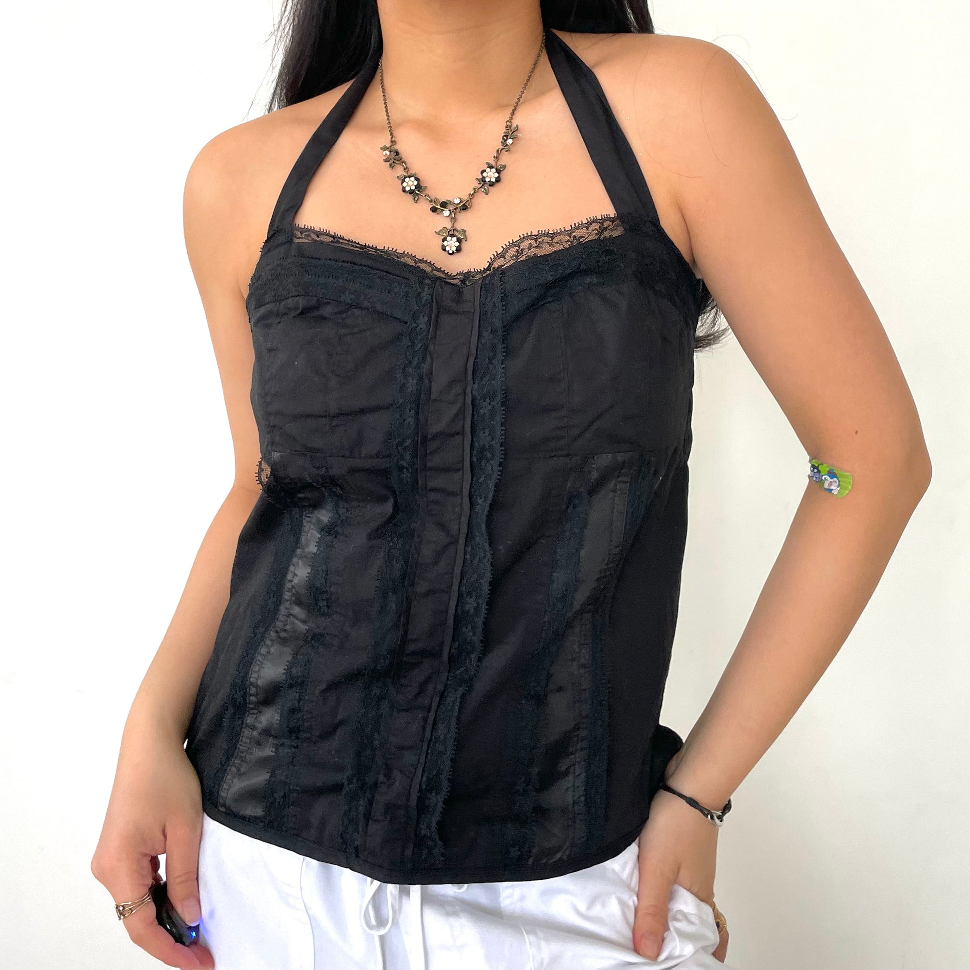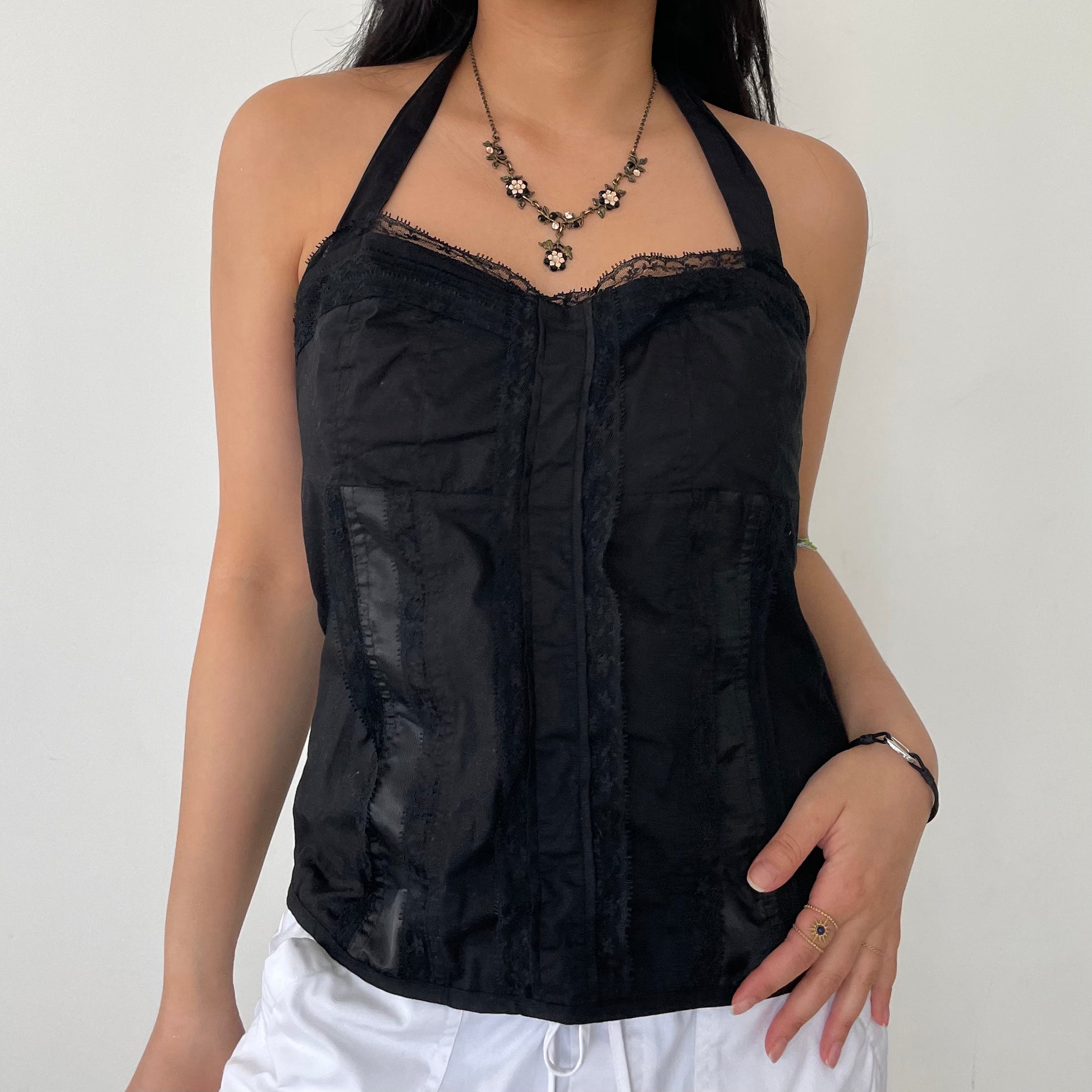- Details: Black lace trim cotton corset style tank with tie back halter neck straps