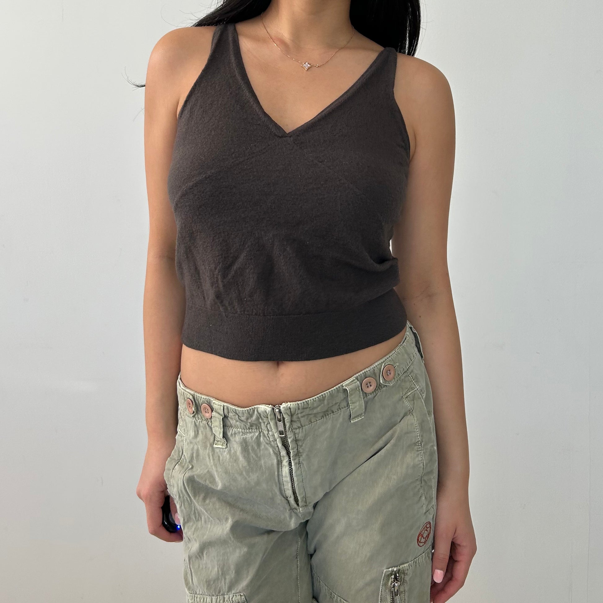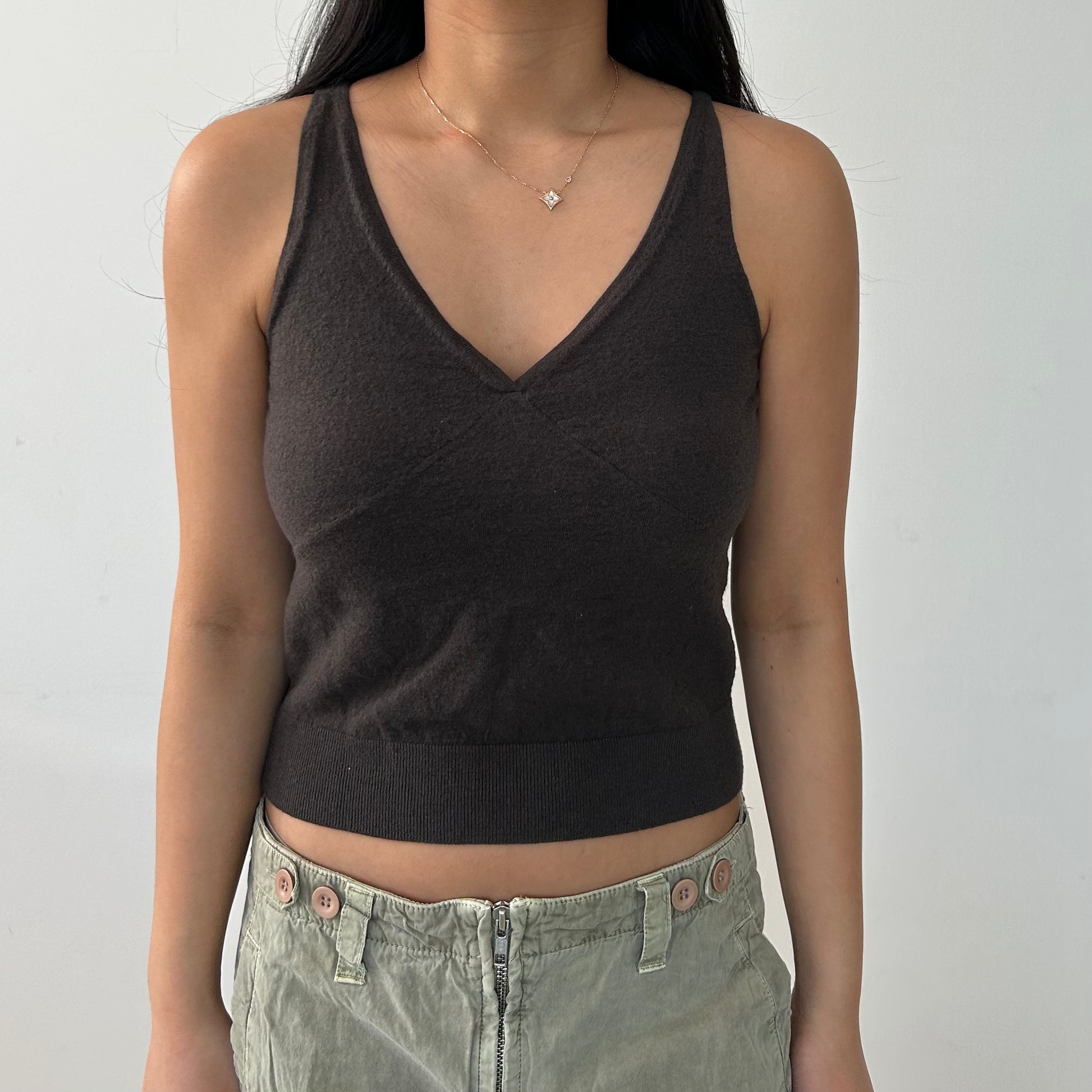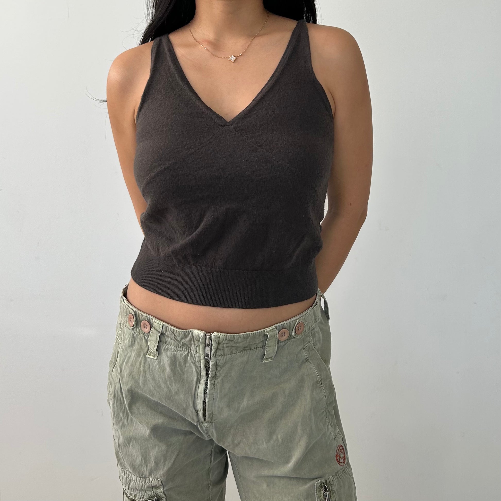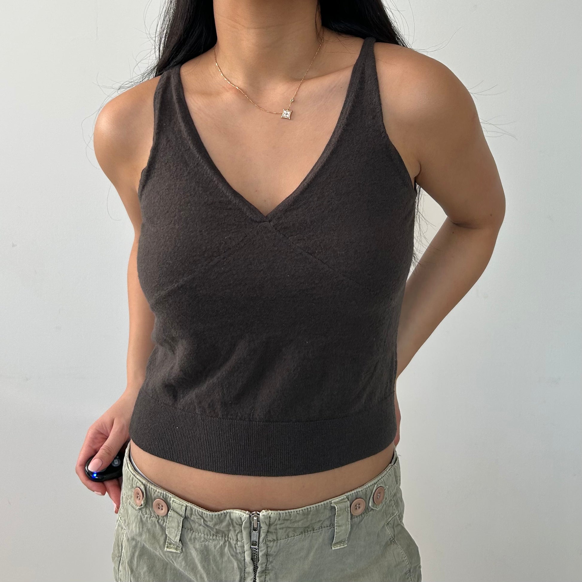 - Details: Taupe v-neck sleeveless top; ribbed hem; cropped