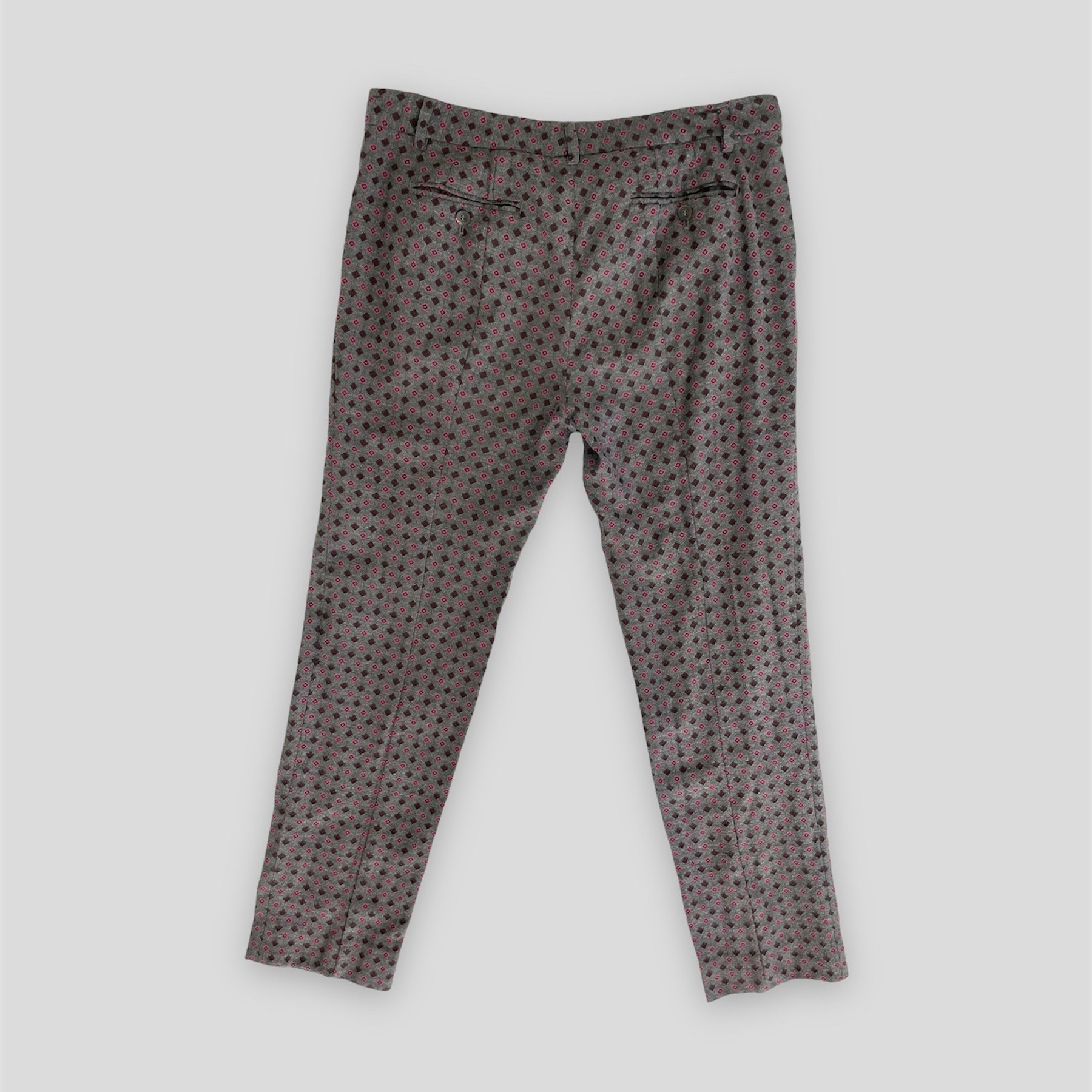 - Details: Pink and burgundy diamond print; grey straight leg trousers; concealed zip and button closure; two side pockets; two back pockets with buttons; belt loop details; mid-rise; embroidered accent