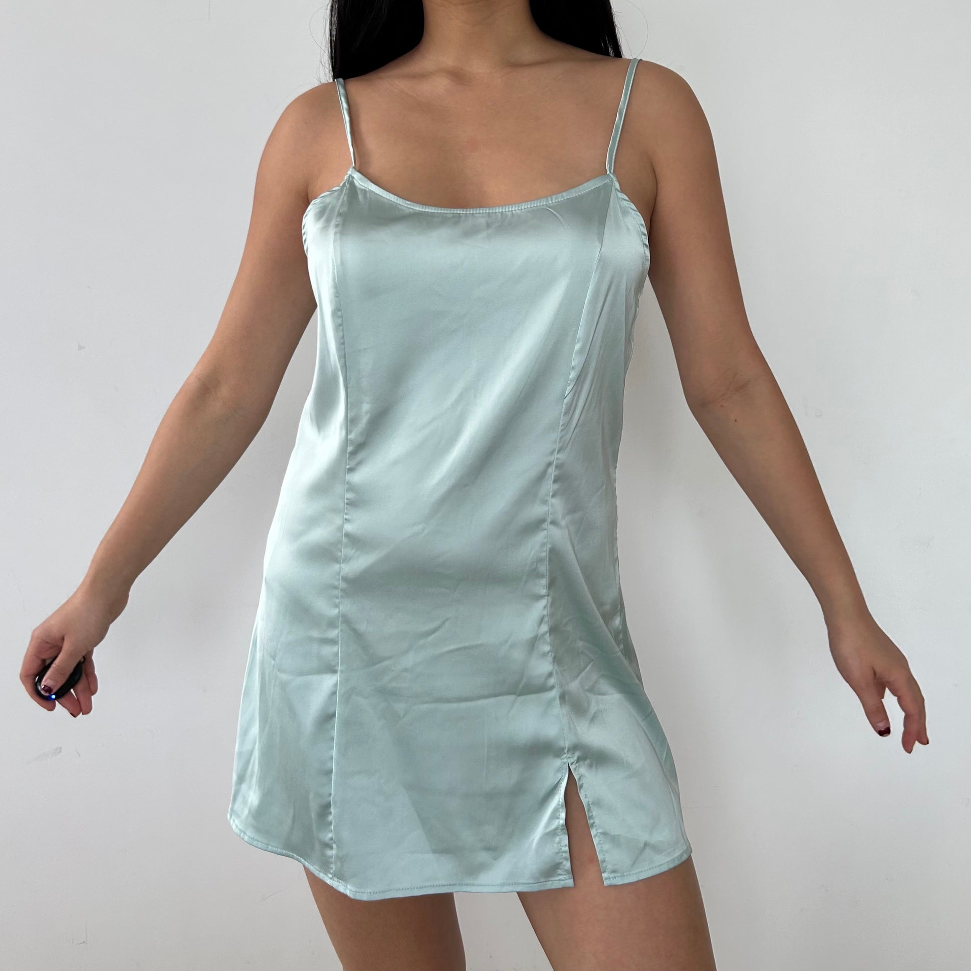 - Details: Green satin mini slip dress; adjustable spaghetti straps; small leg slit near the hem