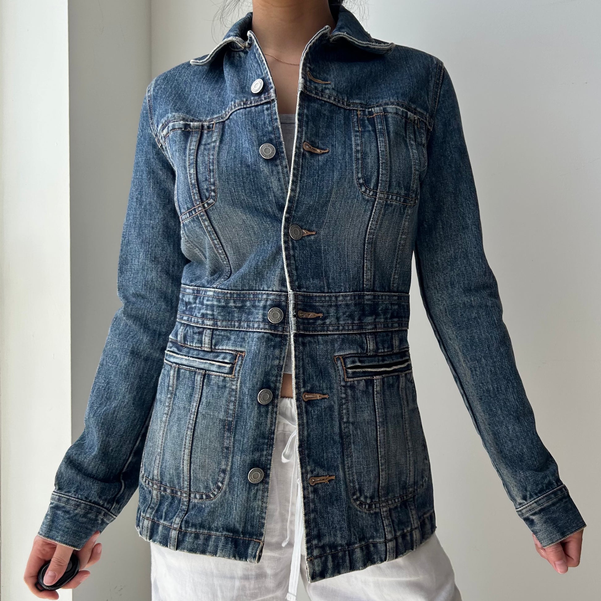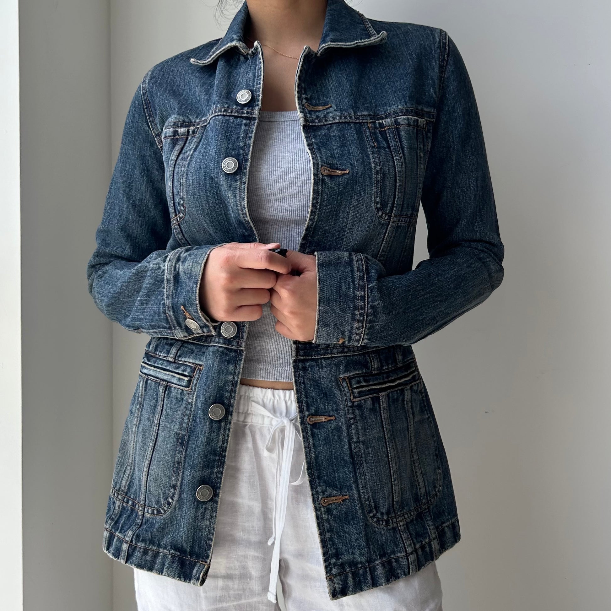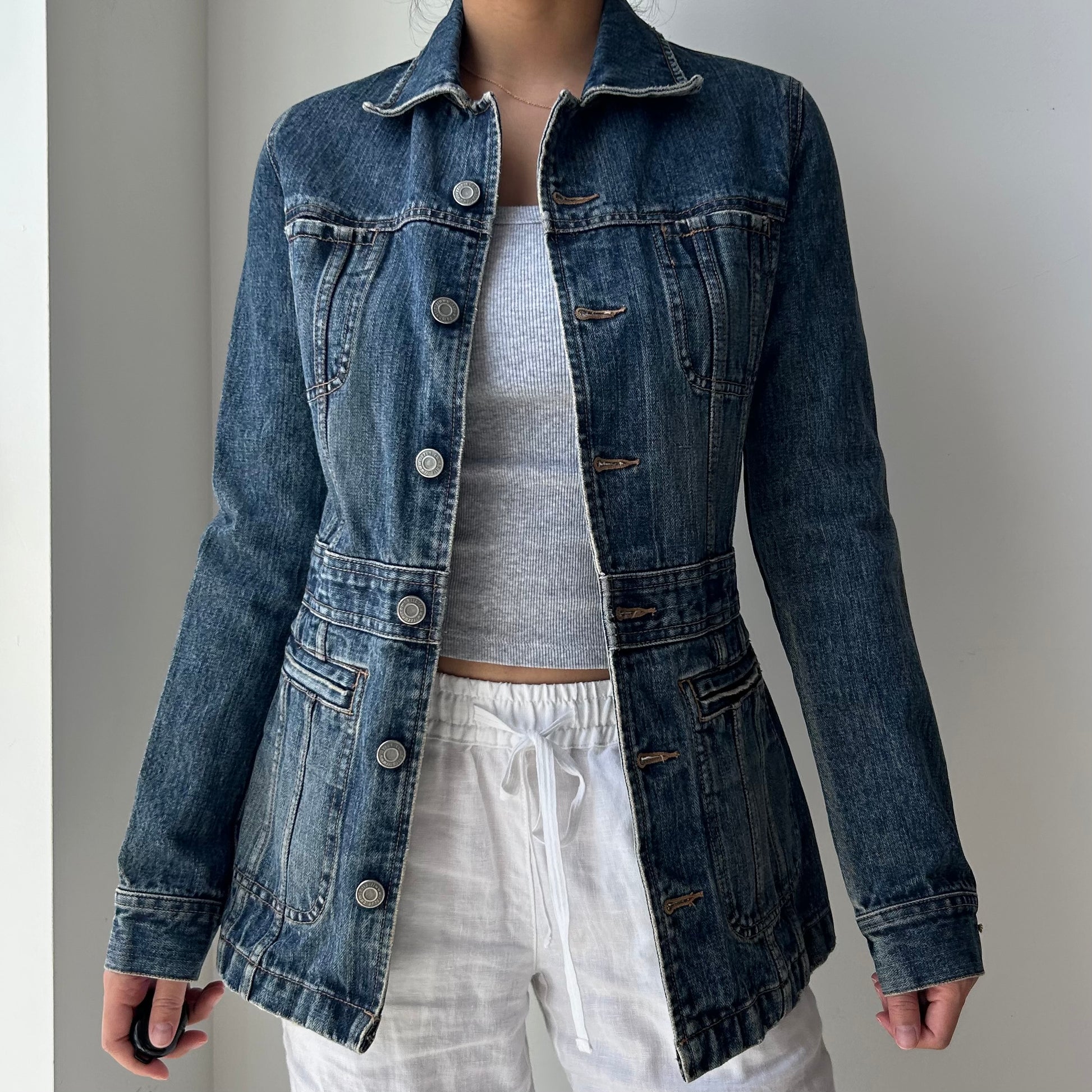 - Details: Structured silhouette with darted seaming; rich indigo wash with subtle fading; button front closure with contrast topstitching; double welt pockets at waist; heavyweight cotton denim