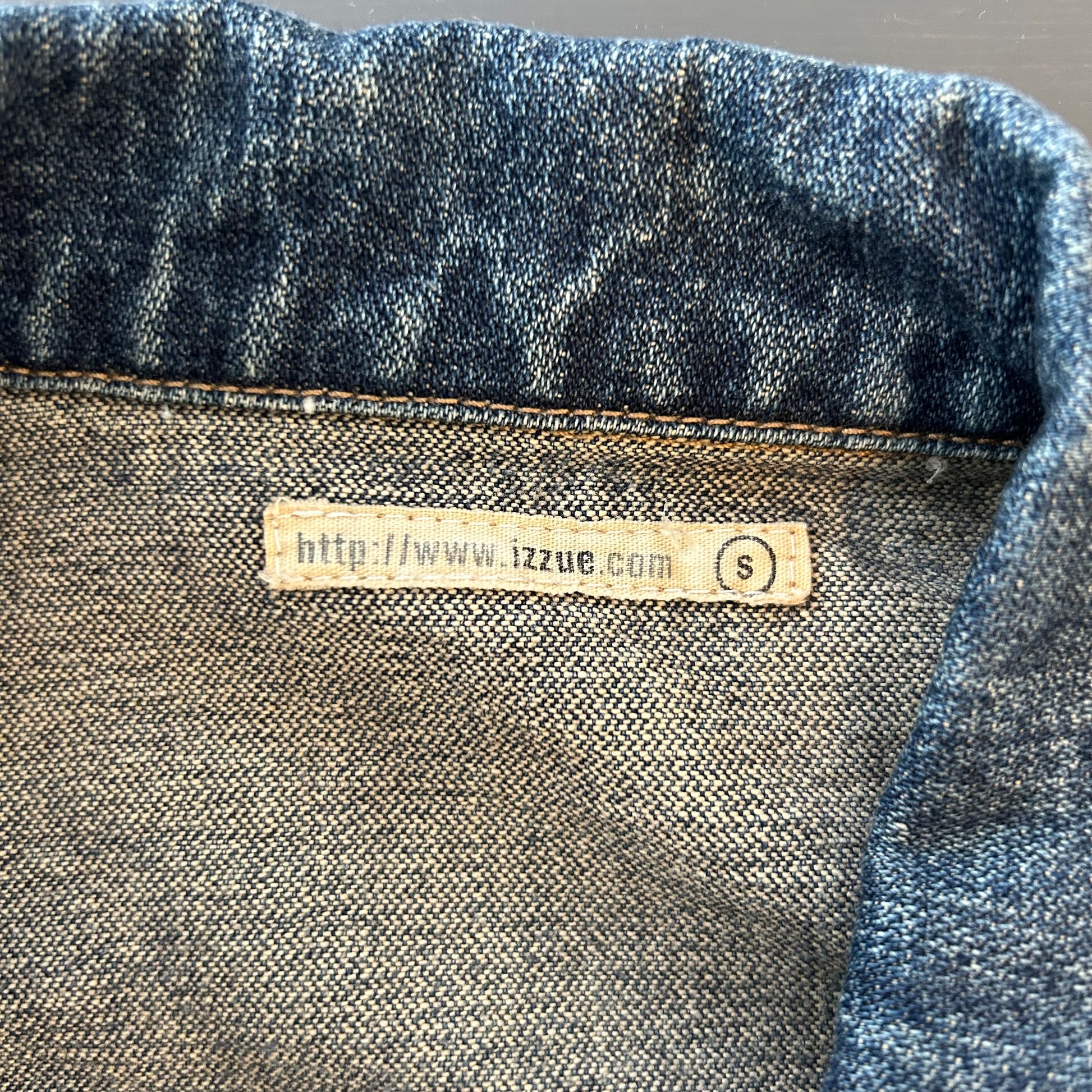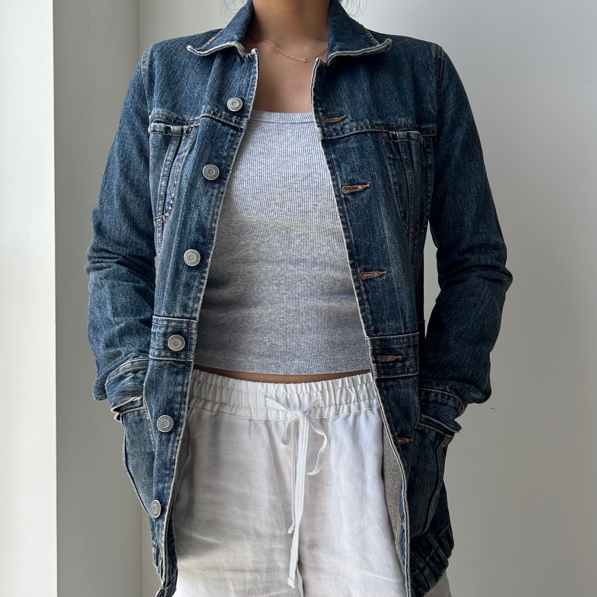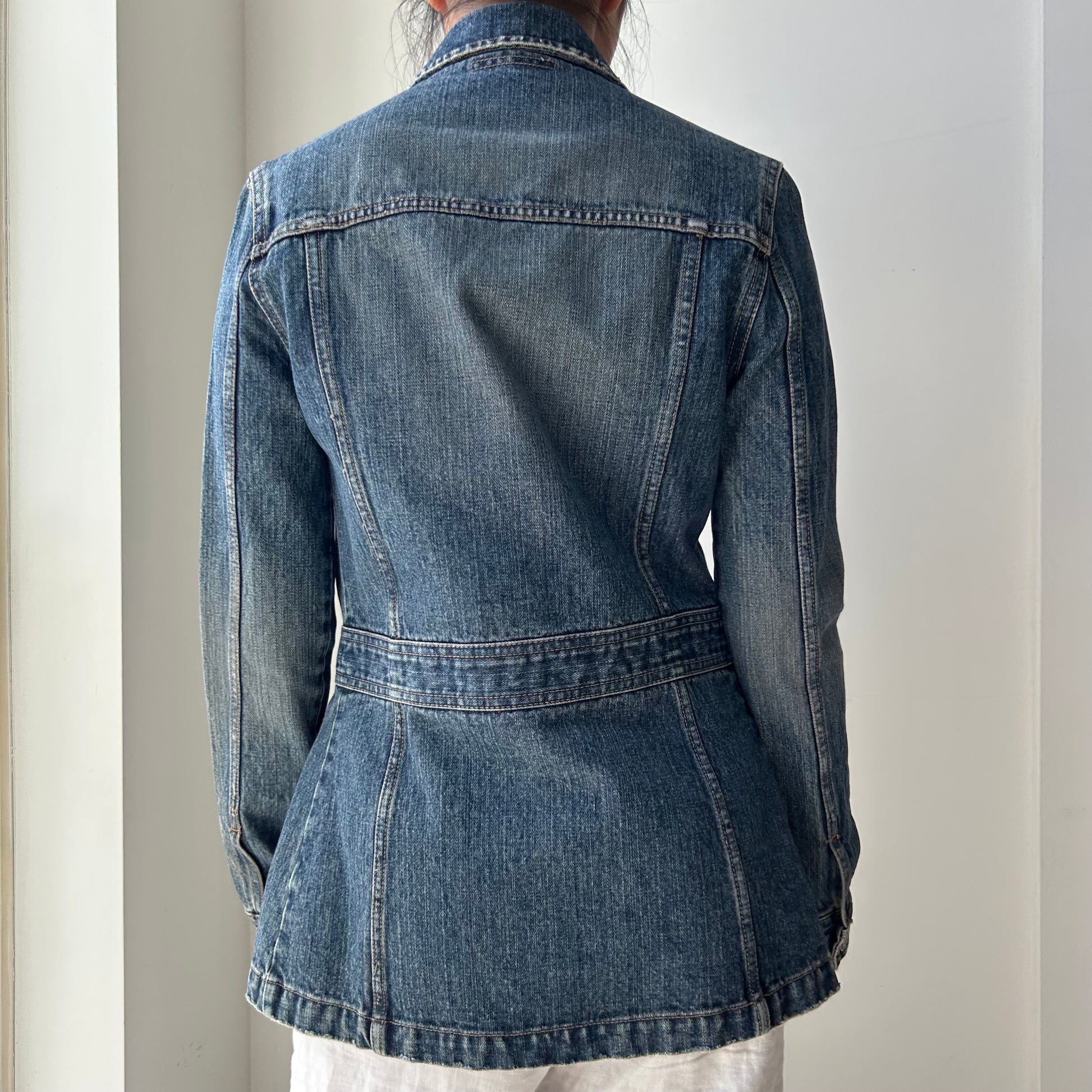 - Details: Structured silhouette with darted seaming; rich indigo wash with subtle fading; button front closure with contrast topstitching; double welt pockets at waist; heavyweight cotton denim