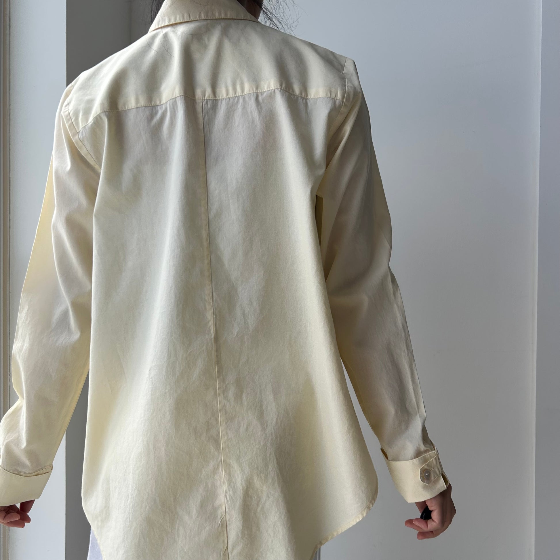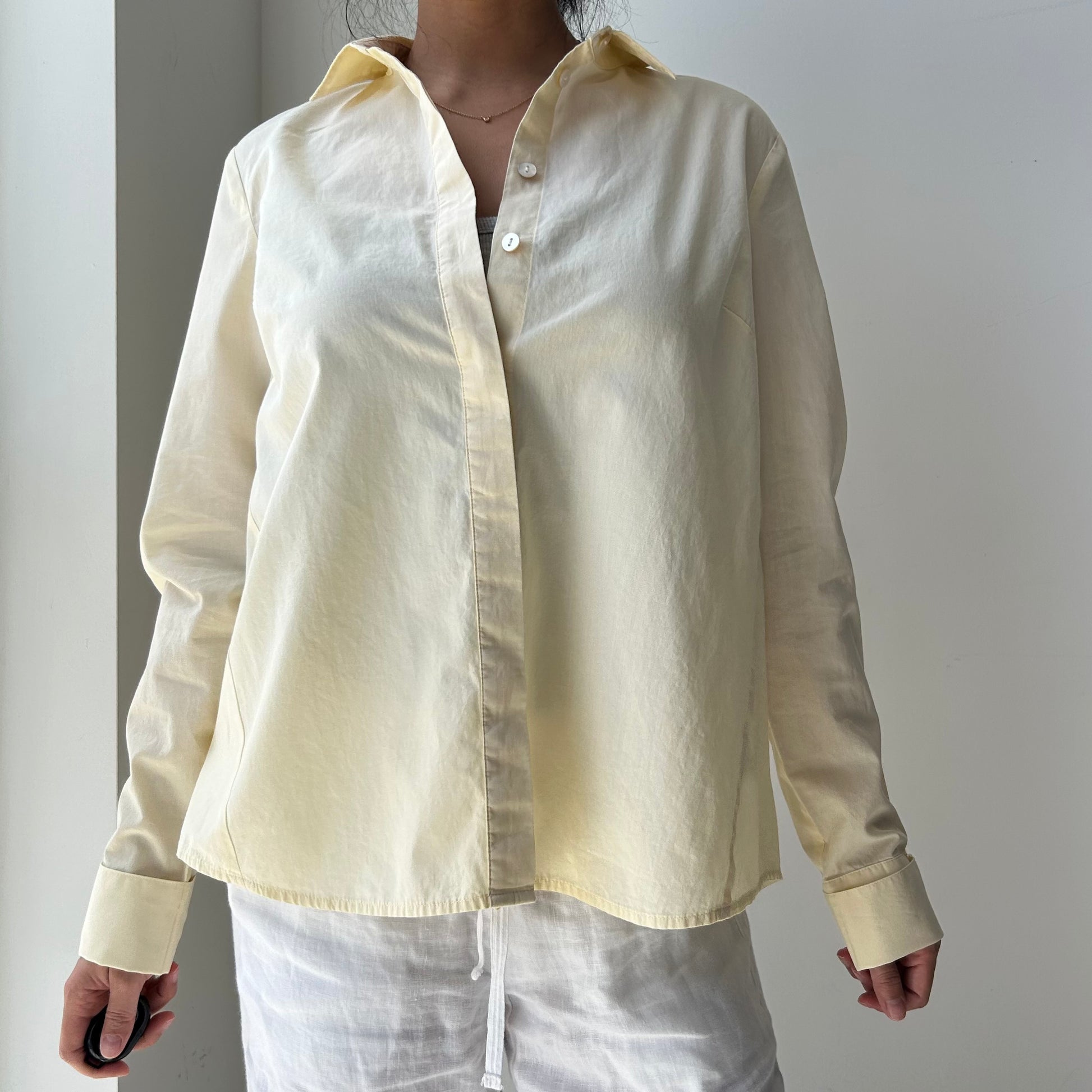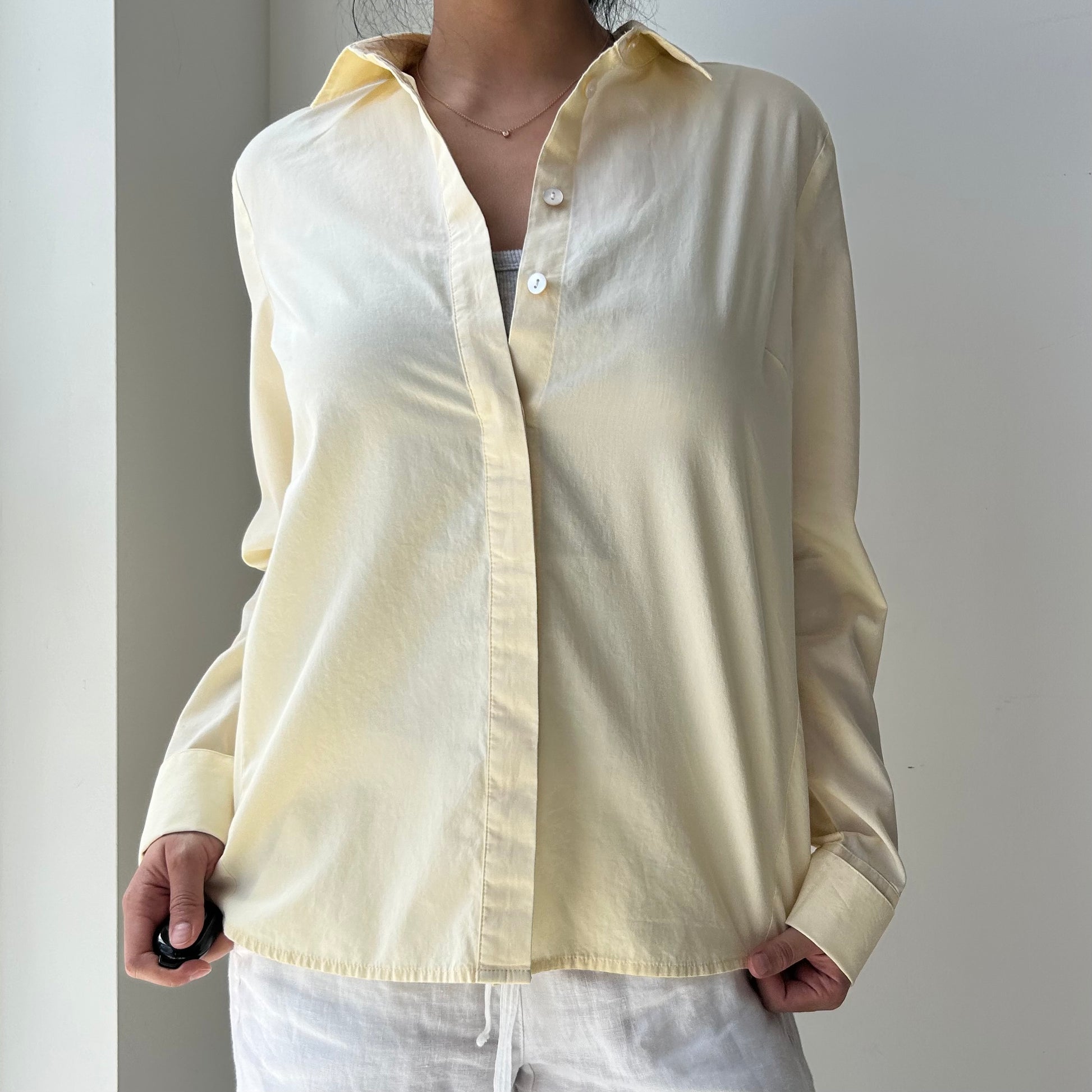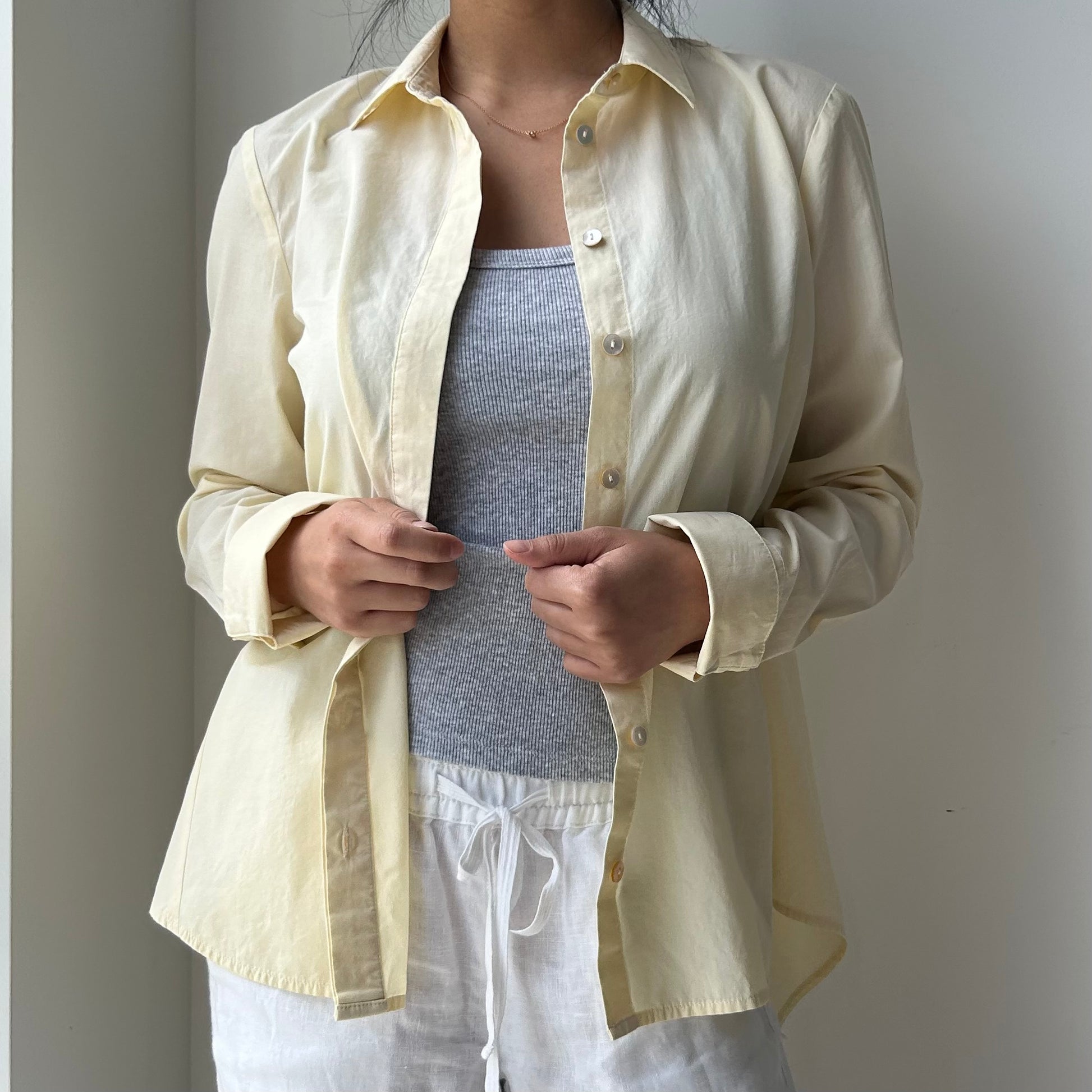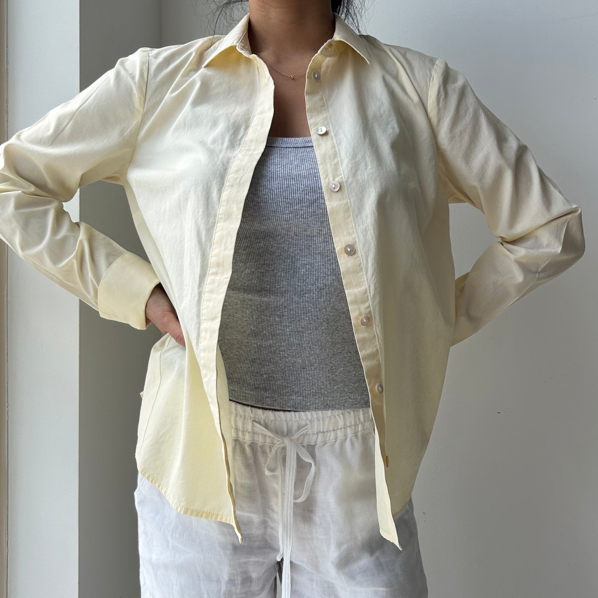 - Details: Butter yellow button up long sleeve shirt; concealed button placket
