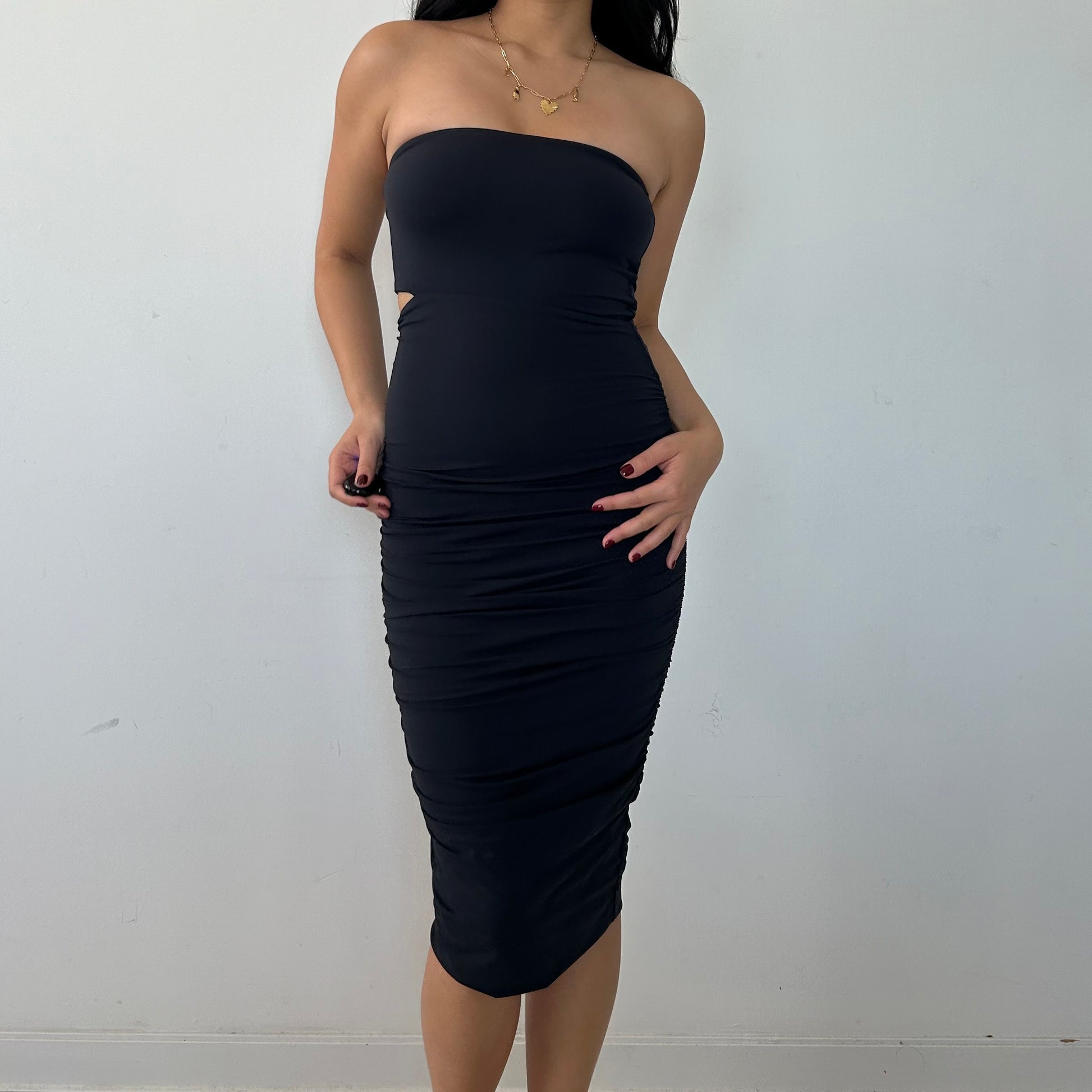 - Details: Black strapless bodycon midi dress; side cutout near the right bust; double lined; ruched sides; super flattering cut; stretchy material
