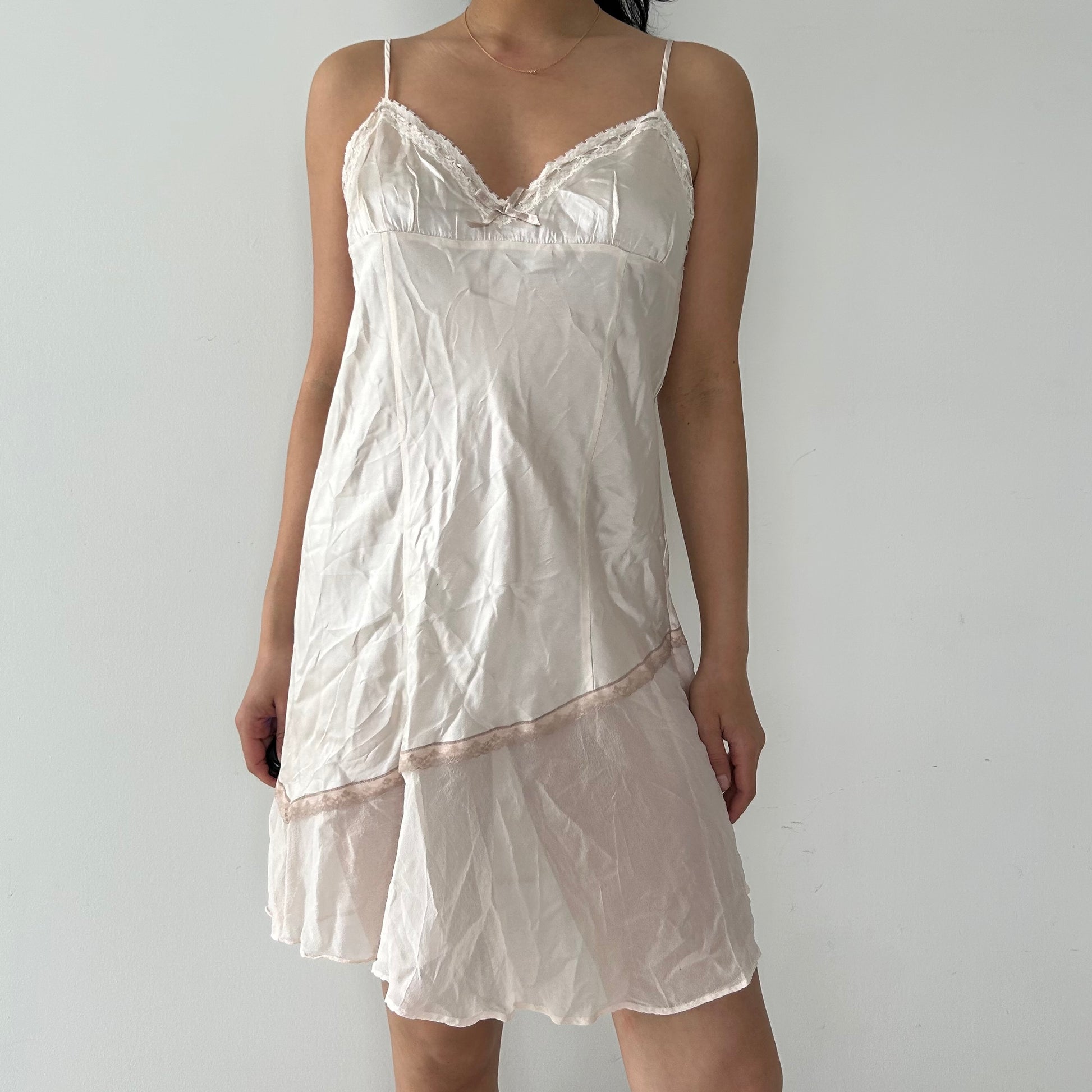- Details: Mini silk slip dress in pearlescent white; v-neckline; adjustable straps; bow detail at bust; lace trim; sheer asymmetrical hem
