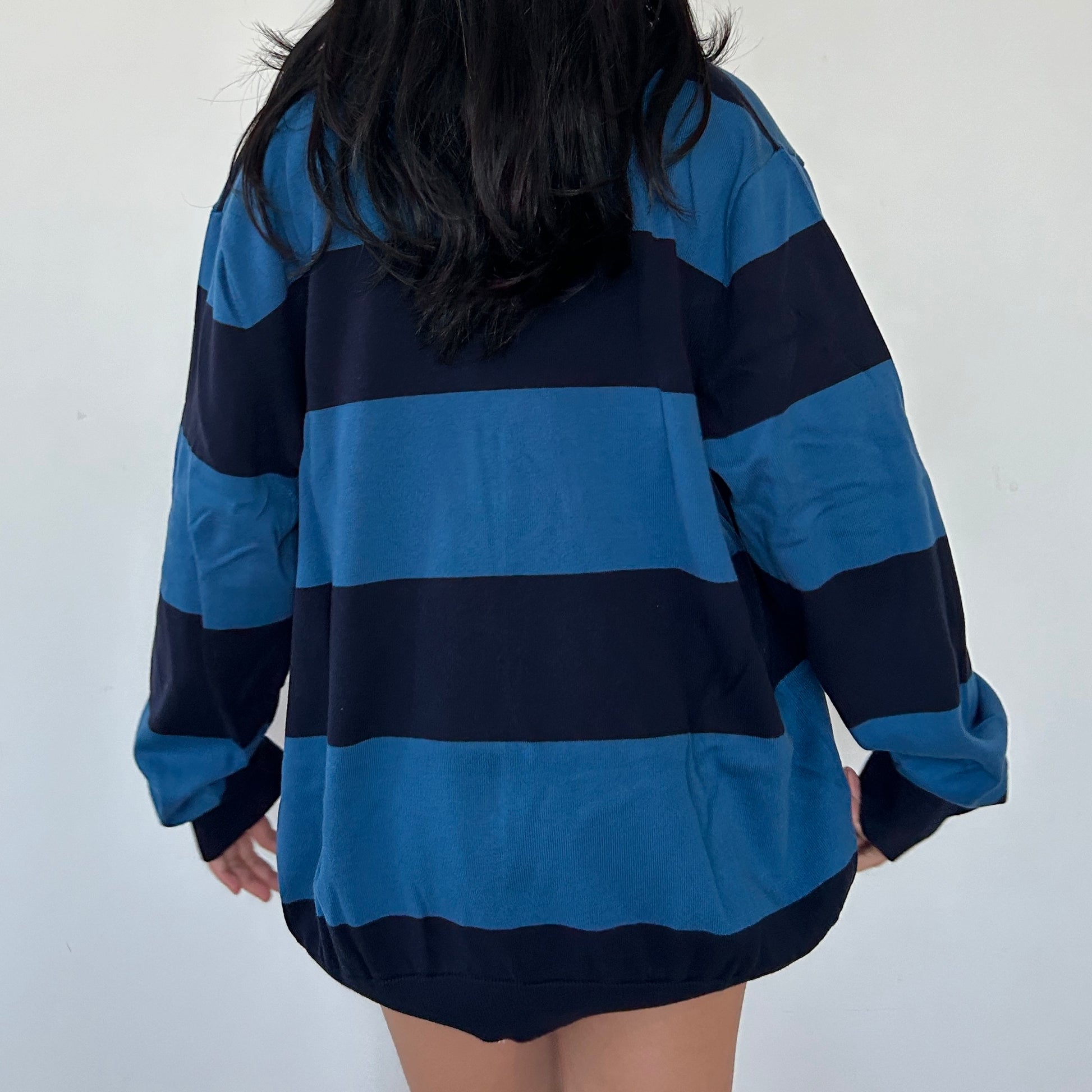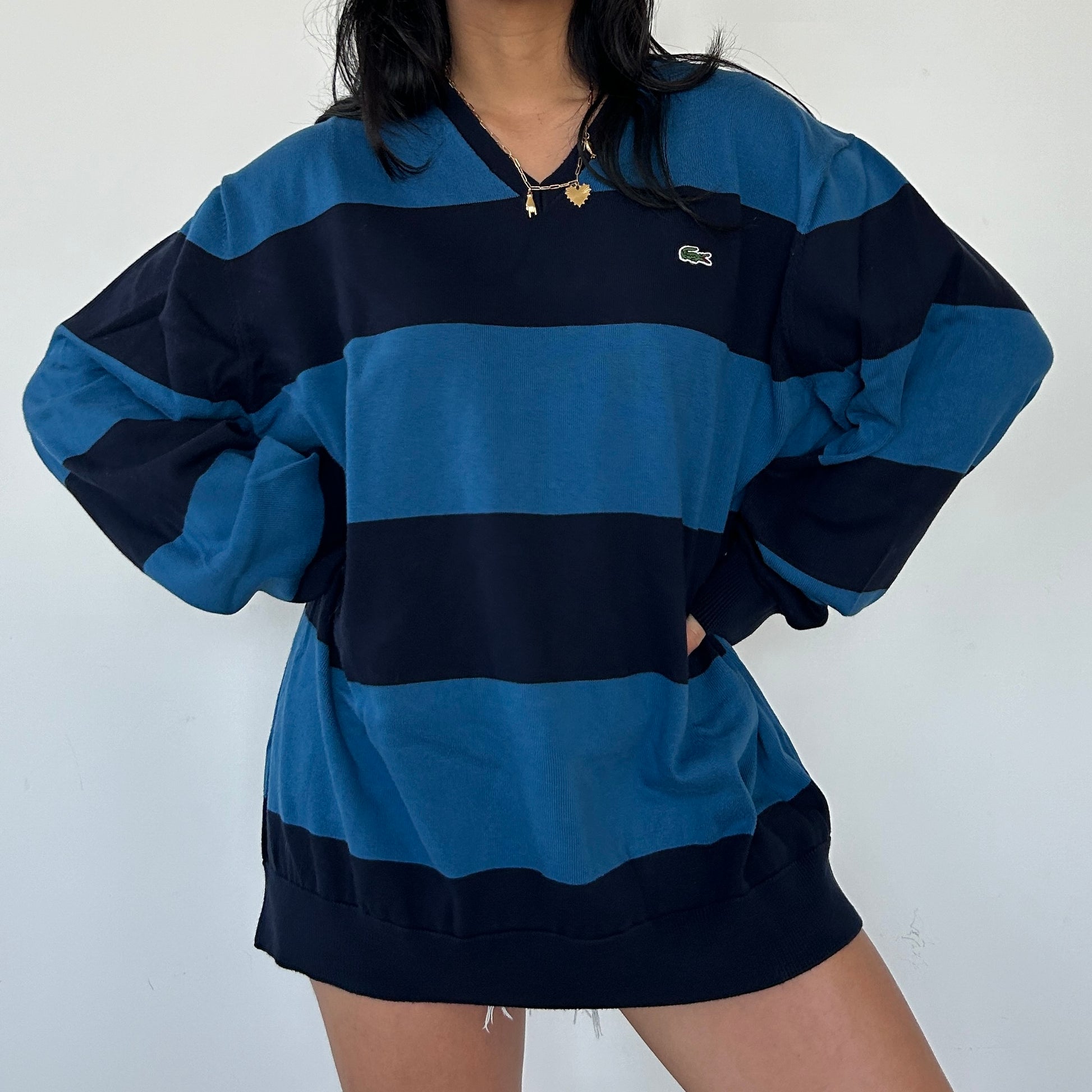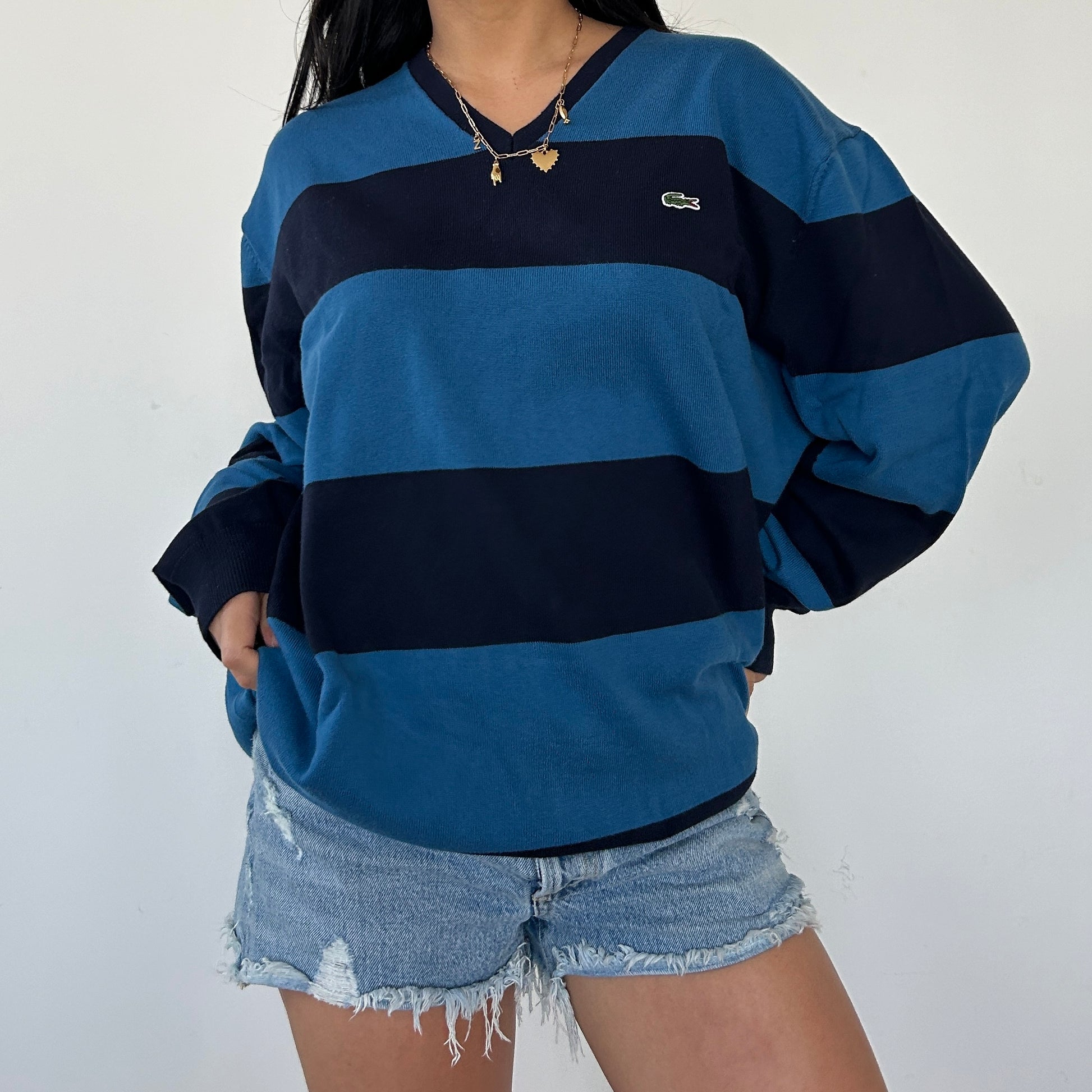 - Details: Blue striped v-neck knit; long sleeves; signature embroidered crocodile at the left chest