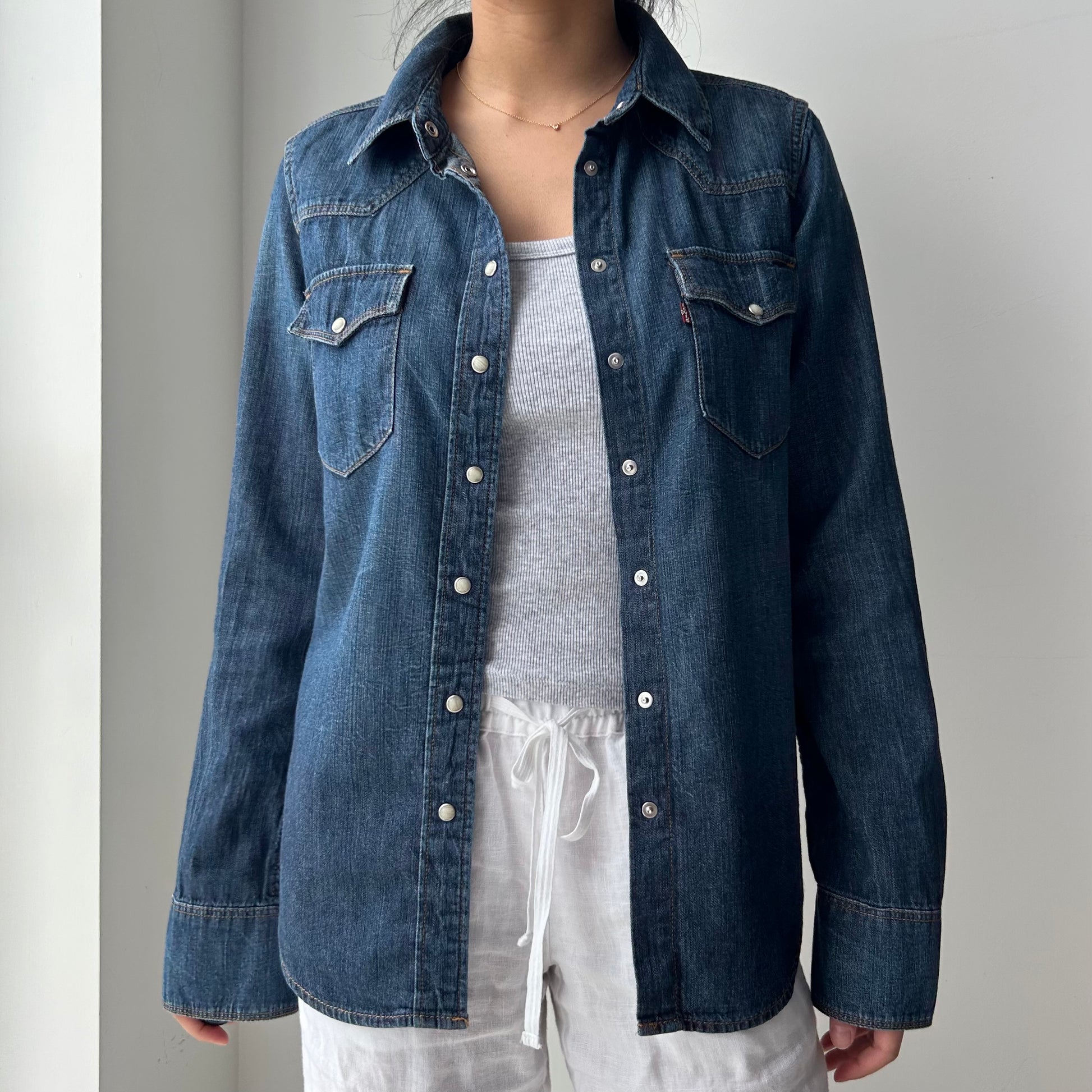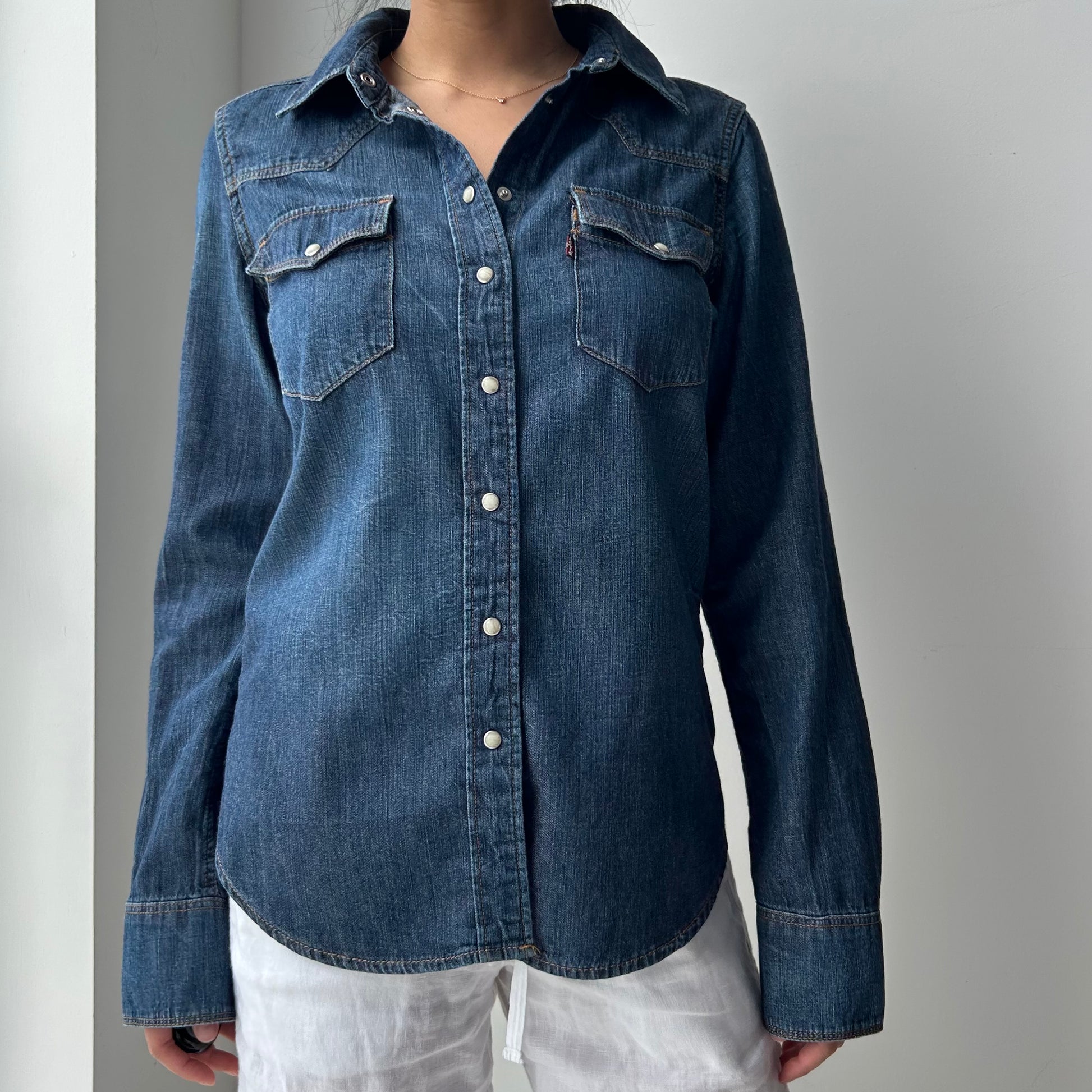 - Details: Long sleeve denim shirt; classic western-style snap front; deep indigo wash; pointed yoke and flap chest pockets; signature red tab detail at pocket