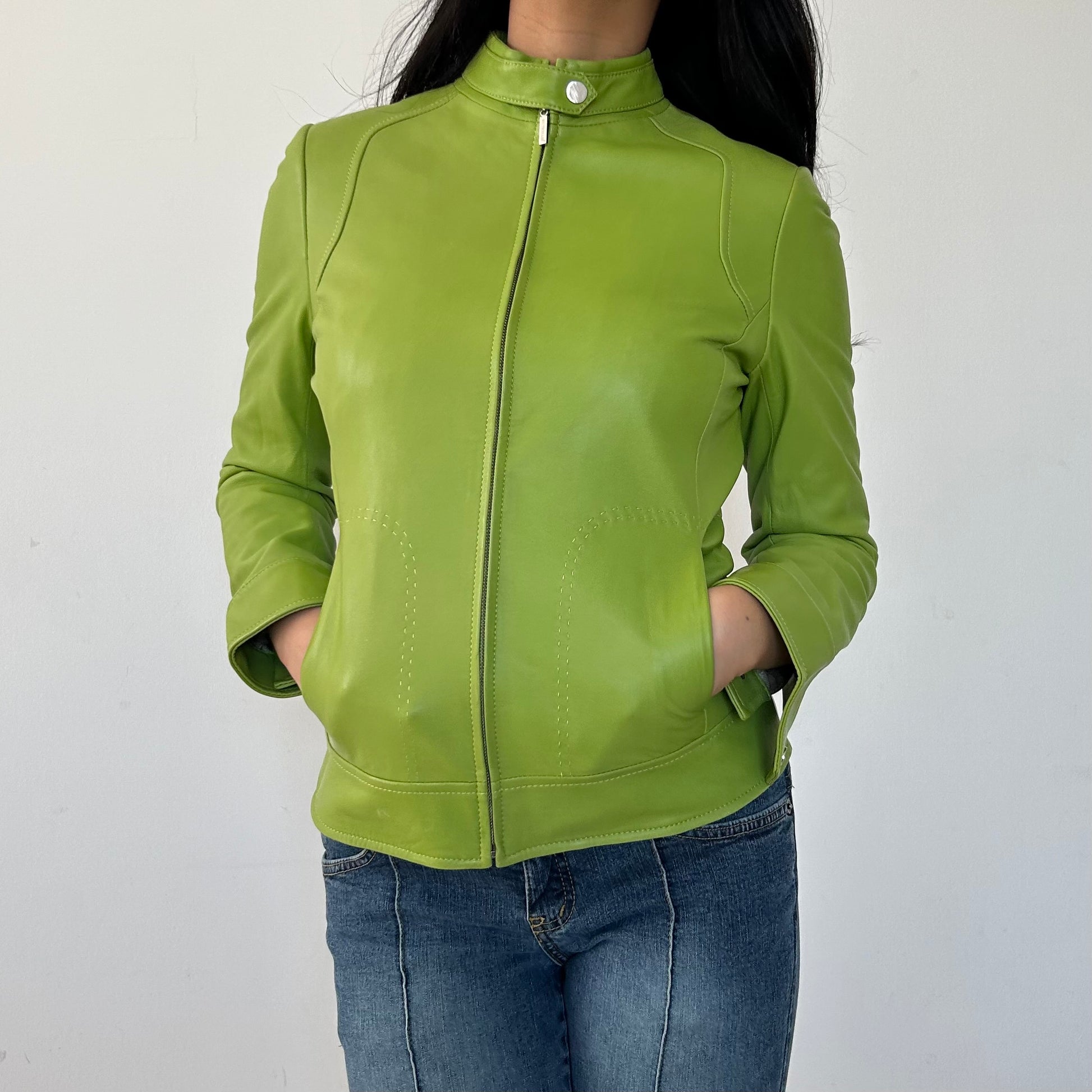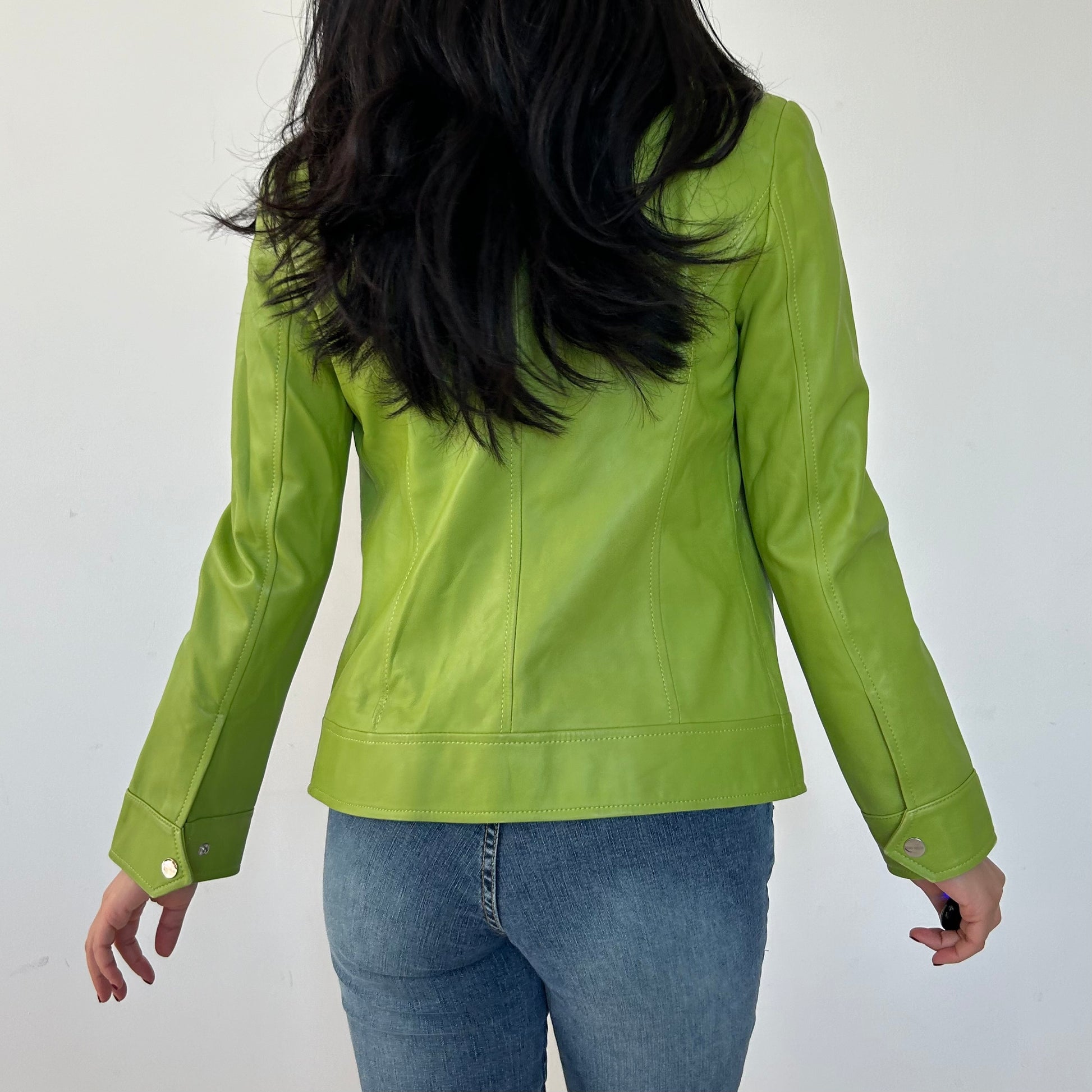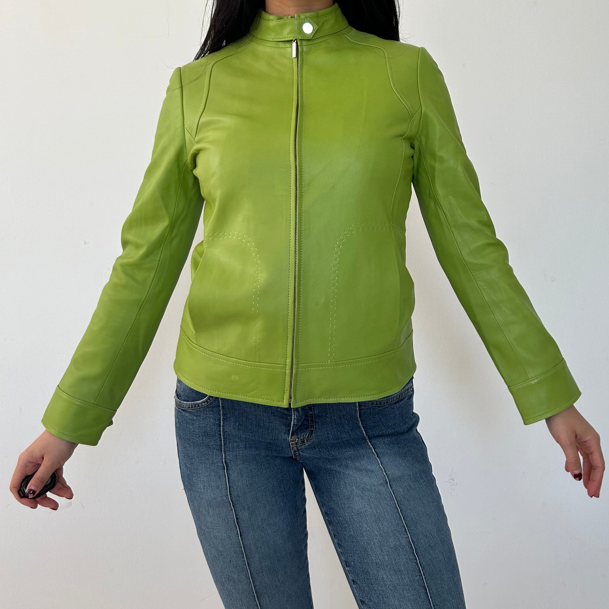 - Details: Lime green lambskin leather racing jacket; super soft leather; press-stud fastening at band collar; full-zip closure; silver-tone hardware