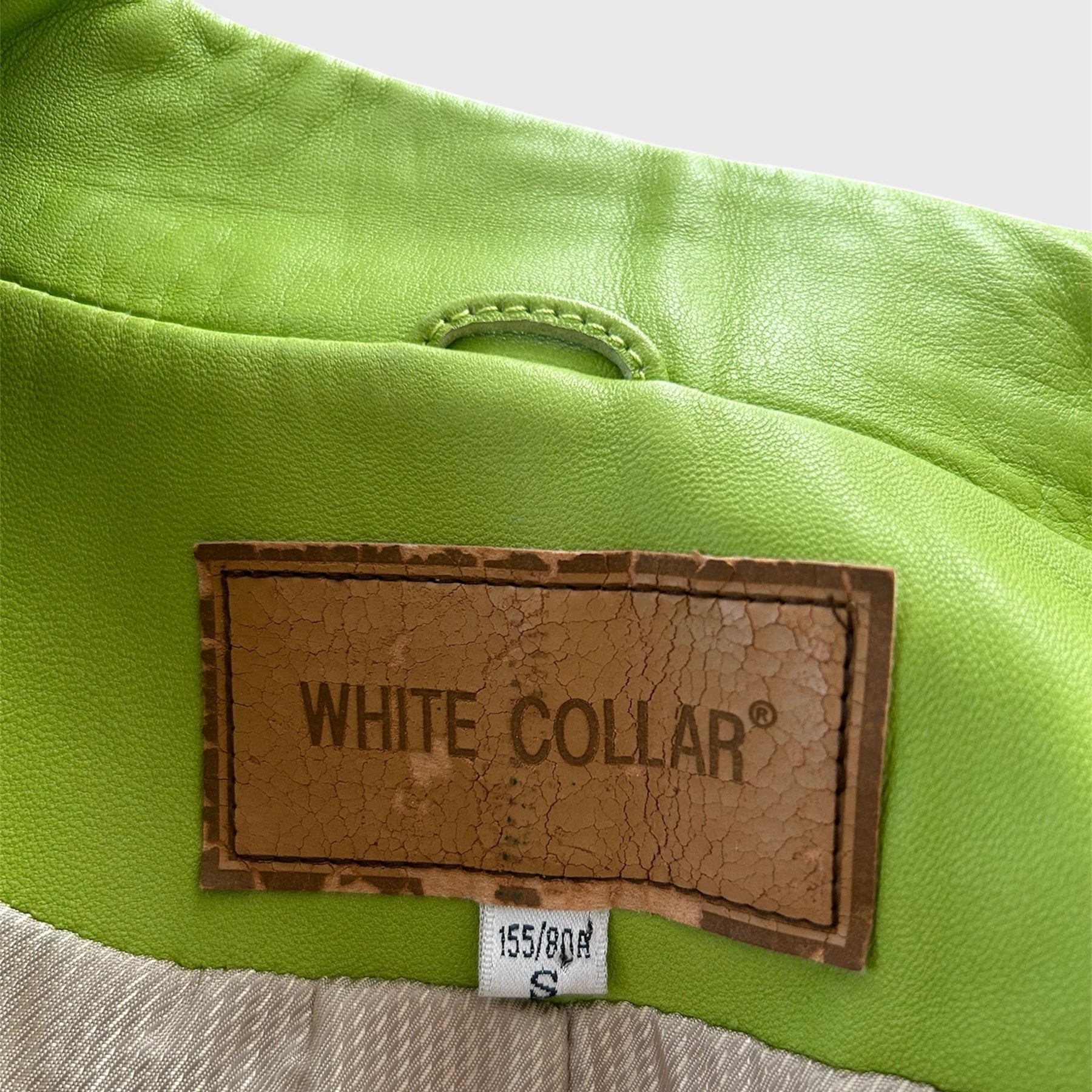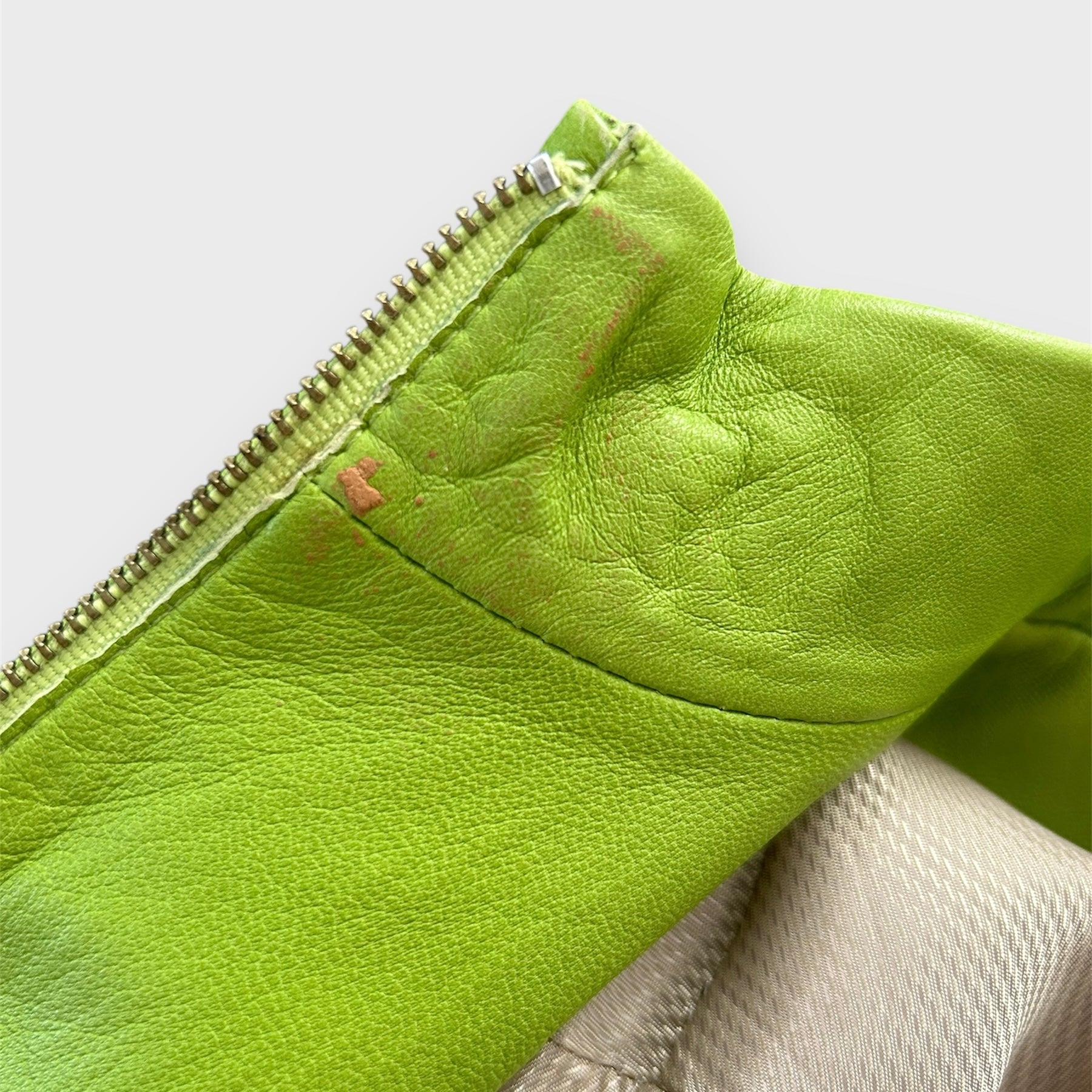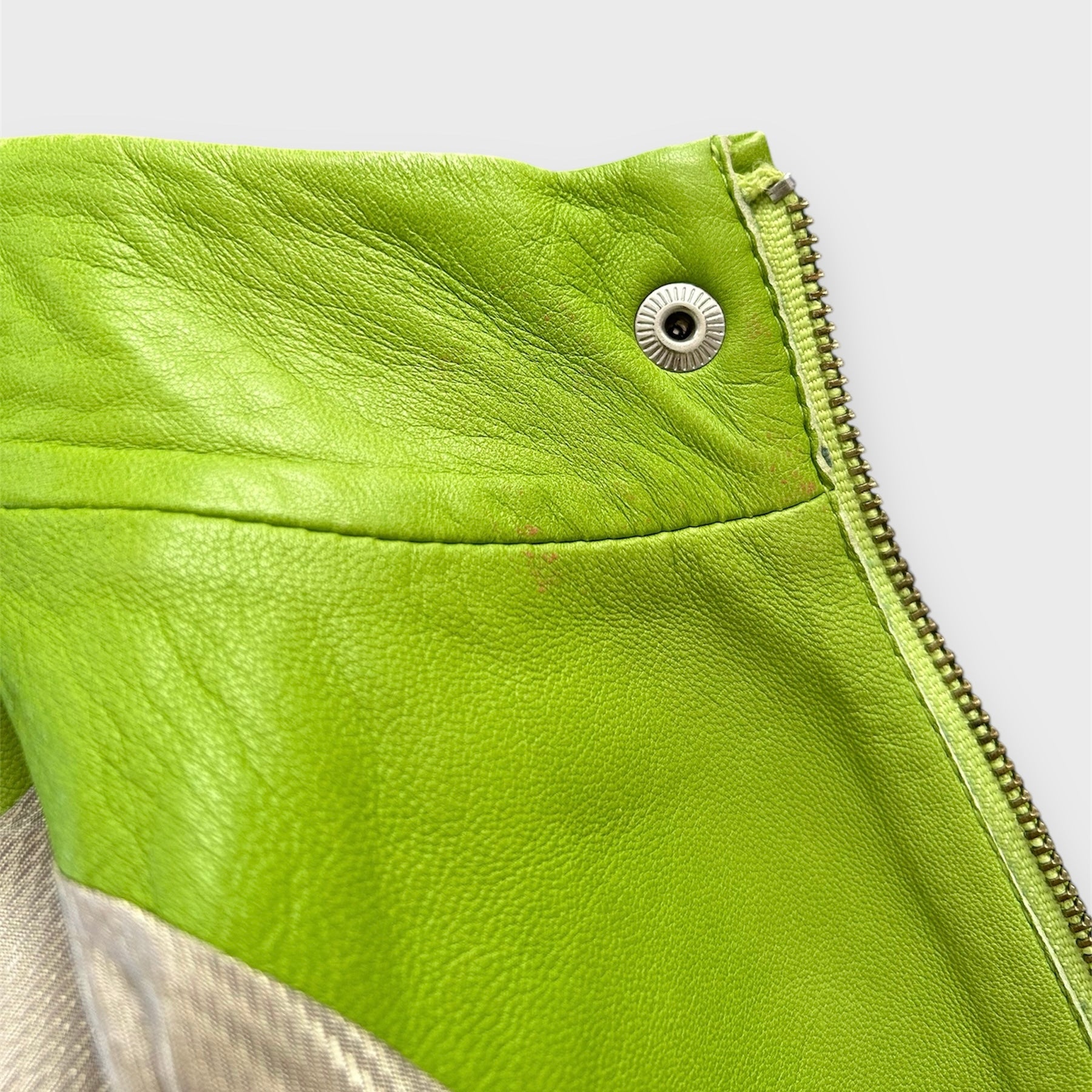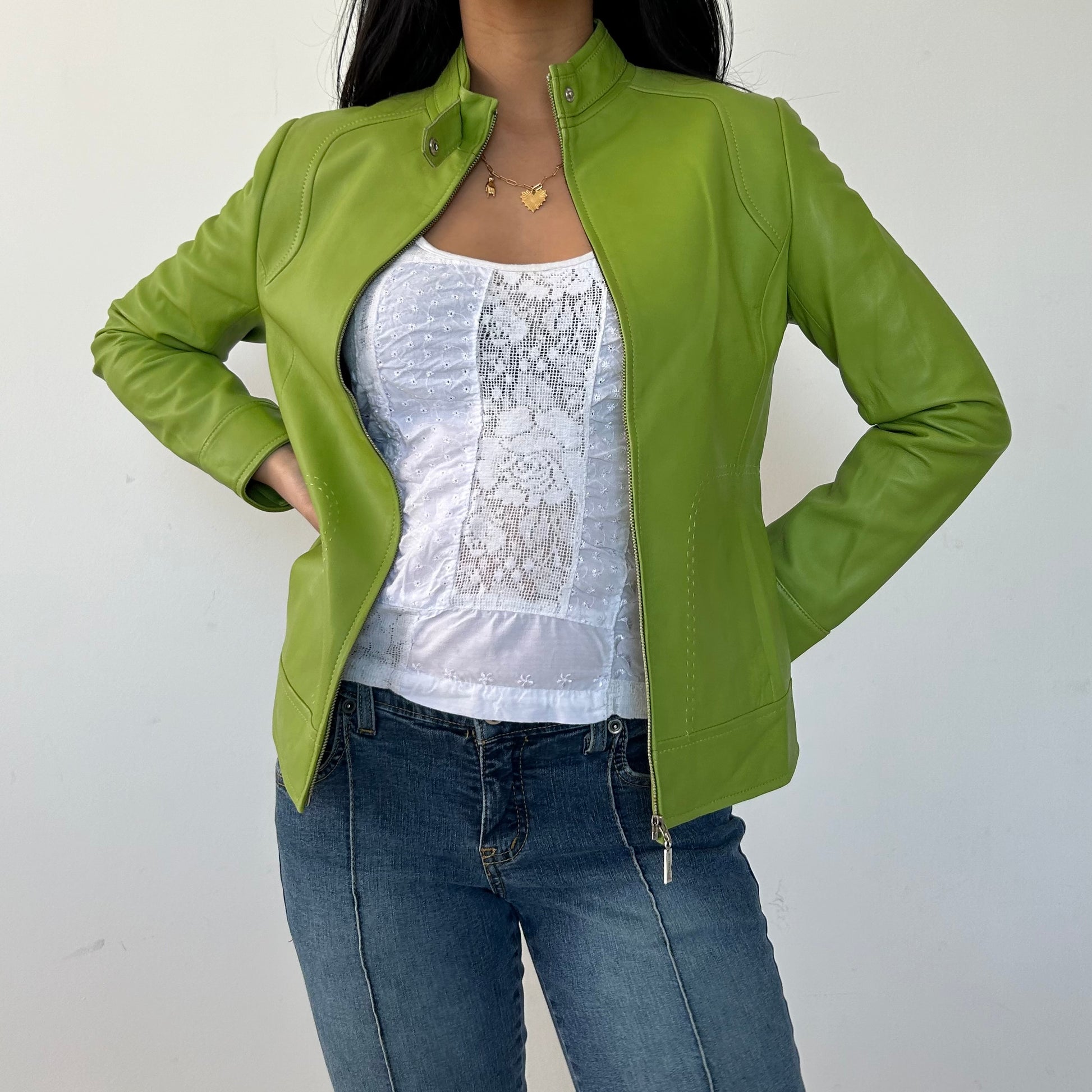 - Details: Lime green lambskin leather racing jacket; super soft leather; press-stud fastening at band collar; full-zip closure; silver-tone hardware