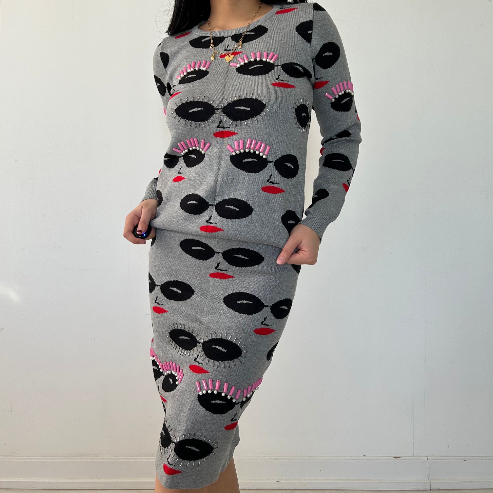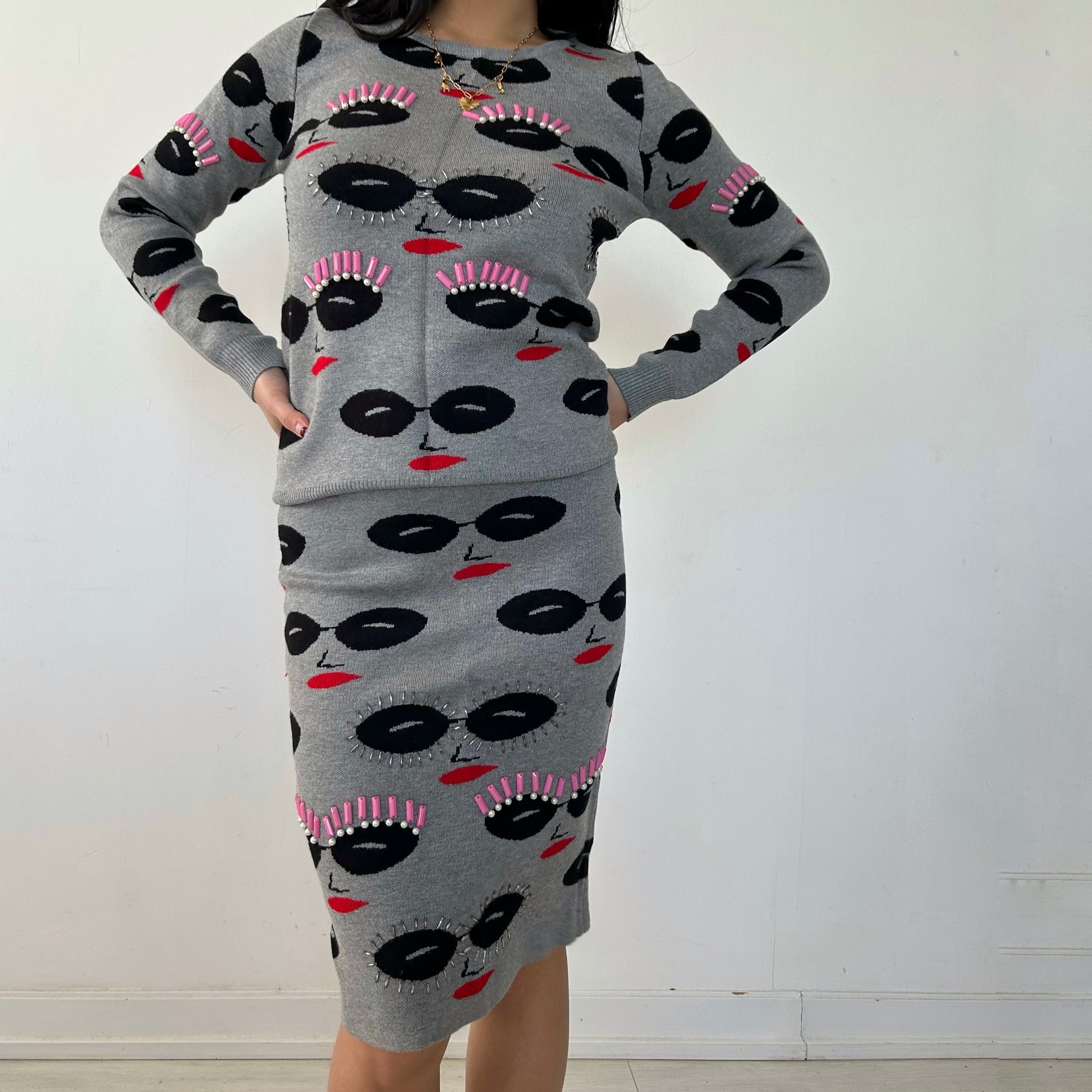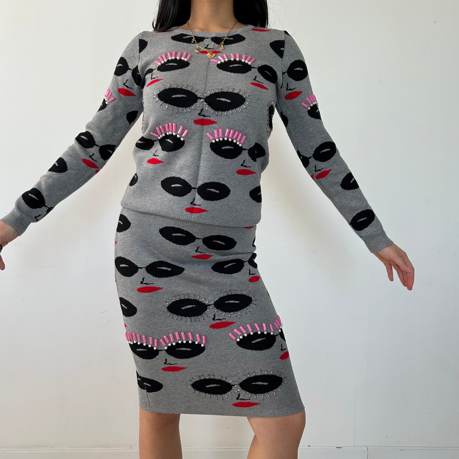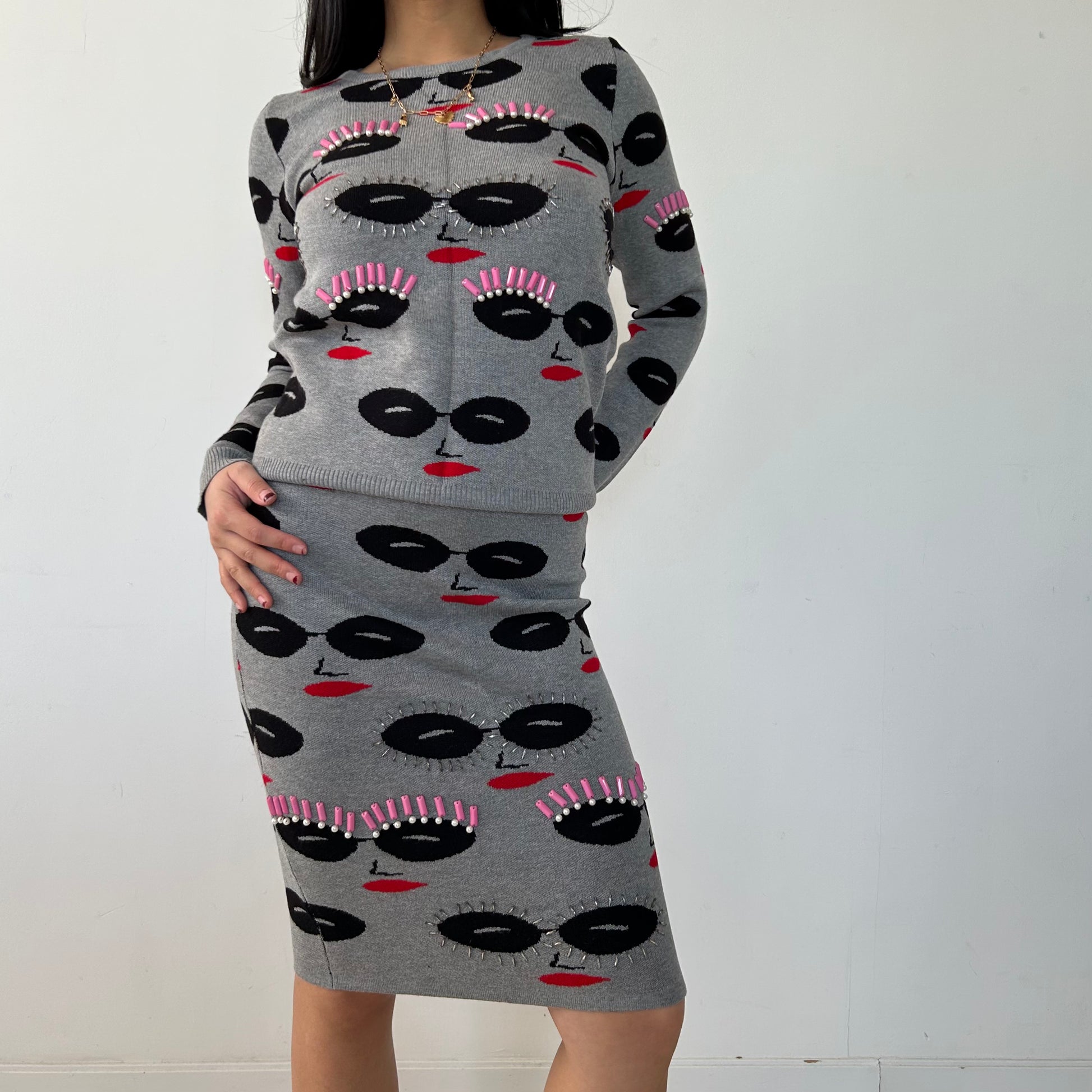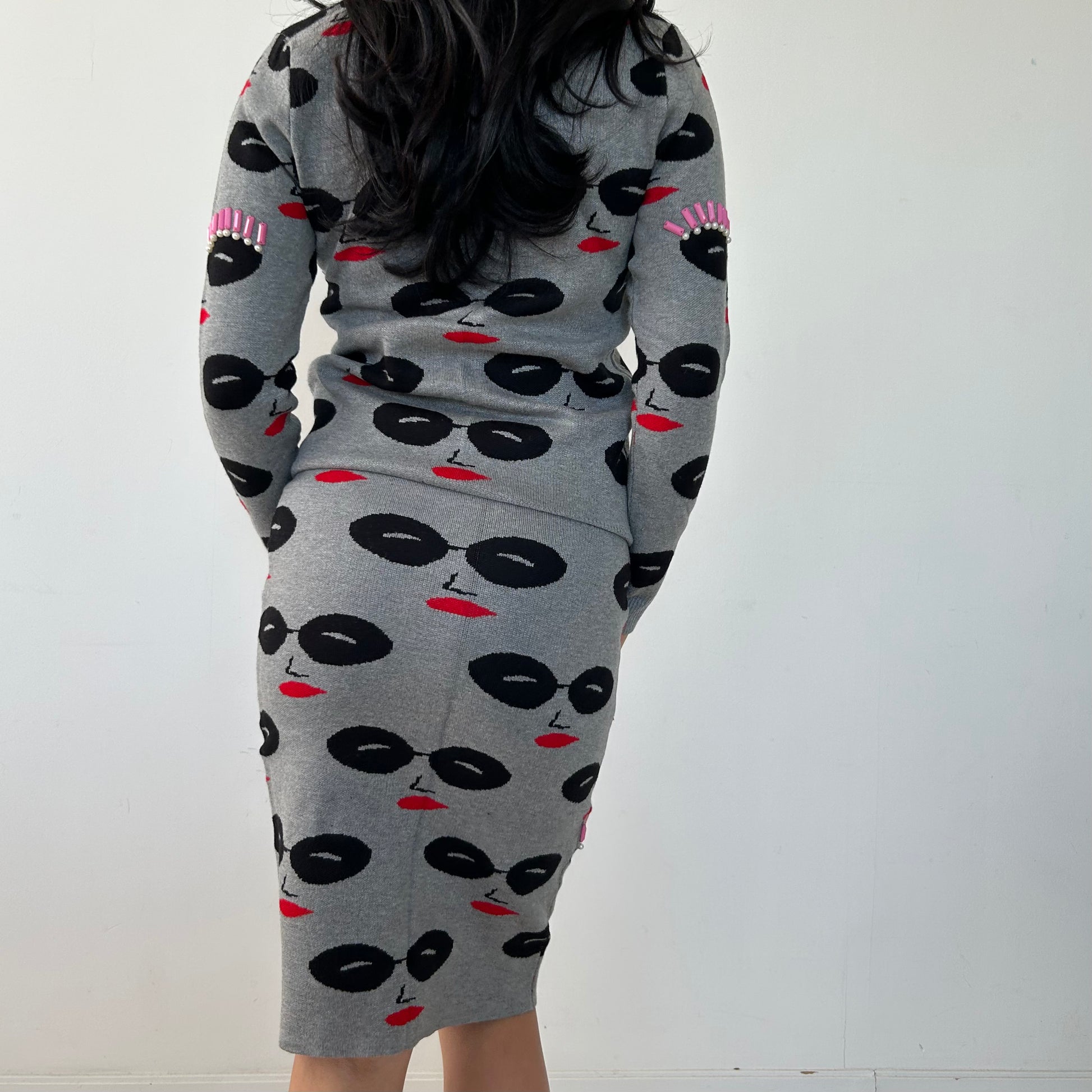 Details: Matching knit set featuring a crewneck jumper and a pencil skirt; soft grey stretch knit fabric; graphic face motif with bold black sunglasses, pink lash detailing and red lips; rib knit trims; fitted silhouette