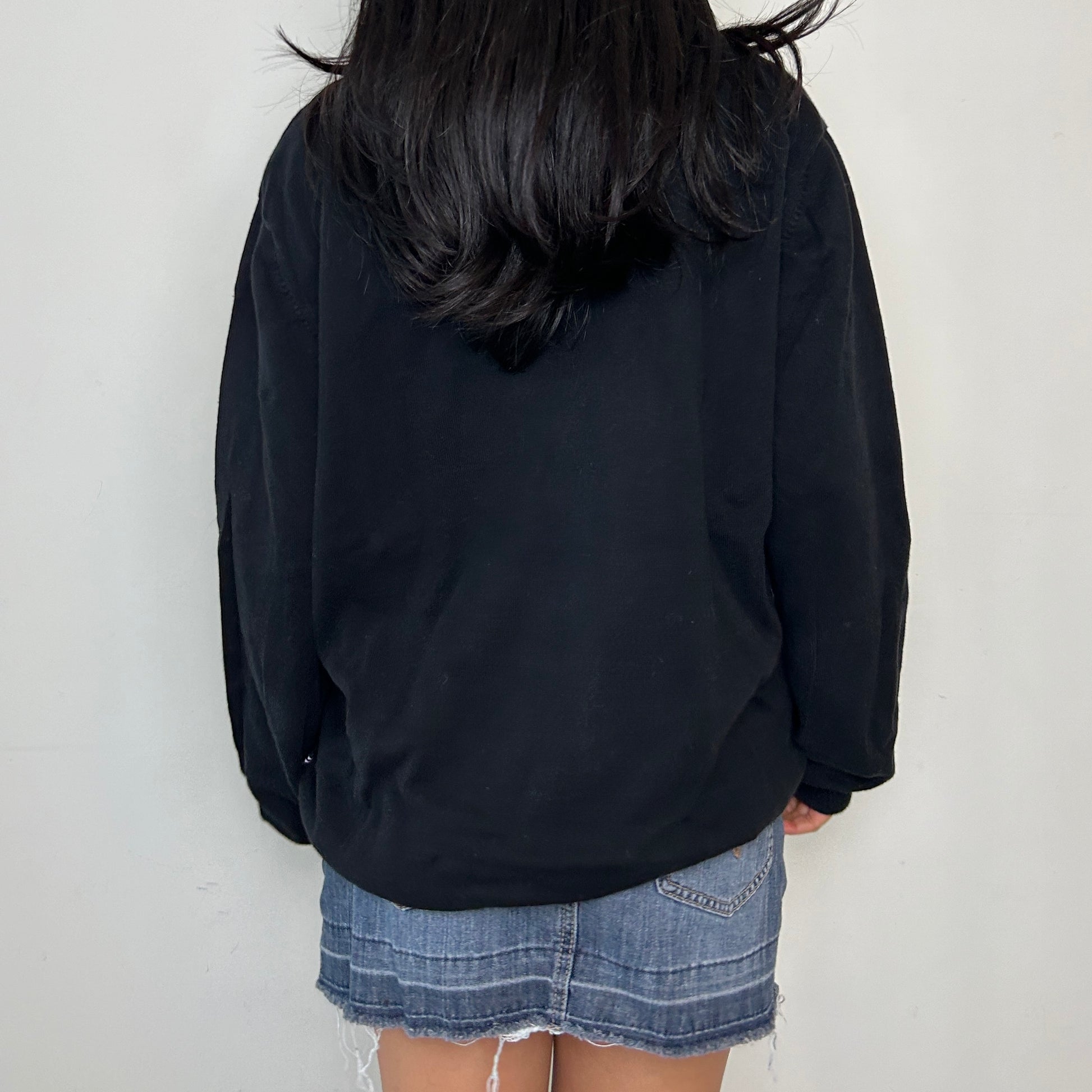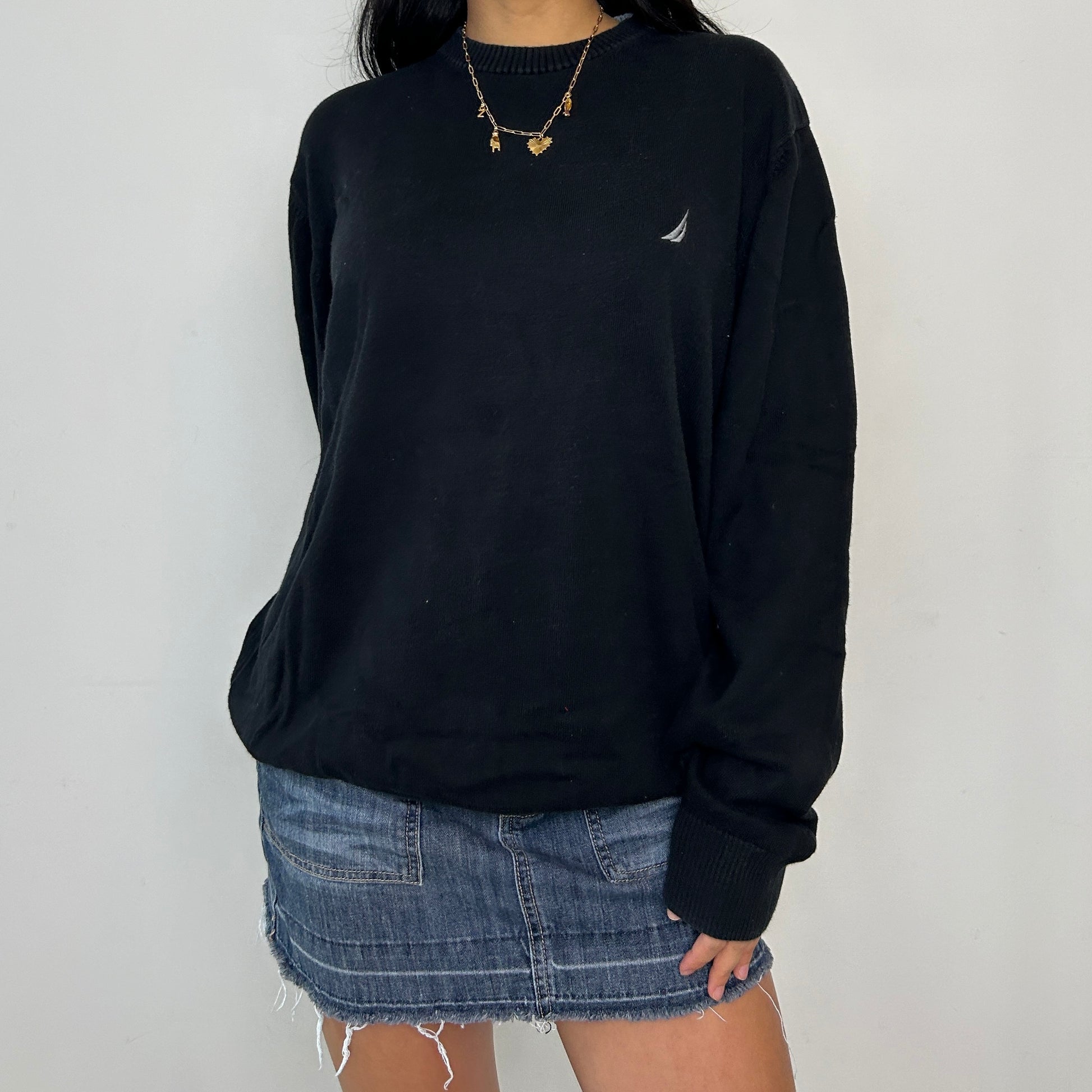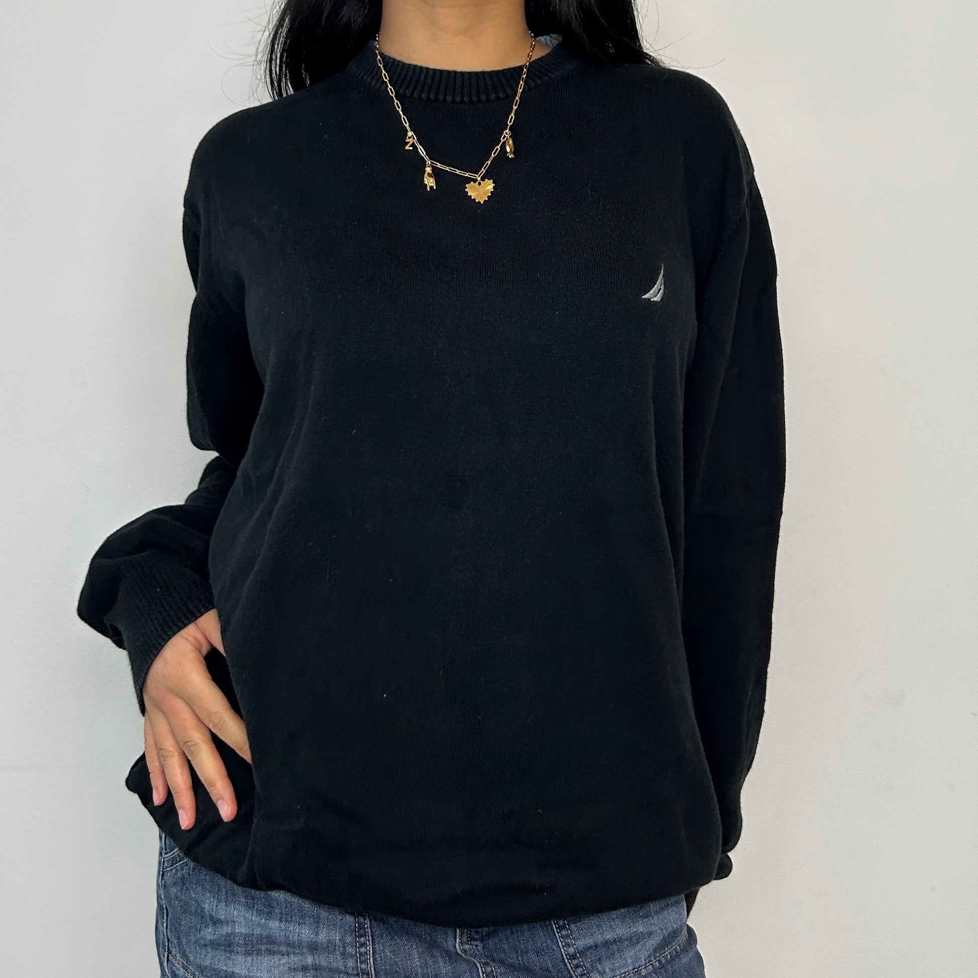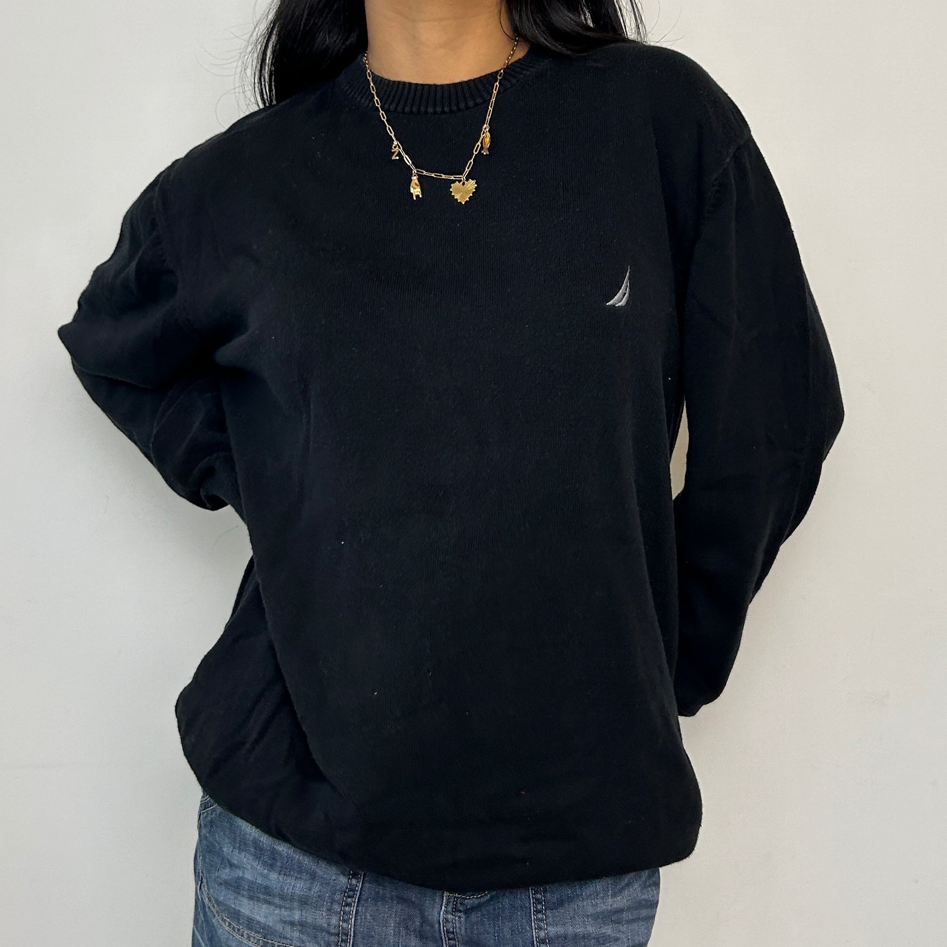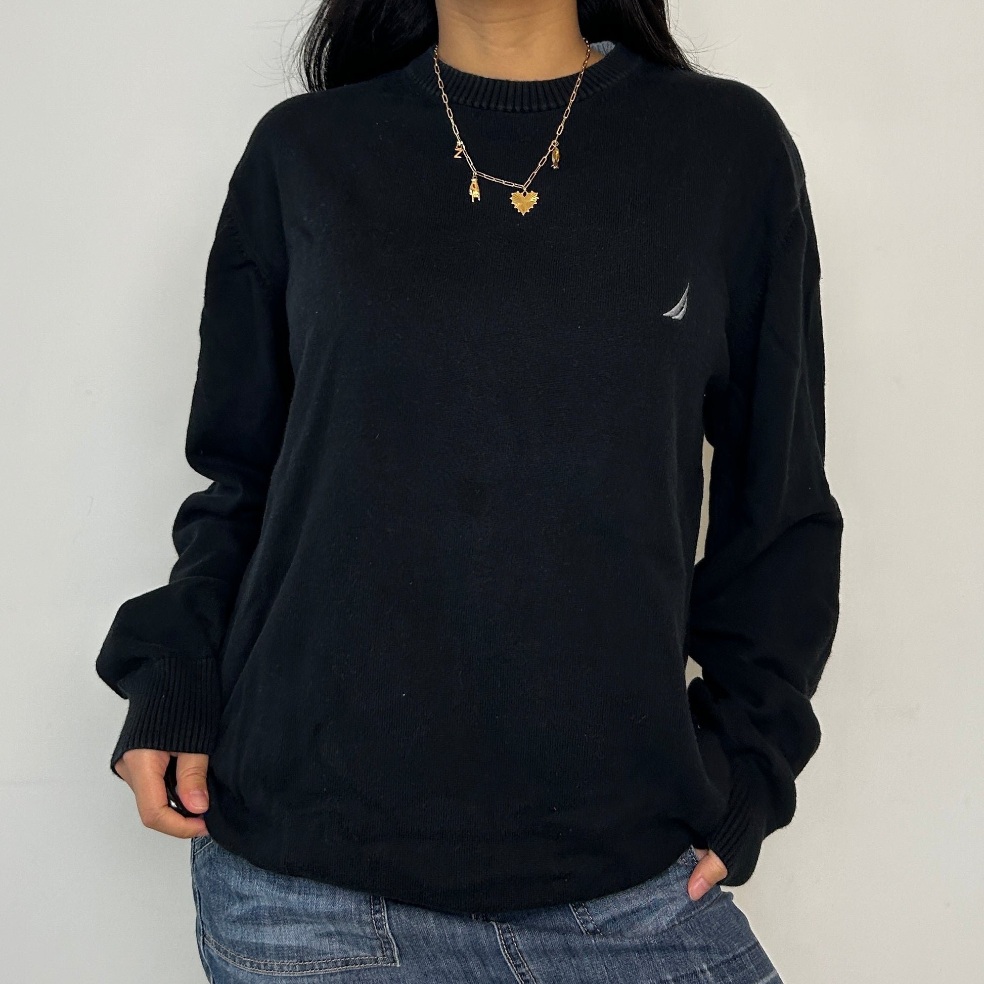 - Details: Black crewneck knit jumper; long sleeves; ribbed neck and hem; Nautica embroidered logo on the left chest