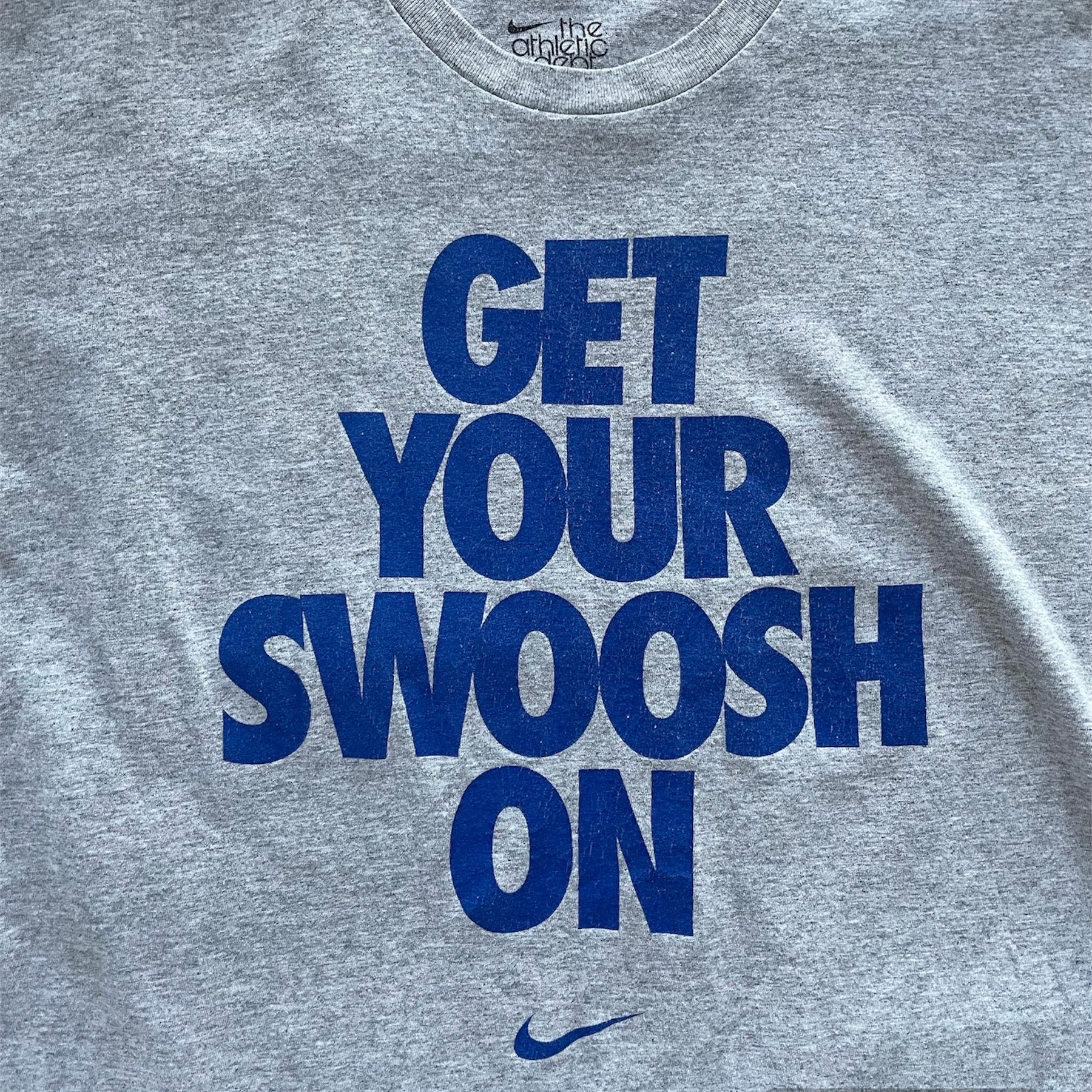 - Details: Regular fit; grey tee with 'Get Your Swoosh On' text in blue