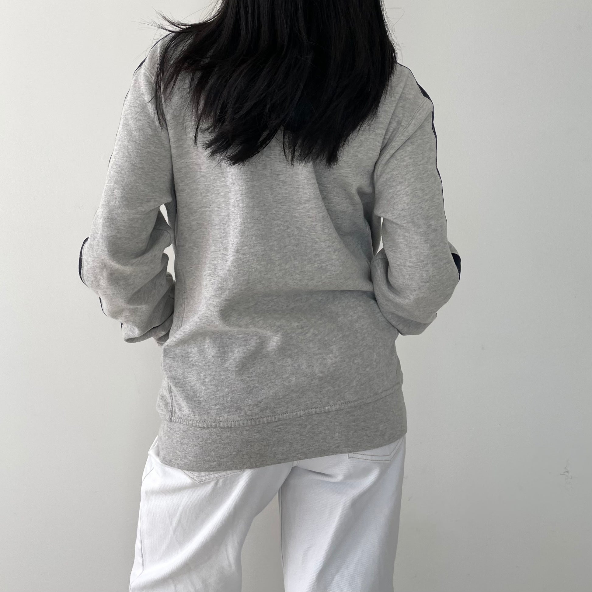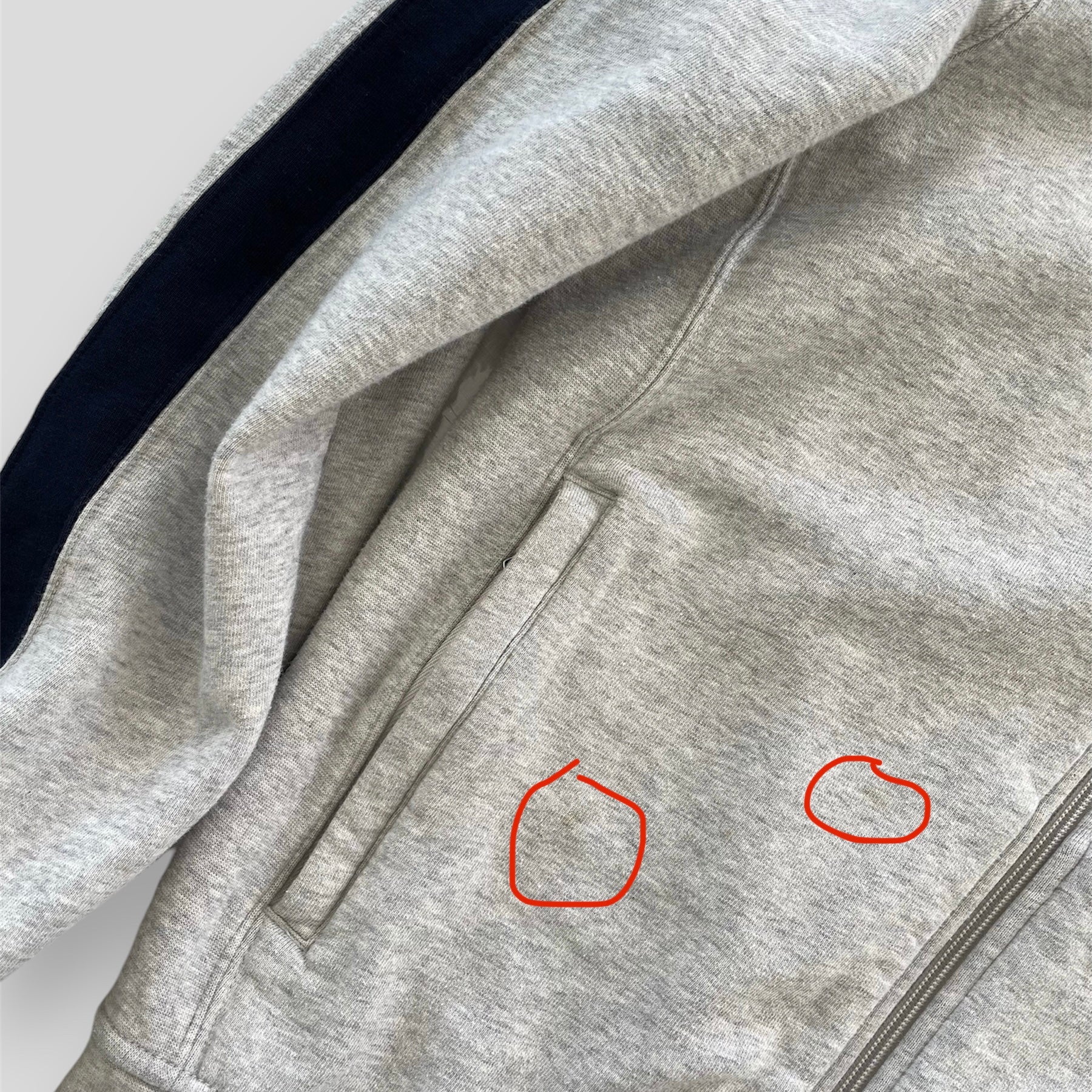 - Details: Grey zip up jacket with navy side stripes; navy horse embroidered logo on the left chest