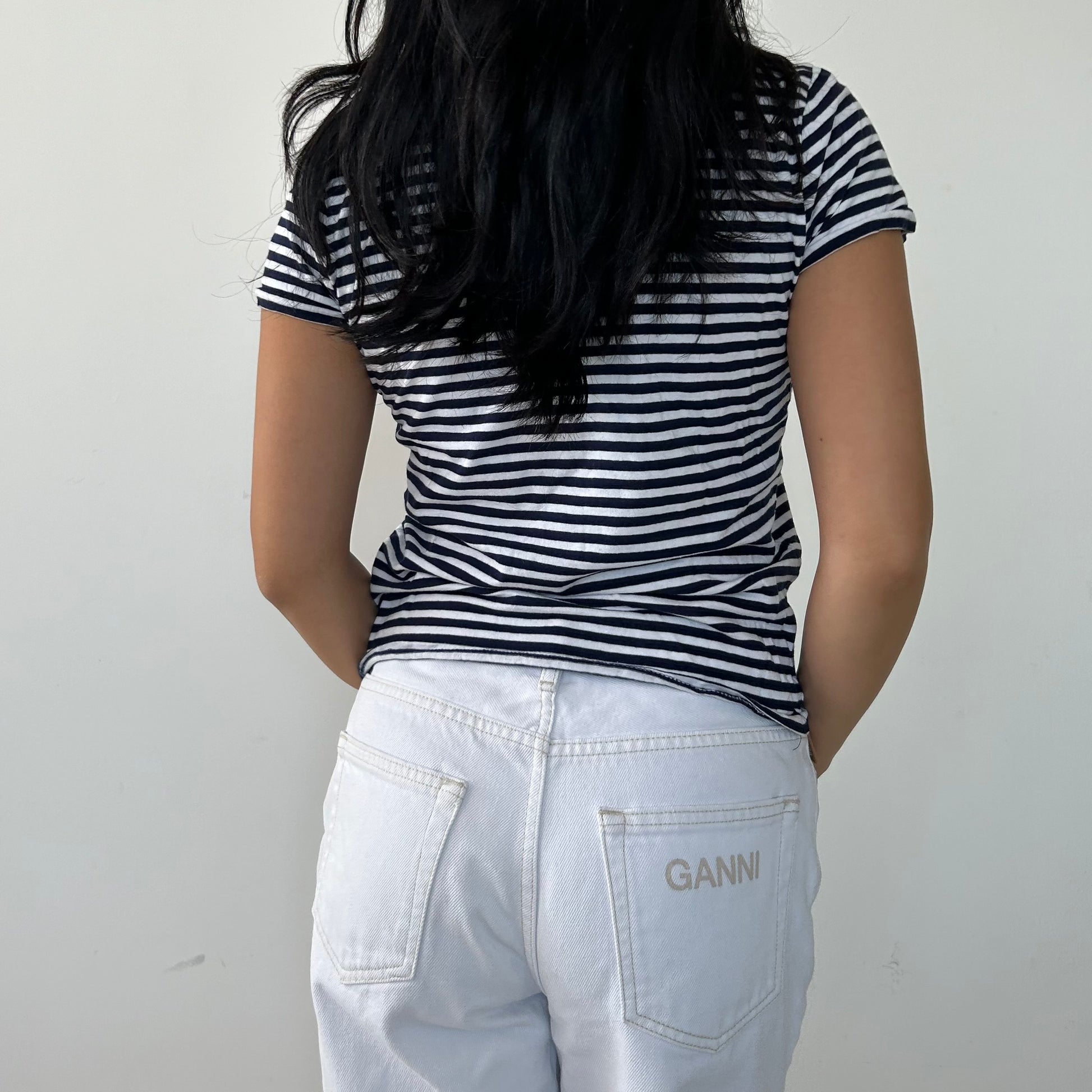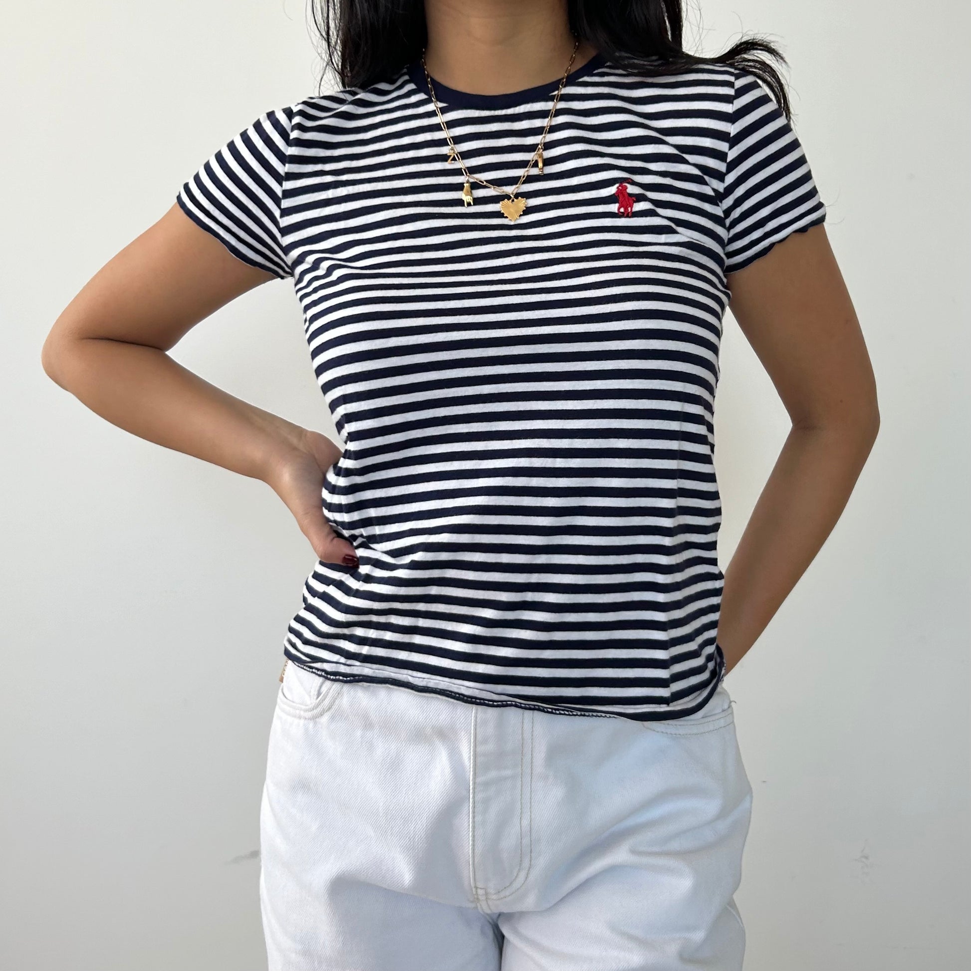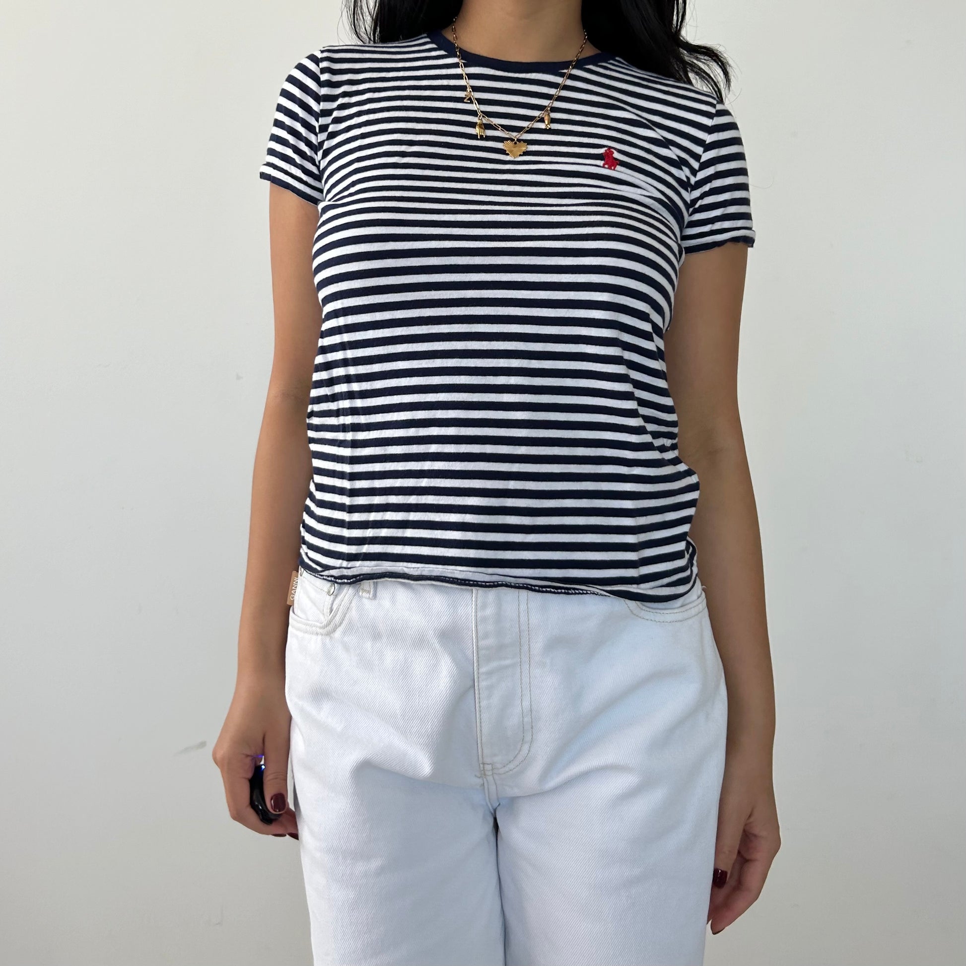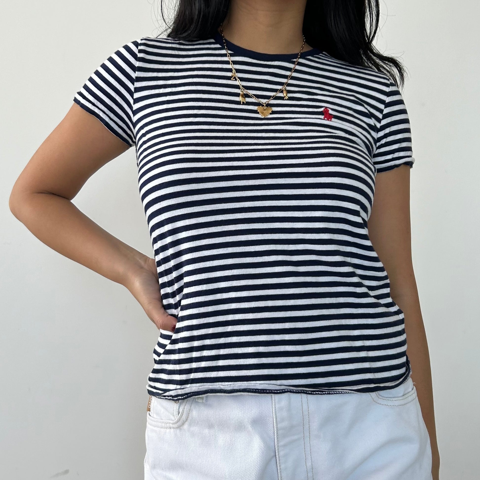 Details: Navy and white striped short sleeve tee; signature Pony embroidery at the left chest