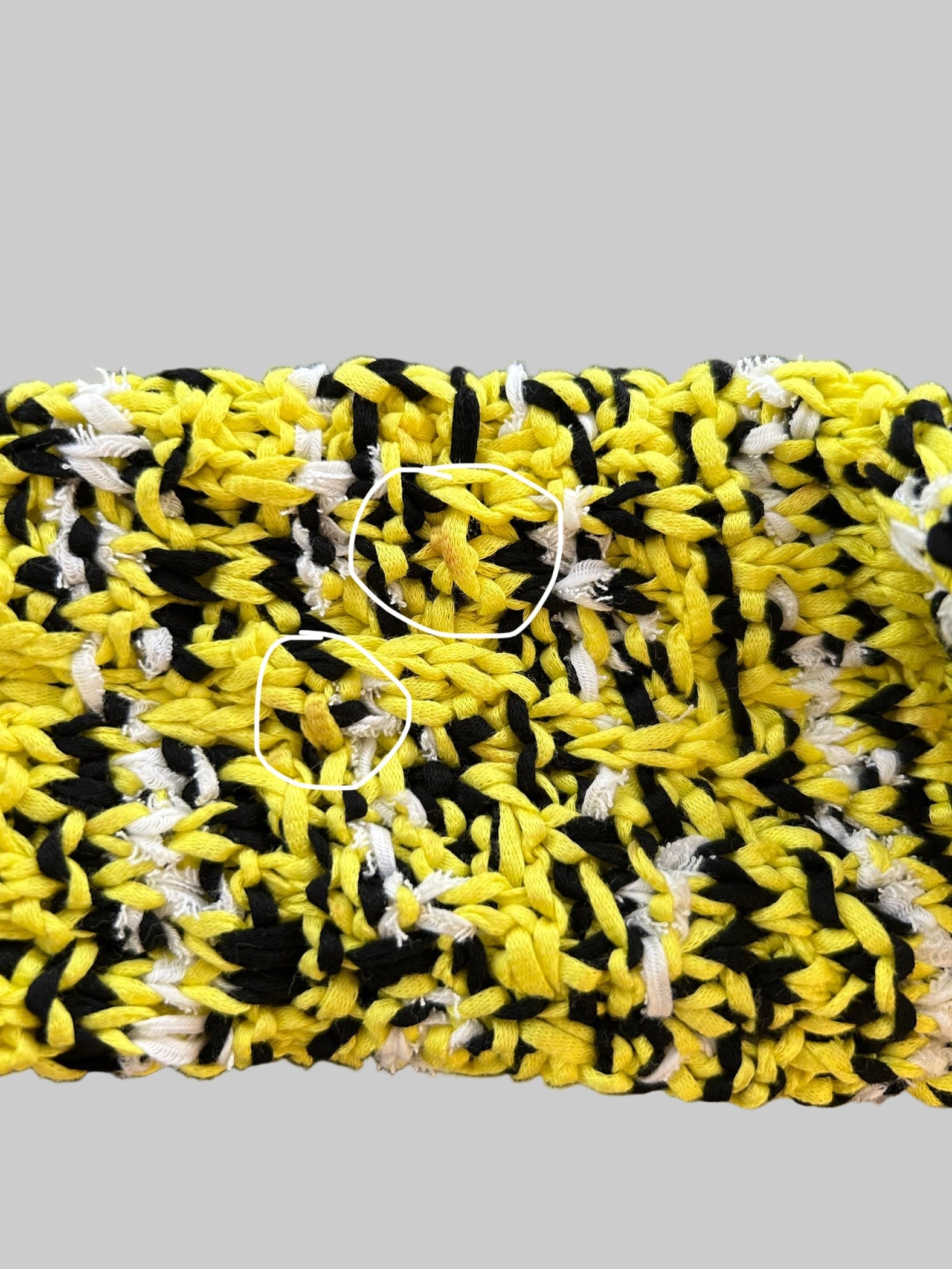 - Details: Chunky marled knit in yellow, black, and white; contrast rib trims at cuffs, hem, and placket; deep V-neck with oversized buttons; front patch pockets
