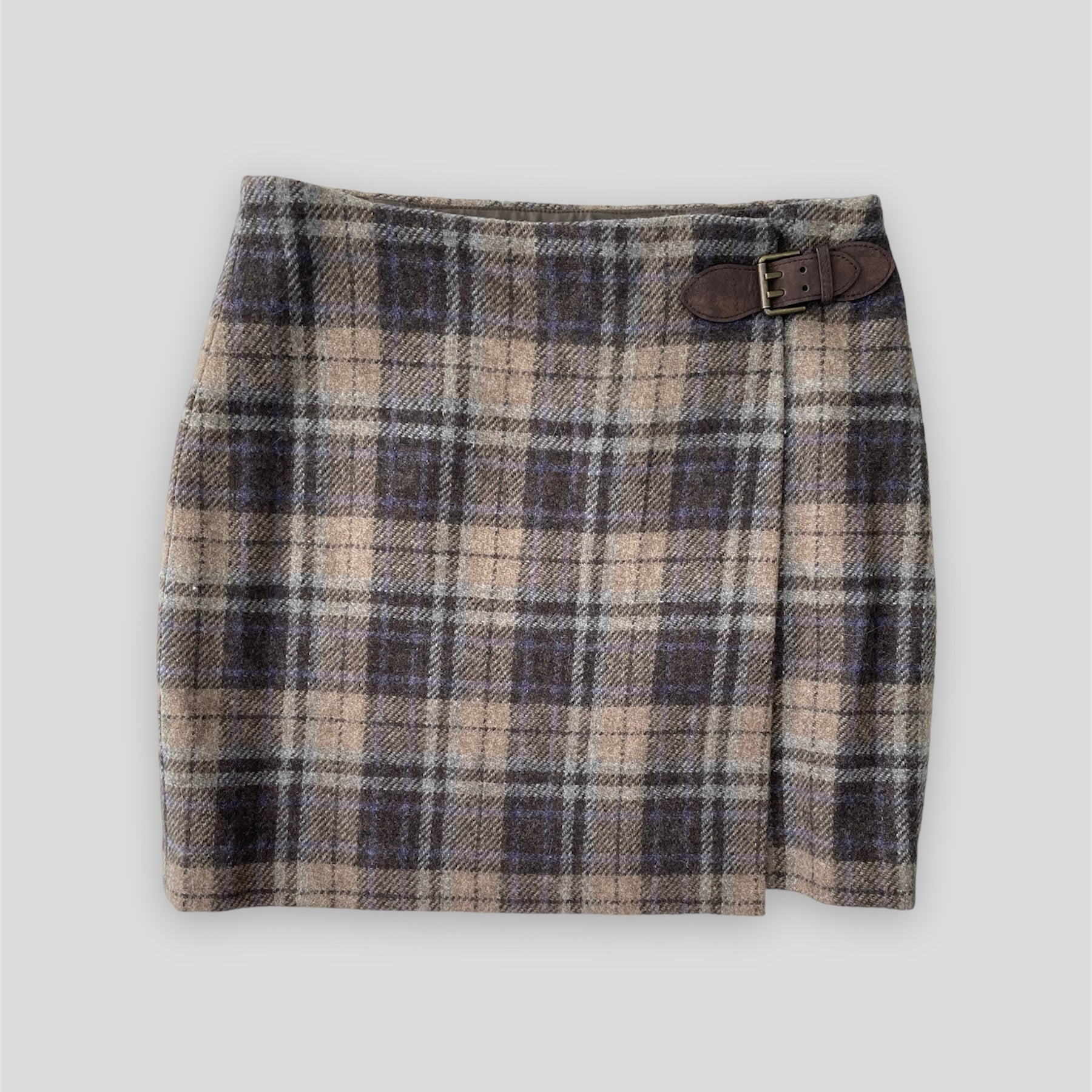- Details: Brown and purple tartan wool wrap mini skirt; buckle detail on the side