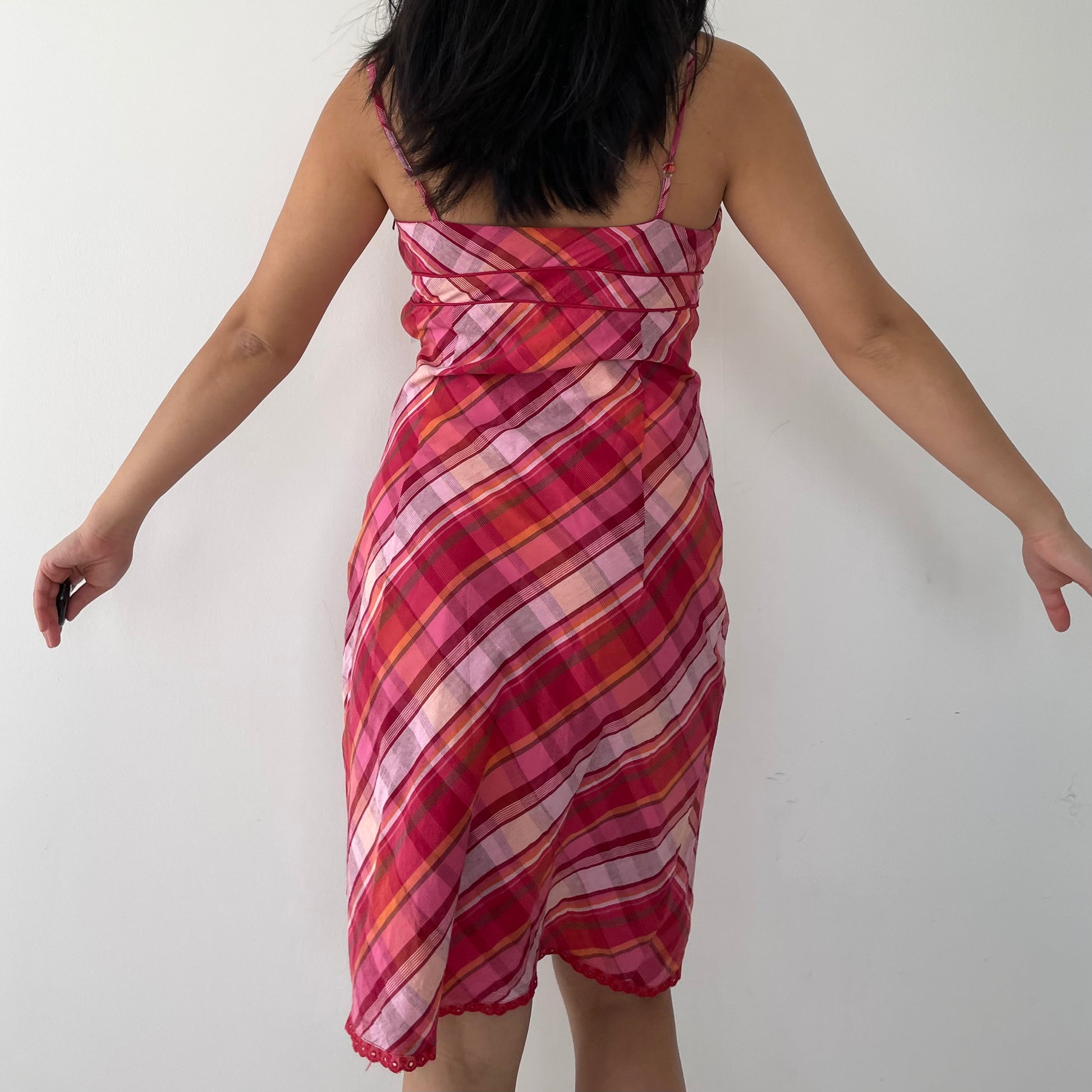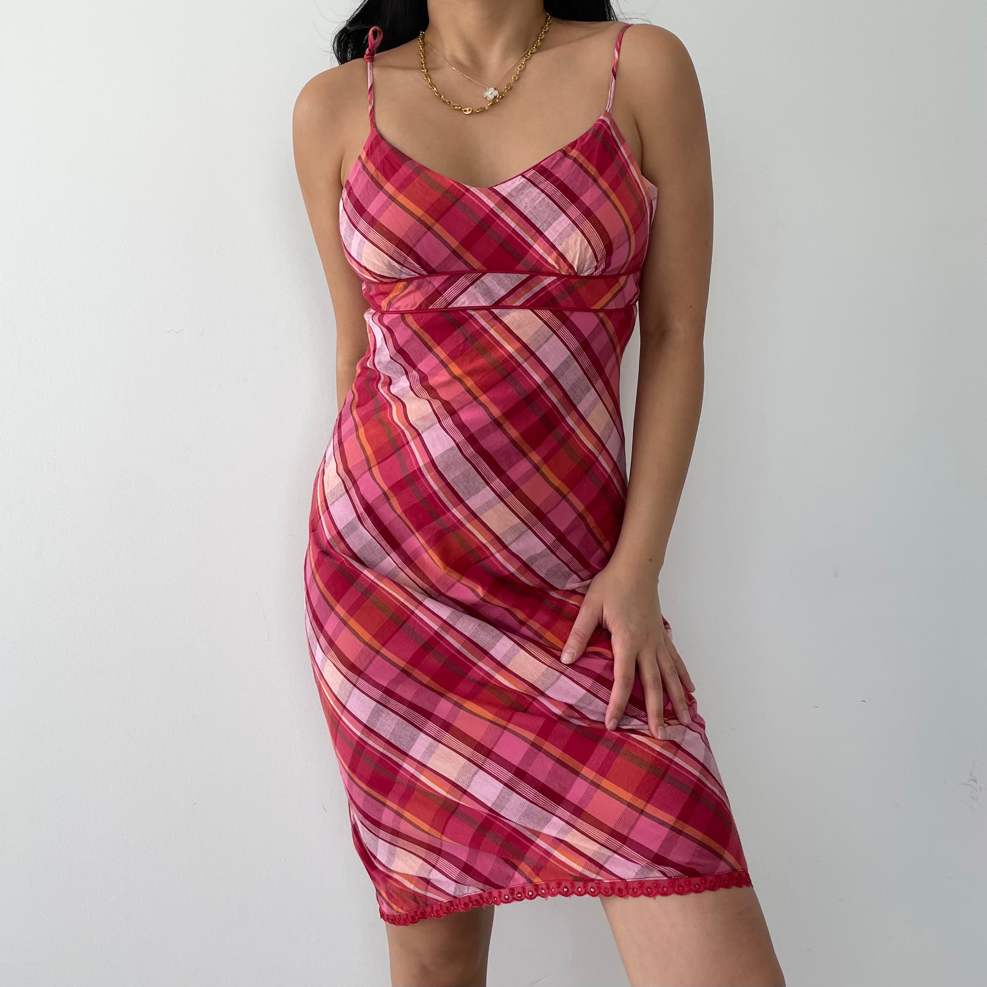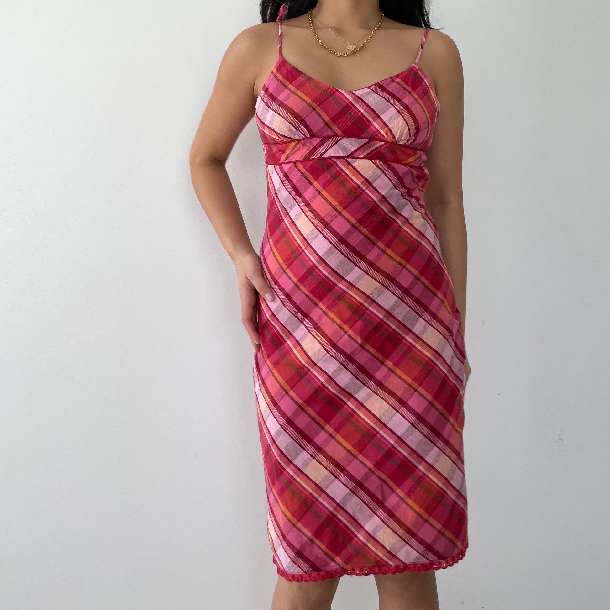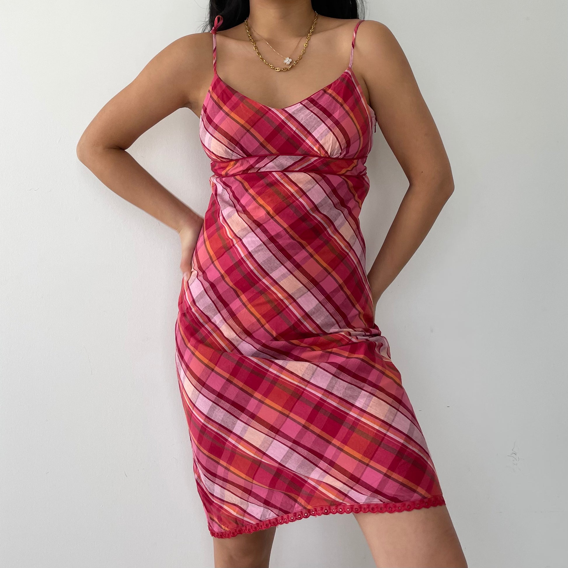 - Details: Double lined; adjustable straps; red and pink plaid sundress; concealed back zip; broderie anglaise eyelet trim on the skirt