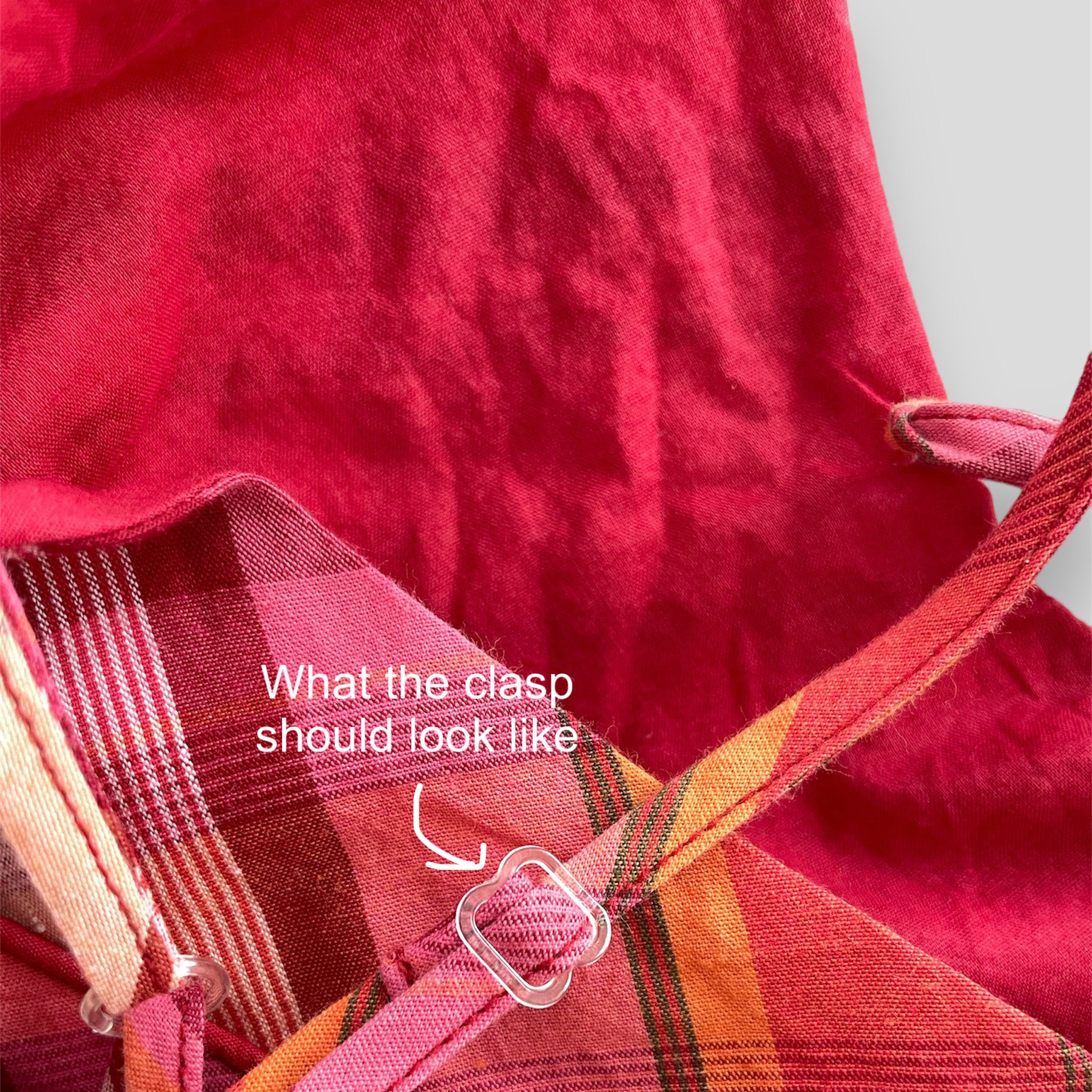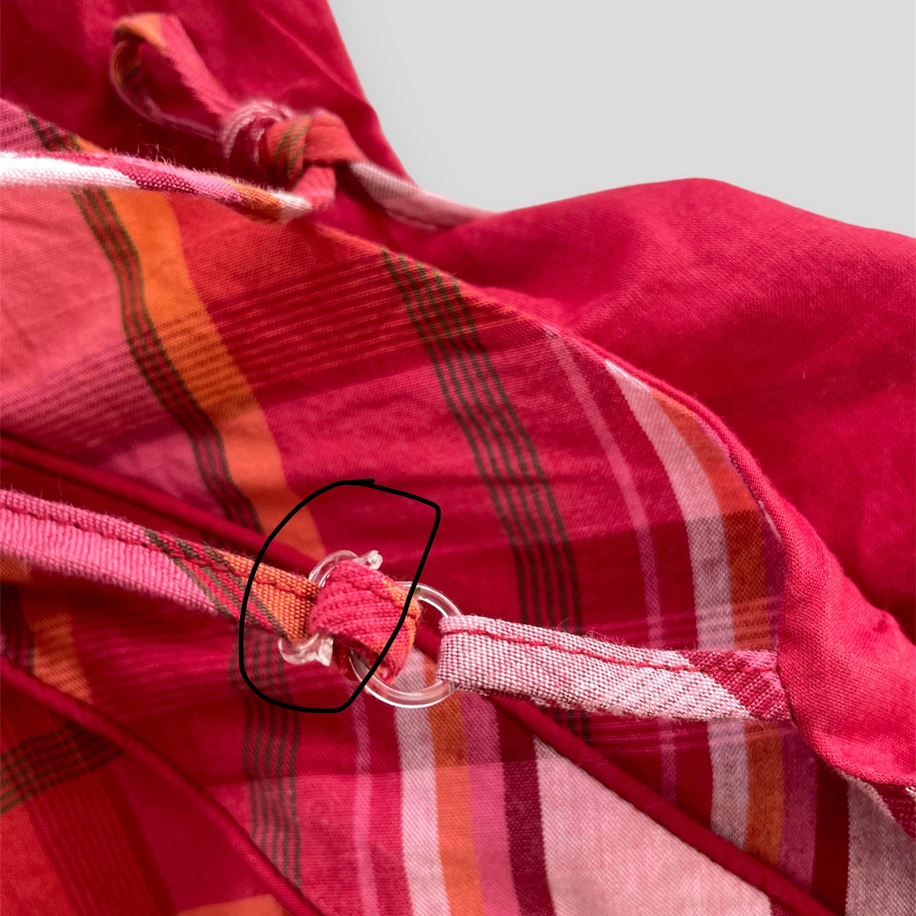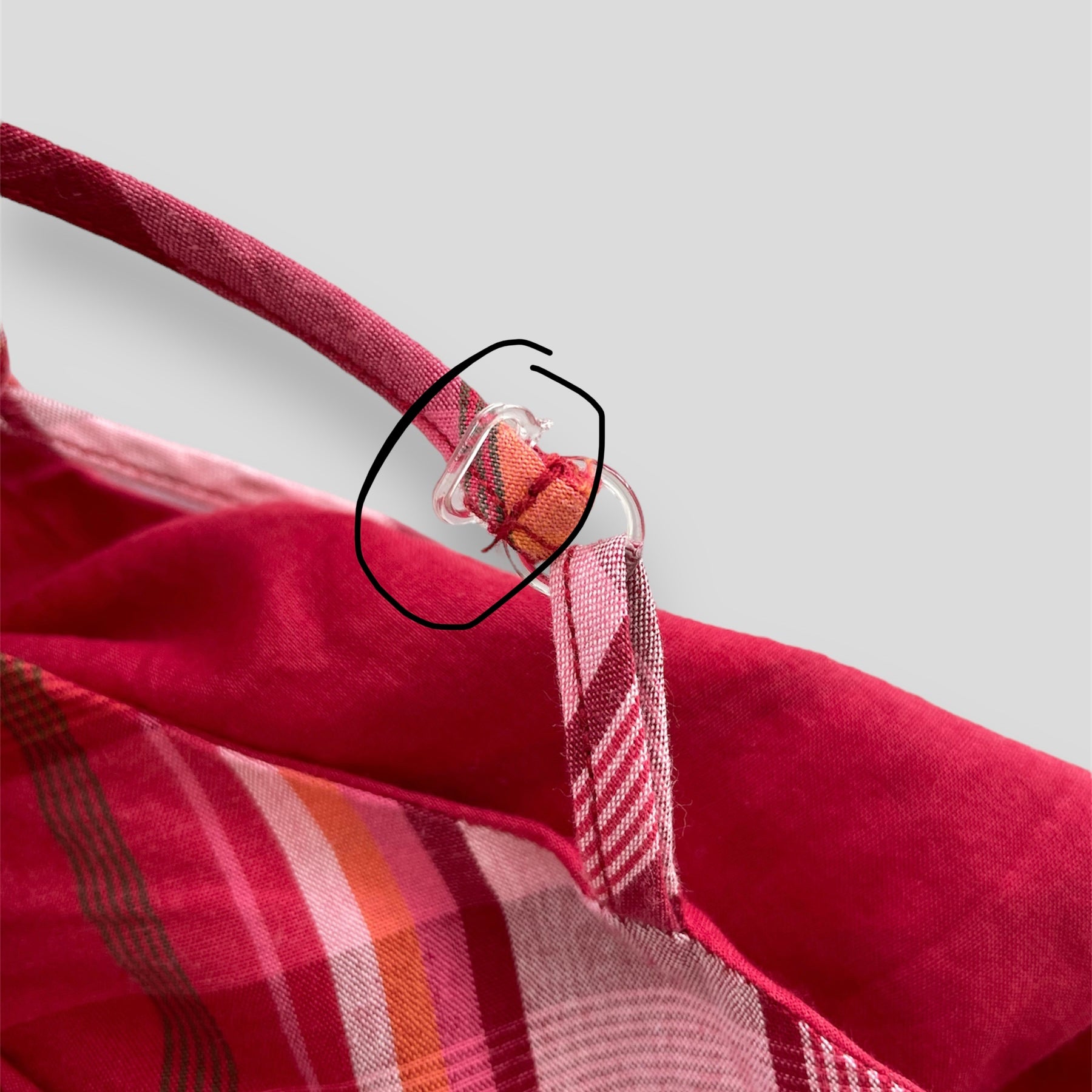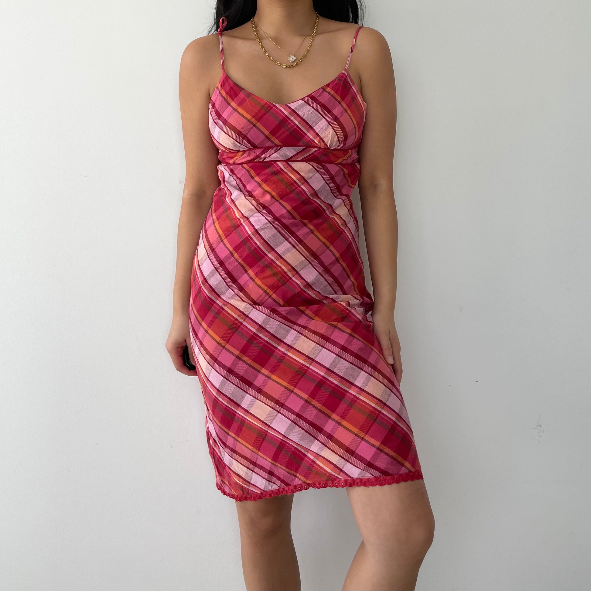 - Details: Double lined; adjustable straps; red and pink plaid sundress; concealed back zip; broderie anglaise eyelet trim on the skirt