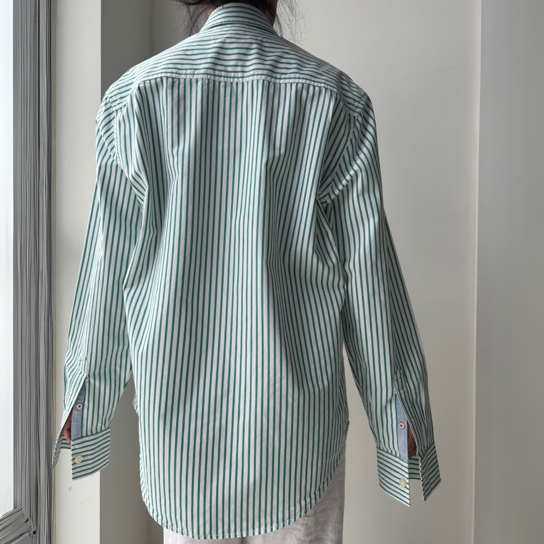 - Details: Thick heavyweight cotton; green and white striped button up shirt; white patch pocket with logo