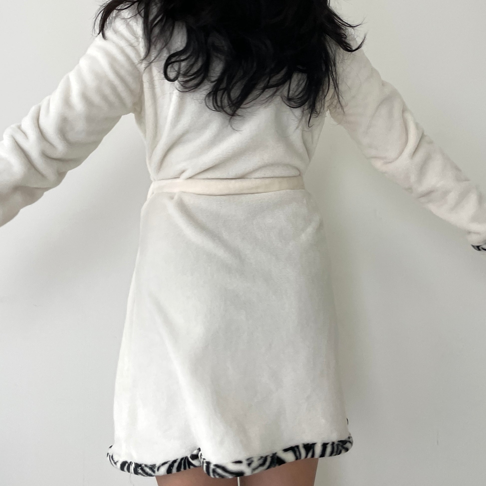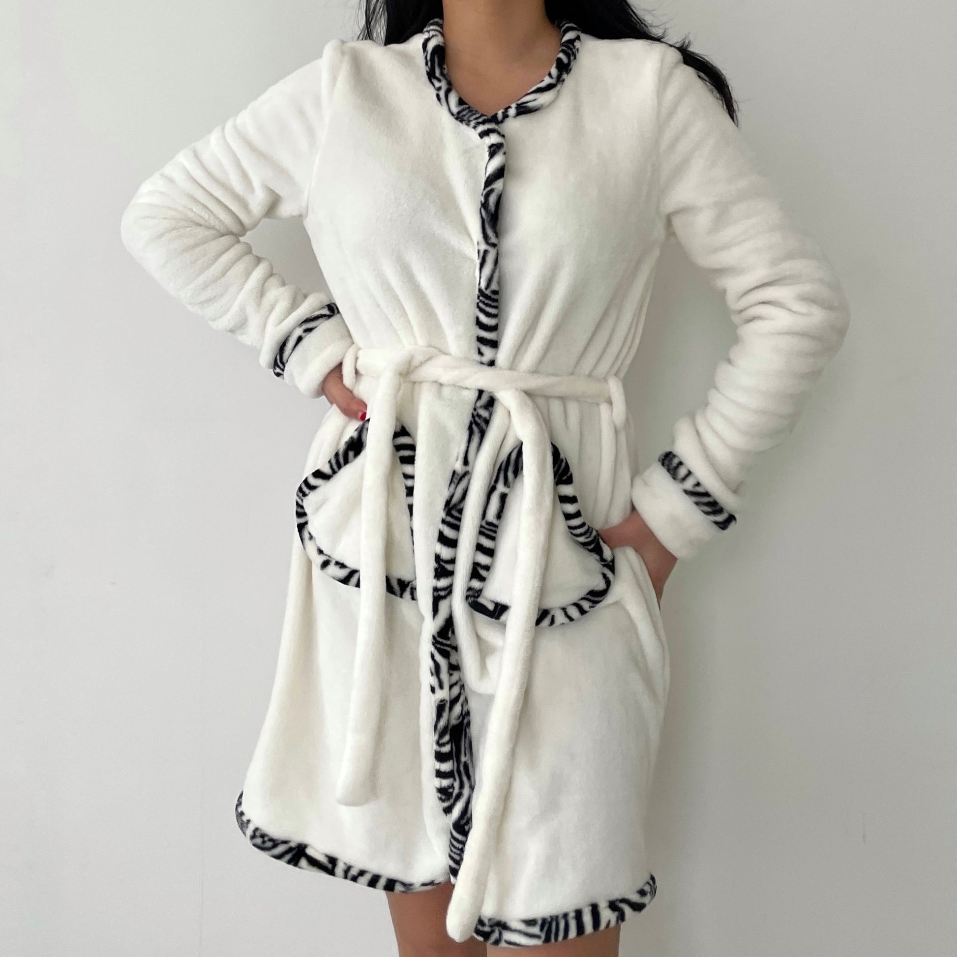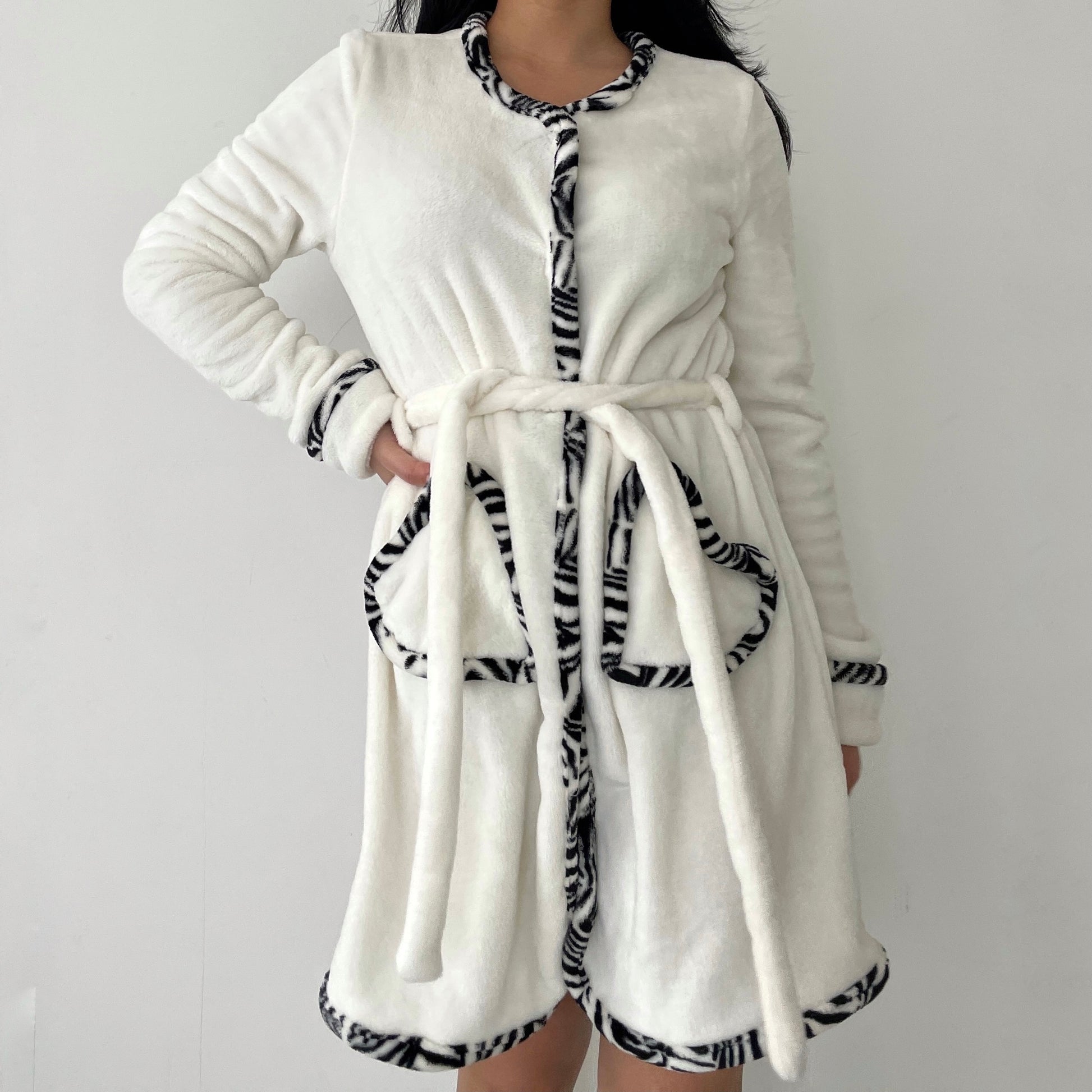- Details: White round neck soft fluffy dressing gown with zebra print trim; round collar; tie waist; snap button closures; double front pockets; faux rolled up sleeves